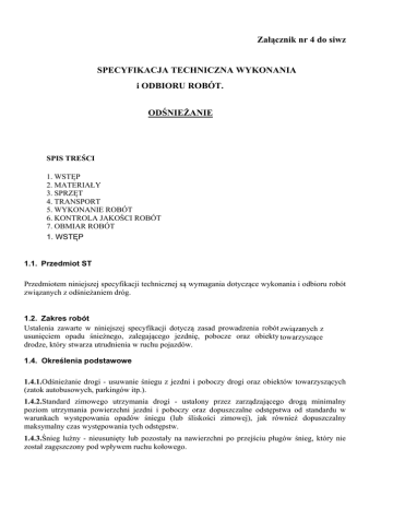 Załącznik nr 4 do siwz SPECYFIKACJA TECHNICZNA WYKONANIA i ODBIORU ROBÓT. ODŚNIEŻANIE SPIS TREŚCI 1. WSTĘP 2. MATERIAŁY 3. SPRZĘT 4. TRANSPORT 5. WYKONANIE ROBÓT 6. KONTROLA JAKOŚCI ROBÓT 7. OBMIAR ROBÓT 1. WSTĘP 1.1. Przedmiot ST Przedmiotem niniejszej specyfikacji technicznej są wymagania dotyczące wykonania i odbioru robót związanych z odśnieżaniem dróg. 1.2. Zakres robót Ustalenia zawarte w niniejszej specyfikacji dotyczą zasad prowadzenia robót związanych z usunięciem opadu śnieżnego, zalegającego jezdnię, pobocze oraz obiekty towarzyszące drodze, który stwarza utrudnienia w ruchu pojazdów. 1.4. Określenia podstawowe 1.4.1.Odśnieżanie drogi - usuwanie śniegu z jezdni i poboczy drogi oraz obiektów towarzyszących (zatok autobusowych, parkingów itp.). 1.4.2.Standard zimowego utrzymania drogi - ustalony przez zarządzającego drogą minimalny poziom utrzymania powierzchni jezdni i poboczy oraz dopuszczalne odstępstwa od standardu w warunkach występowania opadów śniegu (lub śliskości zimowej), jak również dopuszczalny maksymalny czas występowania tych odstępstw. 1.4.3.Śnieg luźny - nieusunięty lub pozostały na nawierzchni po przejściu pługów śnieg, który nie został zagęszczony pod wpływem ruchu kołowego. 1.4.4.Śnieg zajeżdżony - nieusunięty lub pozostały na nawierzchni po przejściu pługów śnieg, który został zagęszczony, ale nie stał się zlodowaciały. 1.4.5.Nabój śnieżny - nieusunięta zlodowaciała lub ubita warstwa śniegu o znacznej grubości (od kilku centymetrów), przymarznięta do nawierzchni jezdni. 1.4.6.Błoto pośniegowe - topniejący śnieg pozostały na nawierzchni po przejściu pługów i posypaniu jej środkami chemicznymi. 1.4.7.Pług odśnieżny - urządzenie stanowiące osprzęt o różnej konstrukcji odkładnicy i lemiesza, nawieszone do nośnika pługa. 1.4.8.Odśnieżarka - urządzenie montowane zwykle na nośniku, napędzane silnikiem spalinowym, służące do odspajania i odrzutu śniegu na odległość ok. 6 - 60 m poza obręb drogi, za pomocą odpowiednio skonstruowanych mechanizmów. 1.4.9.Odśnieżanie interwencyjne - usuwanie śniegu na wybranych odcinkach drogi z dopuszczeniem pozostawienia na jezdni równomiernej, zajeżdżonej warstwy śniegu oraz dopuszczeniem odśnieżenia w trudnych warunkach atmosferycznych tylko jednego pasa ruchu (z mijankami co 200 - 300 m). 1.4.10. Odśnieżanie uzupełniające - odśnieżanie, polegające na usuwaniu zwałów śniegu z poboczy poza koronę drogi, pozostawionych przy odśnieżaniu patrolowym, patrolowointerwencyjnym i interwencyjnym. 1.5. Ogólne wymagania dotyczące robót Za jakość wykonanych robót oraz ich zgodność z wymaganiami określonymi w niniejszej specyfikacji odpowiedzialny jest wykonawca robót. 2. MATERIAŁY Nie występują. 3. SPRZĘT. 3.1. Sprzęt stosowany do odśnieżania dróg Do odśnieżania dróg, w zależności od grubości zalegającego śniegu należy używać: - pługi odśnieżne (lemieszowe), - odśnieżarki mechaniczne, - maszyny drogowe i budowlane. Do zrywania naboju śnieżnego w zależności od grubości jego zalegania należy stosować: - szczotki mechaniczne montowane na pługach lemieszowych, - frezarki montowane na ciągnikach rolniczych, - pługi lemieszowe i równiarki wyposażone w specjalnie uzębione lemiesze, - noże skrawające montowane między osiami samochodu. Każda jednostka sprzętu musi uzyskać akceptację Zamawiającego. 3.2. Przygotowanie sprzętu do odśnieżania dróg W okresie przed spodziewanymi opadami śnieżnymi należy dokonać przeglądu i remontu sprzętu (osprzętu) do odśnieżania. Sprzęt powinien być przygotowany w takim stopniu, aby mógł być gotowy do użycia w ciągu 1,5 godziny od chwili wezwania przez Zamawiającego (w sytuacjach wyjątkowych -niezwłocznie). Nośniki pługów odśnieżnych powinny mieć zamontowane płyty czołowe. Pojazdy samochodowe używane do wykonywania prac przy odśnieżaniu dróg powinny być wyposażone w ostrzegawczy sygnał świetlny błyskowy barwy żółtej, zgodnie z ustawą „Prawo o ruchu drogowym". Lemiesze powinny mieć oznaczone skrajne, wystające poza obrys pojazdu, części w skośne pasy pod kątem 45o, barwy na przemian białej i czerwonej zgodnie z przepisami ustawy. Konstrukcja pługa powinna być przystosowana do zamocowania dodatkowych świateł drogowych pojazdu nad konstrukcją lemiesza. Zaleca się również stosowanie świateł obrysowych lemiesza. Po przygotowaniu sprzętu i nośników należy dokonać próbnego montażu, podczas którego należy sprawdzić w pługach: - dopasowanie elementów łączących pług z płytą czołową, - działanie mechanizmu podnoszenia, - możliwość swobodnego dopasowania się odkładnicy do pochylenia nawierzchni i dobrego przylegania lemiesza do nawierzchni, - działanie oświetlenia sygnalizacyjnego, 3.3. Wymagania dla pługów odśnieżnych 3.3.1. Nośniki pługów Nośnikami pługów odśnieżnych mogą być samochody lub inne pojazdy samobieżne z napędem na dwie lub więcej osi. Konstrukcja nośnika powinna umożliwiać zamocowanie płyty czołowej. Układ napędowy nośnika powinien zapewniać długotrwałą pracę na niskich przełożeniach skrzyni biegów, przy pełnym obciążeniu silnika. Operator nośnika powinien być wyposażony w telefon lub inny środek łączności i sygnał świetlny błyskowy barwy żółtej zgodnie z ustawą „Prawo o ruchu drogowym". Ponadto reflektory samochodu oraz kierunkowskazy muszą być umieszczone na wspornikach. Podnoszenie i opuszczanie pługa musi odbywać się z kabiny kierowcy. Łańcuchy przeciwśnieżne, hak i łopaty powinny stanowić dodatkowe wyposażenie. 3.3.2. Zawieszenie pługów Zaleca się, aby konstrukcja zawieszenia pługa umożliwiała szybkie połączenie dowolnej odkładnicy i lemiesza z różnymi nośnikami. Połączenie powinna zapewniać płyta czołowa (czołownica) mocowana do ramy nośnika za pomo