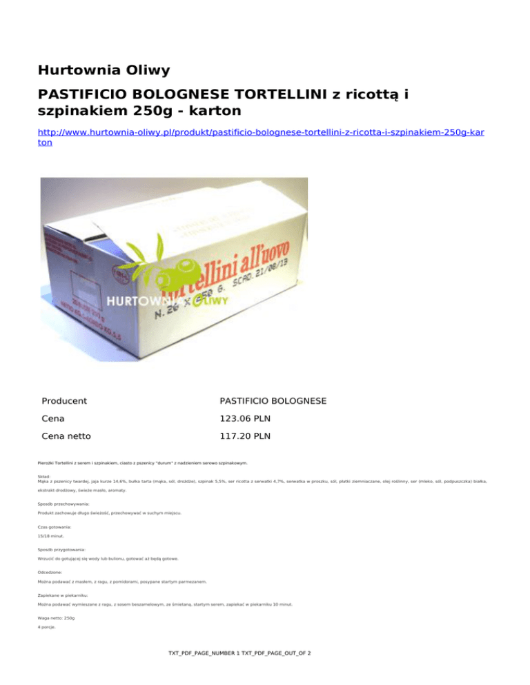 Hurtownia Oliwy PASTIFICIO BOLOGNESE TORTELLINI z ricottą i szpinakiem 250g - karton http://www.hurtownia-oliwy.pl/produkt/pastificio-bolognese-tortellini-z-ricotta-i-szpinakiem-250g-kar ton Producent PASTIFICIO BOLOGNESE Cena 123.06 PLN Cena netto 117.20 PLN Pierożki Tortellini z serem i szpinakiem, ciasto z pszenicy "durum" z nadzieniem serowo szpinakowym. Skład: Mąka z pszenicy twardej, jaja kurze 14,6%, bułka tarta (mąka, sól, drożdże), szpinak 5,5%, ser ricotta z serwatki 4,7%, serwatka w proszku, sól, płatki ziemniaczane, olej roślinny, ser (mleko, sól, podpuszczka) białka, ekstrakt drodżowy, świeże masło, aromaty. Sposób przechowywania: Produkt zachowuje długo świeżość, przechowywać w suchym miejscu. Czas gotowania: 15/18 minut. Sposób przygotowania: Wrzucić do gotującej się wody lub bulionu, gotować aż będą gotowe. Odcedzone: Można podawać z masłem, z ragu, z pomidorami, posypane startym parmezanem. Zapiekane w piekarniku: Można podawać wymieszane z ragu, z sosem beszamelowym, ze śmietaną, startym serem, zapiekać w piekarniku 10 minut. Waga netto: 250g 4 porcje. TXT_PDF_PAGE_NUMBER 1 TXT_PDF_PAGE_OUT_OF 2 Wyprodukowano we Włoszech. W kartonie znajduje się 20 sztuk. Osoby zainteresowane stałą współpracą i/lub zakupem większej partii towaru, proszę o kontakt via e-mail - prześlemy ofertę cenową, skorygowaną odpowiednio pod zapotrzebowanie klienta. TXT_PDF_PAGE_NUMBER 2 TXT_PDF_PAGE_OUT_OF 2