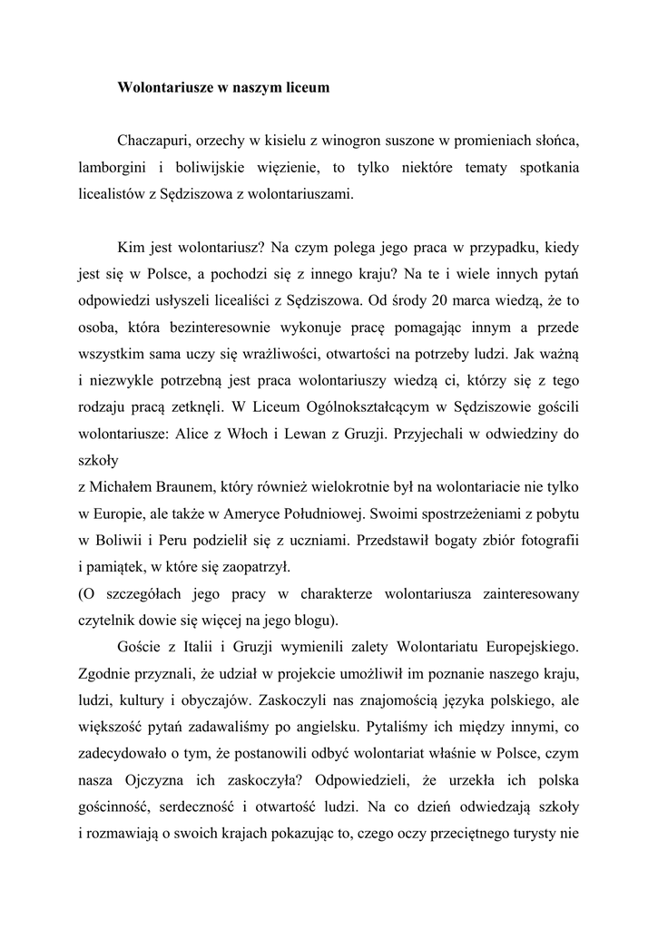 Wolontariusze w naszym liceum Chaczapuri, orzechy w kisielu z winogron suszone w promieniach słońca, lamborgini i boliwijskie więzienie, to tylko niektóre tematy spotkania licealistów z Sędziszowa z wolontariuszami. Kim jest wolontariusz? Na czym polega jego praca w przypadku, kiedy jest się w Polsce, a pochodzi się z innego kraju? Na te i wiele innych pytań odpowiedzi usłyszeli licealiści z Sędziszowa. Od środy 20 marca wiedzą, że to osoba, która bezinteresownie wykonuje pracę pomagając innym a przede wszystkim sama uczy się wrażliwości, otwartości na potrzeby ludzi. Jak ważną i niezwykle potrzebną jest praca wolontariuszy wiedzą ci, którzy się z tego rodzaju pracą zetknęli. W Liceum Ogólnokształcącym w Sędziszowie gościli wolontariusze: Alice z Włoch i Lewan z Gruzji. Przyjechali w odwiedziny do szkoły z Michałem Braunem, który również wielokrotnie był na wolontariacie nie tylko w Europie, ale także w Ameryce Południowej. Swoimi spostrzeżeniami z pobytu w Boliwii i Peru podzielił się z uczniami. Przedstawił bogaty zbiór fotografii i pamiątek, w które się zaopatrzył. (O szczegółach jego pracy w charakterze wolontariusza zainteresowany czytelnik dowie się więcej na jego blogu). Goście z Italii i Gruzji wymienili zalety Wolontariatu Europejskiego. Zgodnie przyznali, że udział w projekcie umożliwił im poznanie naszego kraju, ludzi, kultury i obyczajów. Zaskoczyli nas znajomością języka polskiego, ale większość pytań zadawaliśmy po angielsku. Pytaliśmy ich między innymi, co zadecydowało o tym, że postanowili odbyć wolontariat właśnie w Polsce, czym nasza Ojczyzna ich zaskoczyła? Odpowiedzieli, że urzekła ich polska gościnność, serdeczność i otwartość ludzi. Na co dzień odwiedzają szkoły i rozmawiają o swoich krajach pokazując to, czego oczy przeciętnego turysty nie są w stanie dostrzec, a po pracy zwiedzają Kielce oraz inne miasta i miło spędzają czas. Zwrócili nam, licealistom szczególną uwagę na charakter pracy wolontariusza, który nie otrzymuje wynagrodzenia, a jedynie kieszonkowe. Wolontariusz przyjeżdżający do Polski (jak również wyjeżdżający na wolontariat za granicę) nie jest jednak zdany wyłącznie na siebie. Organizacja, która go gości zapewnia mu mieszkanie, wyżywienie, naukę języka kraju, który wybrał jako miejsce wolontariatu, kieszonkowe oraz mentora. Na wolontariat można wyjechać z funduszy, które zapewnia Program Młodzież w działaniu. Wystarczy złożyć wniosek i poszukać organizacji wspierającej, aby wyjechać do kraju, o którym się marzyło. Spotkanie w Sędziszowie przygotowano w ramach współpracy Liceum Ogólnokształcącego z Centrum Wolontariatu w Kielcach.