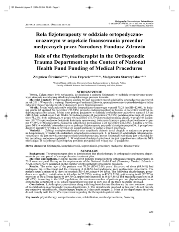 121 Sliwinski:Layout 1 2014-02-26 19:45 Page 1 O r t o p e d i a Traumatologia Rehabilitacja © MEDSPORTPRESS, 2013; 6(6); Vol. 15, 629-639 DOI: 10.5604/15093492.1091545 ARTYKUŁ ORYGINALNY / ORIGINAL ARTICLE Rola fizjoterapeuty w oddziale ortopedycznourazowym w aspekcie finansowania procedur medycznych przez Narodowy Fundusz Zdrowia Role of the Physiotherapist in the Orthopaedic Trauma Department in the Context of National Health Fund Funding of Medical Procedures Zbigniew Śliwiński(A,D,E), Ewa Frączek(A,B,C,D,E,F), Małgorzata Starczyńska(A,D,G) Wydział Nauk o Zdrowiu, Uniwersytet Jana Kochanowskiego w Kielcach, Polska Faculty of Health Sciences Jan Kochanowski University in Kielce, Poland STRESZCZENIE Wstęp. Celem pracy było wykazanie, że działania z zakresu fizjoterapii w oddziale ortopedyczno-urazowym stanowią nieodłączną składową kompleksowego procesu leczenia. Materiał i metody. Przeprowadzono analizę 66 kart pacjentów trzech oddziałów ortopedyczno-urazowych za rok 2011. W oparciu o wymogi Narodowego Funduszu Zdrowia, sporządzono raporty przedstawiające liczbę zabiegów fizjoterapeutycznych wykonanych przez fizjoterapeutów. Wyniki. Średni wiek pacjentów oddziału ortopedyczno-urazowego wynosił 70,26 lat (SD=12,08). W badanej grupie 62 spośród 66 pacjentów (93,94%) przeszło endoprotezoplastykę biodra, 4 pacjentów (6,06%) endoprotezoplastykę kolana. Średni czas pobytu pacjentów w oddziale ortopedyczno-urazowym wynosił 13 dni (SD=3,66) i wahał się od 9 do 30 dni. W badanej grupie 48 pacjentów (72,73%) poddano pionizacji, 47 pacjentów (71,21%) było sadzanych, w grupie 48 pacjentów (72,73%) prowadzono naukę chodu, w grupie 46 pacjentów (69,70%) prowadzono ćwiczenia kończyny operowanej, ćwiczenia kończyn górnych prowadzono w grupie 57,58%(n=38) pacjentów, ćwiczenia oddechowe prowadzono u 28 pacjentów (42,42%). Zgodnie z wymogami NFZ w oddziale ortopedycznym na jednego fizjoterapeutę przypada dziesięciu pacjentów. Z przeprowadzonych raportów wynika, iż wymóg ten został spełniony w jednej z trzech placówek. Wnioski. 1. Zabiegi endoprotezoplastyki oraz zespolenie złamań kości długich to najczęstsza przyczyna hospitalizacji w badanych oddziałach ortopedyczno-urazowych. 2. W badanych oddziałach ortopedyczno-urazowych nie jest prowadzone usprawnianie przedoperacyjne, proces fizjoterapii wdrażany jest w trzeciej dobie po zabiegu endoprotezoplastyki. 3. W większości badanych placówek nie jest respektowane zalecenie NFZ określające, iż na jednego fizjoterapeutę powinno przypadać nie więcej niż 10 pacjentów. Słowa kluczowe: fizjoterapia, kompleksowość, usprawnianie, procedury medyczne, finansowanie SUMMARY Background. The present paper aims to demonstrate that physiotherapy in orthopaedic and trauma departments is part and parcel of a comprehensive treatment plan. Material and methods. Hospital records of 66 patients treated in three orthopaedic trauma departments in 2011 were analysed. Basing on the requirements of the National Health Fund (Narodowy Fundusz Zdrowia – NFZ), reports were generated on the number of physiotherapy procedures provided. Results. The mean age of the patients was 70.26 (SD=12.08) years. Sixty-two of them (93.94%) had undergone hip replacement and the remaining 4 (6.06%) had undergone knee replacement procedures. The patients spent a mean of 13 days in hospital (SD=3.66, range 9-30 days). The following physiotherapy procedures were applied: mobilisation in 48 subjects (72.73%), seating in 47 (71.21%), gait training in 48 (72.73%), exercises of the affected leg in 46 (69.70%), upper limb exercises in 38 (57.58%) and breathing exercises in 28 (42.42%). According to the NFZ regulations, the maximum number of patients per one physiotherapist in an orthopaedic department is 10, which requirement was met in only one of the three hospitals involved. Conclusions. 1. Arthroplasty procedures along with long bone fracture fixation are the most common causes of hospitalisation in orthopaedic trauma departments. 2. The departments involved in this study do not provide pre-operative rehabilitation. Physiotherapy begins at 3 days post surgery. 3. Most of the departments involved do not comply with the NFZ’s requirement regarding the therapist-to-patient ratio. Key words: physiotherapy, comprehensive care, rehabilitation, medical procedures, financing 629 121 Sliwinski:Layout 1 2014-02-26 19:45 Page 2 Śliwiński Z. i wsp., Rola fizjoterapeuty w oddziale ortopedyczno-urazowym WSTĘP BACKGROUND Według danych epidemiologicznych, częstość występowania choroby zwyrodnieniowej stawów na świecie jest różna i wynosi 2–15% populacji. W Polsce choroba ta dotyczy ok. 7–8 milionów ludzi; w 40% przypadków zmiany zwyrodnieniowe zlokalizowane są w obrębie stawu biodrowego, w około 25% w obrębie stawu kolanowego. Za ważny czynnik wystąpienia choroby zwyrodnieniowej stawu uważa się: urazy, nadwagę, wady wrodzone, uprawianie niektórych dyscyplin sportowych oraz aktywność fizyczną kumulującą przeciążenia. Większość zaawansowanych zmian zwyrodnieniowych stawów obwodowych wymaga leczenia operacyjnego polegającego na przeprowadzeniu endoprotezoplastyki [1]. Leczenie schorzeń ortopedycznych wymaga kompleksowości, czyli konieczności uzupełnienia leczenia chirurgicznego indywidualnie dobraną fizjoterapią, wyposażeniem pacjenta w sprzęt ortopedyczny i odpowiednią wiedzę niezbędną do prawidłowego, czynnego funkcjonowania w dalszym życiu społecznym i zawodowym [2]. Na nowoczesną fizjoterapię ortopedyczną składa się: diagnostyka funkcjonalna, techniki manualne, postępowanie w ostrych urazach, złamaniach, wszechstronne informacje dotyczące leczenia zachowawczego i pooperacyjnej opieki terapeutycznej. Fizjoterapia obejmuje nie tylko proces usprawniania pacjentów z zaistniałymi dysfunkcjami, ale bierze czynny udział w procesie zapobiegania – profilaktyki. Usprawnianie