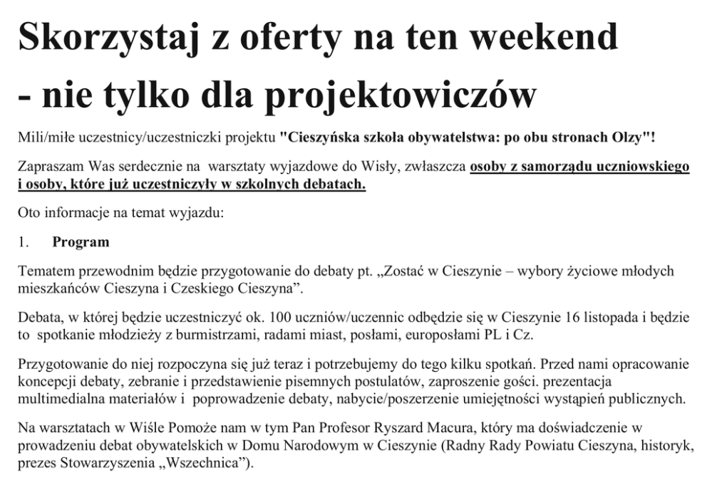 Skorzystaj z oferty na ten weekend - nie tylko dla projektowiczów Mili/miłe uczestnicy/uczestniczki projektu "Cieszyńska szkoła obywatelstwa: po obu stronach Olzy"! Zapraszam Was serdecznie na warsztaty wyjazdowe do Wisły, zwłaszcza osoby z samorządu uczniowskiego i osoby, które już uczestniczyły w szkolnych debatach. Oto informacje na temat wyjazdu: 1. Program Tematem przewodnim będzie przygotowanie do debaty pt. „Zostać w Cieszynie – wybory życiowe młodych mieszkańców Cieszyna i Czeskiego Cieszyna”. Debata, w której będzie uczestniczyć ok. 100 uczniów/uczennic odbędzie się w Cieszynie 16 listopada i będzie to spotkanie młodzieży z burmistrzami, radami miast, posłami, europosłami PL i Cz. Przygotowanie do niej rozpoczyna się już teraz i potrzebujemy do tego kilku spotkań. Przed nami opracowanie koncepcji debaty, zebranie i przedstawienie pisemnych postulatów, zaproszenie gości. prezentacja multimedialna materiałów i poprowadzenie debaty, nabycie/poszerzenie umiejętności wystąpień publicznych. Na warsztatach w Wiśle Pomoże nam w tym Pan Profesor Ryszard Macura, który ma doświadczenie w prowadzeniu debat obywatelskich w Domu Narodowym w Cieszynie (Radny Rady Powiatu Cieszyna, historyk, prezes Stowarzyszenia „Wszechnica”). 2. Organizacja Wyjazd nastąpi w piątek 22 czerwca o godzinie 15.00 dla grupy z Czeskiego Cieszyna spod Gimnazjum z polskim językiem nauczania, a o godzinie 15.15 spod Liceum Ogólnokształcącego im. Osuchowskiego w Cieszynie dla grupy z Cieszyna. Powrót 24 czerwca: do Cieszyna o 16.00, a do Czeskiego Cieszyna o 16.15 w to samo miejsce. 3. Wyżywienie i zakwaterowanie Wyjazd jest bezpłatny: wyżywienie, zakwaterowanie, przejazd. Prosimy o zgłaszanie wyżywienia wegetariańskiego na adres mailowy, na FB lub telefonicznie. 4. Mieszkamy w Domu Wczasowym RYMER w Wiśle, ul. Wyzwolenia 38, Tel./Fax 033 855 31 98, e-mail: [email protected], www.rymer.pl 5. Program integracyjny uzgodnimy już na miejscu w Wiśle. Mile widziana gitara na wieczorne ognisko. Zgłoszenia na wyjazd od niewpisanych na listę osób proszę przesłać do mnie mailem na [email protected] lub przez telefon/sms/Fb. Z pozdrowieniami – kierowniczka projektu Roma Rojowska (tel. 694 786 567)