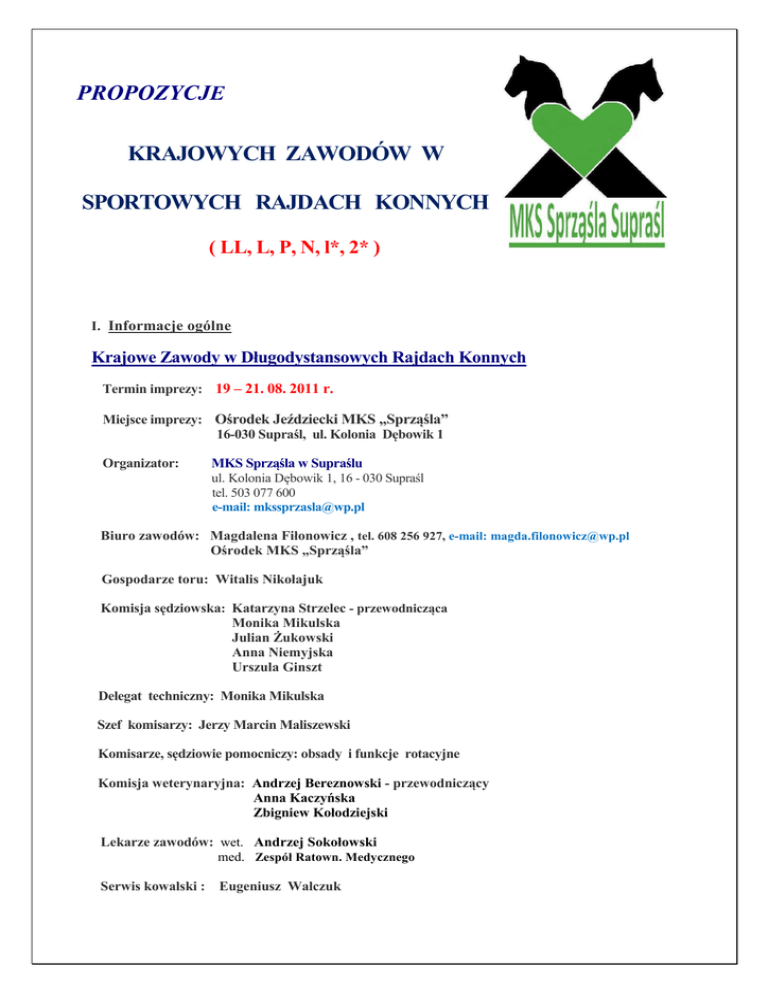 PROPOZYCJE KRAJOWYCH ZAWODÓW W SPORTOWYCH RAJDACH KONNYCH ( LL, L, P, N, l*, 2* ) I. Informacje ogólne Krajowe Zawody w Długodystansowych Rajdach Konnych Termin imprezy: 19 – 21. 08. 2011 r. Miejsce imprezy: Ośrodek Jeździecki MKS „Sprząśla” 16-030 Supraśl, ul. Kolonia Dębowik 1 Organizator: MKS Sprząśla w Supraślu ul. Kolonia Dębowik 1, 16 - 030 Supraśl tel. 503 077 600 e-mail: [email protected] Biuro zawodów: Magdalena Fiłonowicz , tel. 608 256 927, e-mail: [email protected] Ośrodek MKS „Sprząśla” Gospodarze toru: Witalis Nikołajuk Komisja sędziowska: Katarzyna Strzelec - przewodnicząca Monika Mikulska Julian Żukowski Anna Niemyjska Urszula Ginszt Delegat techniczny: Monika Mikulska Szef komisarzy: Jerzy Marcin Maliszewski Komisarze, sędziowie pomocniczy: obsady i funkcje rotacyjne Komisja weterynaryjna: Andrzej Bereznowski - przewodniczący Anna Kaczyńska Zbigniew Kołodziejski Lekarze zawodów: wet. Andrzej Sokołowski med. Zespół Ratown. Medycznego Serwis kowalski : Eugeniusz Walczuk II. Program zawodów Planowane konkursy: - Konkurs nr - Konkurs nr - Konkurs nr - Konkurs nr - Konkurs nr - Konkurs nr 1- kategoria 2 - kategoria 3 - kategoria 4 - kategoria 5 - kategoria 6 - kategoria 2* 1* N P L LL na dystansie 126,2 km na dystansie 94,6 km na dystansie 87,7 km na dystansie 54,9 km na dystansie 31,6 km na dystansie 16,4 km W kategorii 1* rozegrany zostanie konkurs Best Condition. Piątek 19. 08. 2011 r. Godzina 16.00 - przegląd weterynaryjny Godzina 18.00 - odprawa techniczna Sobota 20. 08. 2011 r. Godzina 7.00 - start KONKURS 1 kat. 2 * - dystans 126,2 km na czas (pętle: 31,6 km; 39,7 km; 31,6 km ; 23,3 km), - trasa 31,6 km --- (23,3+16,4)km --- 31,6 km --- 23,3 km, - bramki weterynaryjne po 31,6km; 71,3km; 102,9km i na mecie, - przerwy po 31,6 km - 30 min, po 71,3 km - 40 min, po 102,9 km - 50 min. . Zasady rozgrywania konkursu zgodne z regulaminem dyscypliny obowiązującym w dniu zawodów. Godzina 8.00 - start KONKURS 2 kat. 1 * - dystans 94,6 km na czas (pętle: 31,6 km; 39,7 km; 23,3 km), . - trasa: 31,6 km --- (23,3+16,4) km --- 23,3 km, - bramki weterynaryjne po 31,6 km , 71,3 km i na mecie, - przerwy po 31,6 km - 30 min: po 71,3 km - 40 min. Zasady rozgrywania konkursu zgodne z regulaminem dyscypliny obowiązującym w dniu zawodów. Godzina 9.00 - start KONKURS 3 kat. N - dystans 87,7 km na normę czasu (pętle: 31,6 km: 39,7 km: 16,4 km) - trasa: 31,6 km --- (23,3+16,4) km --- 16,4 km, - bramki weterynaryjne po 31,6 km; 71,3 km i na mecie, - przerwy po 31,6 km - 30 min, po 71,3 km - 40 min. Godzina 20.00 - spotkanie integracyjne, ognisko, … Niedziela 21. 08. 2011r. Godzina 7.00 - start KONKURS 4 kat. P - dystans 54,9 km na normę czasu (pętle: 31,6 km: 23,3 km) - trasa: 31,6 km --- 23,3 km, - bramki weterynaryjne po 31,6 km i na mecie, - przerwa po 31,6 km - 40 min. Zasady rozgrywania konkursu zgodne z regulaminem dyscypliny obowiązującym w dniu zawodów. Godzina 8.00 - start. KONKURS 5 kat. L - dystans 31,6 km na normę czasu (pętla: 31,6 km) - bramki weterynaryjne: w połowie dystansu (lotna) i na mecie. Zasady rozgrywania konkursu zgodne z regulaminem dyscypliny obowiązującym w dniu zawodów. Godzina 9.00 - start. KONKURS 6 kat. LL - dystans 16,4 km na normę czasu (pętla: 16,4 km) - bramki weterynaryjne: w połowie dystansu (lotna) i na mecie. Zasady rozgrywania konkursu zgodne z regulaminem dyscypliny obowiązującym w dniu zawodów. Godzina 14.30 Ogłoszenie wyników, wręczenie nagród, zakończenie zawodów. III. Informacje o trasie Pętle o długości: 31,6 km; 23,3 km; 16,4 km Podłoże: piaszczyste, trawiaste, żwirowe. Trasa przebiega drogami polnymi i leśnymi i wiejskimi prowadzącymi pomiędzy polami i łąkami doliny rzeki Sokołdy i Supraśli oraz duktami Puszczy Knyszyńskiej, przewidziane jest także pokonywanie wzniesień i przejazd w dwie strony przez most na trasie najdłuższej pętli. IV. Sprawy weterynaryjne Lp Funkcja Imię i nazwisko telefon 1. Powiatowy lekarz weterynarii 2. Dyżurny lekarz weterynarii w lecznicy Dariusz Filjanowicz Bartłomiej Olszewski 85 65 16 746 504 139 503 3. Lekarz weterynarii zawodów Andrzej Sokołowski 602 237 512 Szczepienia ochronne przeciwko grypie koni. Obowiązuje następujący schemat szczepień: a. szczepienie podstawowe: « pierwsze szczepienie - w dniu rozpoczęcia szczepień « drugie szczepienie - nie wcześniej niż 21-go dnia i nie później niż 92 dnia od pierwszego szczepienia. b. szczepienie przypominające: « co 6 miesięcy od ostatniego szczepienia (jest dopuszczalny 21 dniowy okres karencji); . żadne szczepienie przypominające nie może się odbyć później niż na 7 dni przed przybyciem na zawody. V. Sprawy organizacyjne Opłaty: Konkurs Konkurs nr 1 Konkurs nr 2 Konkurs nr 3 Konkurs nr 4 Konkurs nr 5 Konkurs nr 6 Wpisowe 180,- zł 160,- zł 140,- zł 120,- zł 100,-zł 80,-zł Opł. antydopingowa 15,- zł 15,- zł 15,- zł 15,- zł 15,- zł 15.-zł Opłata za boks: 150,- zł/zawody (w tym słoma i siano) Opłaty na miejscu po przybyciu na zawody Zgłoszenia nadsyłać: tel. 503 077 600 e-mail: [email protected] Zakwaterowanie: - Agroturystyka „Sokołda” – nocleg – Supraśl, ul. Nowa 12, tel. 604 401 926, www.agroturystyka-sokolda.prv.pl - PETRA – pokoje wypoczynkowe – Supraśl, ul. Nowy Świat 10, tel. 85 718 38 08, www.smaczne.spanie.pl - Stokrotka – pokoje gościnne – Supraśl, ul. Zacherta 10, tel. 85 718 33 83, www.stokrotkasuprasl.republika.pl - Żuczek – pokoje wypoczynkowe – Supraśl, Al. Niepodległości 12, tel. 85 718 34 03, www.zuczek.inocleg.pl - Zajma – pensjonat – Supraśl, ul. Cieliczańska 2, tel. 85 710 88 74, www.zajma.eu - Przy Kominku – pokoje gościnne – Supraśl, ul. Letniskowa 12, tel. 85 718 37 23 - U Szyszków – pokoje do wynajęcia – Supraśl, ul. Wczasowa 5, tel. 85 718 37 06, www.uszyszkow.pl - Bohema – noclegi, restauracja – Supraśl, pl. Kościuszki 1, tel. 85 743 15 69, www.bohema-s