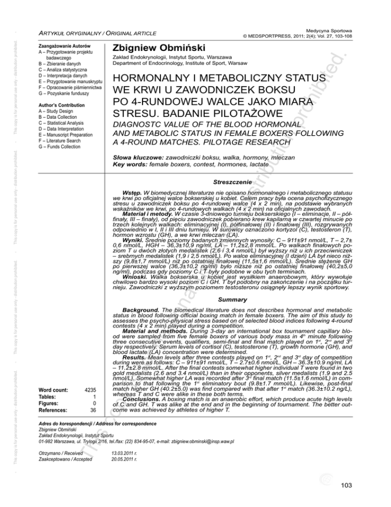 ed . Zbigniew Obmiński Zakład Endokrynologii, Instytut Sportu, Warszawa Department of Endocrinology, Institute of Sport, Warsaw tio np roh ibit HORMONALNY I METABOLICZNY STATUS WE KRWI U ZAWODNICZEK BOKSU PO 4-RUNDOWEJ WALCE JAKO MIARA STRESU. BADANIE PILOTAŻOWE DIAGNOSTC VALUE OF THE BLOOD HORMONAL AND METABOLIC STATUS IN FEMALE BOXERS FOLLOWING A 4-ROUND MATCHES. PILOTAGE RESEARCH dis tr ibu Słowa kluczowe: zawodniczki boksu, walka, hormony, mleczan Key words: female boxers, contest, hormones, lactate Streszczenie rso na lu This copy is for personal use only - distribution prohibited. se - on ly - Wstęp. W biomedycznej literaturze nie opisano hormonalnego i metabolicznego statusu we krwi po oficjalnej walce bokserskiej u kobiet. Celem pracy była ocena psychofizycznego stresu u zawodniczek boksu po 4-rundowej walce (4 x 2 min), na podstawie wybranych wskaźników we krwi, po 4-rundowych walkach (4 x 2 min) na oficjalnych zawodach. Materiał i metody. W czasie 3-dniowego turnieju bokserskiego (I – eliminacje, II – półfinały, III – finały), od pięciu zawodniczek pobierano krew kapilarną w czwartej minucie po trzech kolejnych walkach: eliminacyjnej (I), półfinałowej (II) i finałowej (III), rozgrywanych odpowiednio w I, II i III dniu turnieju. W surowicy oznaczono kortyzol (C), testosteron (T), hormon wzrostu (GH), a we krwi mleczan (LA). Wyniki. Średnie poziomy badanych zmiennych wynosiły: C – 911±91 nmol/L, T – 2,7± 0,6 nmol/L, HGH – 36,3±10,9 ng/ml, LA – 11,2±2,8 mmol/L. Po walkach finałowych poziom T u dwóch złotych medalistek (2,6 i 3,4 nmol/L) był wyższy niż u ich przeciwniczek – srebrnych medalistek (1,9 i 2,5 nmol/L). Po walce eliminacyjnej (I dzień) LA był nieco niższy (9,8±1,7 mmol/L) niż po ostatniej finałowej (11,5±1,6 mmol/L). Średnie stężenie GH po pierwszej walce (36,3±10,2 ng/ml) było niższe niż po ostatniej finałowej (40,2±5,0 ng/ml), podczas gdy poziomy C i T były podobne w obu tych terminach. Wnioski. Walka bokserska u kobiet jest wysiłkiem anaerobowym, który wywołuje chwilowo bardzo wysoki poziom C i GH. T był podobny na zakończenie i na początku turnieju. Zawodniczki z wyższym poziomem testosteronu osiągnęły lepszy wynik sportowy. Summary 4235 1 0 36 is c Word count: Tables: Figures: References: y is - for pe Background. The biomedical literature does not describes hormonal and metabolic status in blood following official boxing match in female boxers. The aim of this study to assesses the psycho-physical stress based on of selected blood indices following 4-round contests (4 x 2 min) played during a competition. Material and methods. During 3-day an international box tournament capillary blood were sampled from five female boxers of various body mass in 4th minute following three consecutive events, qualifiers, semi-final and final match played on 1st, 2nd and 3rd day respectively. Serum levels of cortisol (C), testosterone (T), growth hormone (GH), and blood lactate (LA) concentration were determined. Results. Mean levels after three contests played on 1st, 2nd and 3rd day of competition during were as follows: C – 911±91 nmol/L, T – 2.7±0.6 nmol/L, GH – 36.3±10.9 ng/ml, LA – 11.2±2.8 mmol/L. After the final contests somewhat higher individual T were found in two gold medalists (2.6 and 3.4 nmol/L) than in their opponents, silver medalists (1.9 and 2.5 nmol/L). Somewhat higher LA was recorded after 3rd final match (11.5±1.6 nmol/L) in comparison to that following the 1st eliminatory bout (9.8±1.7 mmol/L). Likewise, post-final match higher GH (40.2±5.0) was find compared with that after 1st match (36.3±10.2 ng/L), whereas T and C were alike in these both terms. Conclusions. A boxing match is an anaerobic effort, which produce acute high levels of C and GH. T was alike at the end and in the beginning of tournament. The better outcome was achieved by athletes of higher T. op This copy is for personal use only - distribution prohibited. Author’s Contribution A – Study Design B – Data Collection C – Statistical Analysis D – Data Interpretation E – Manuscript Preparation F – Literature Search G – Funds Collection This copy is for personal use only - distribution prohibited. - Zaangażowanie Autorów A – Przygotowanie projektu badawczego B – Zbieranie danych C – Analiza statystyczna D – Interpretacja danych E – Przygotowanie manuskryptu F – Opracowanie piśmiennictwa G – Pozyskanie funduszy Th Adres do korespondencji / Address for correspondence Zbigniew Obmiński Zakład Endokrynologii, Instytut Sportu 01-982 Warszawa, ul. Trylogii 2/16, tel./fax: (22) 834-95-07, e-mail: [email protected] Otrzymano / Received Zaakceptowano / Accepted 13.03.2011 r. 20.05.2011 r. - This copy is for personal use only - distribution prohibited. Medycyna Sportowa © MEDSPORTPRESS, 2011; 2(4); Vol. 27, 103-108 ARTYKUŁ ORYGINALNY / ORIGINAL ARTICLE 103 Boks zalicza się do grupy sportów walki wymagających dobrej anaerobowej i aerobowej wydolności fizycznej, wraz z krótkim czasem reakcji i szybkim podejmowaniem decyzji w czasie walki. Bez tych cech szansa na sukces jest niewielka, natomiast ryzyko powtarzanych mikrourazów głowy duże, co może po latach prowadzić do zaburzeń neurologicznych [1-5]. Takich symptomów nie odnotowano w tych sportach walki, gdzie nie ma urazów głowy. Szermierka, w przeciwieństwie do boksu, poprawia psychomotoryczne możliwości. Ponadto, bokserzy demonstrują zwiększoną wewnątrzosobniczą zmienność zachowań [6]. Po pojedynczej walce bokserskiej ujawniono chwilowe, krótkoterminowe pogorszenie funkcji poznawczych, które ulegają pełnej poprawie dopiero po miesięcznej restytucji [7]. Badania przeprowadzone w czasie wielodniowego turnieju ujawniły chwilowe pogorszenie czasu reakcji prostej i z wyborem u tych zawodników, którzy przegrali walki przed regulaminowym czasem [8]. Powtarzające się mikrourazy głowy u bokserów i kickbokser