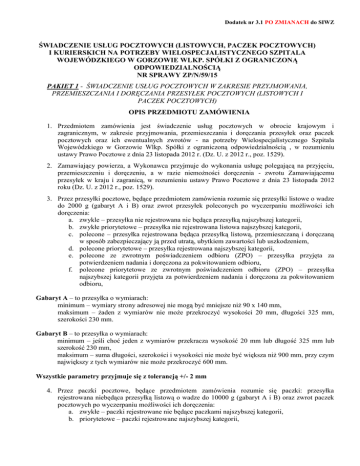 Dodatek nr 3.1 PO ZMIANACH do SIWZ ŚWIADCZENIE USŁUG POCZTOWYCH (LISTOWYCH, PACZEK POCZTOWYCH) I KURIERSKICH NA POTRZEBY WIELOSPECJALISTYCZNEGO SZPITALA WOJEWÓDZKIEGO W GORZOWIE WLKP. SPÓŁKI Z OGRANICZONĄ ODPOWIEDZIALNOŚCIĄ NR SPRAWY ZP/N/59/15 PAKIET 1 - ŚWIADCZENIE USŁUG POCZTOWYCH W ZAKRESIE PRZYJMOWANIA, PRZEMIESZCZANIA I DORĘCZANIA PRZESYŁEK POCZTOWYCH (LISTOWYCH I PACZEK POCZTOWYCH) OPIS PRZEDMIOTU ZAMÓWIENIA 1. Przedmiotem zamówienia jest świadczenie usług pocztowych w obrocie krajowym i zagranicznym, w zakresie przyjmowania, przemieszczania i doręczania przesyłek oraz paczek pocztowych oraz ich ewentualnych zwrotów - na potrzeby Wielospecjalistycznego Szpitala Wojewódzkiego w Gorzowie Wlkp. Spółki z ograniczoną odpowiedzialnością , w rozumieniu ustawy Prawo Pocztowe z dnia 23 listopada 2012 r. (Dz. U. z 2012 r., poz. 1529). 2. Zamawiający powierza, a Wykonawca przyjmuje do wykonania usługę polegającą na przyjęciu, przemieszczeniu i doręczeniu, a w razie niemożności doręczenia - zwrotu Zamawiającemu przesyłek w kraju i zagranicą, w rozumieniu ustawy Prawo Pocztowe z dnia 23 listopada 2012 roku (Dz. U. z 2012 r., poz. 1529). 3. Przez przesyłki pocztowe, będące przedmiotem zamówienia rozumie się przesyłki listowe o wadze do 2000 g (gabaryt A i B) oraz zwrot przesyłek poleconych po wyczerpaniu możliwości ich doręczenia: a. zwykle – przesyłka nie rejestrowana nie będąca przesyłką najszybszej kategorii, b. zwykłe priorytetowe – przesyłka nie rejestrowana listowa najszybszej kategorii, c. polecone – przesyłka rejestrowana będąca przesyłką listową, przemieszczaną i doręczaną w sposób zabezpieczający ją przed utratą, ubytkiem zawartości lub uszkodzeniem, d. polecone priorytetowe – przesyłka rejestrowana najszybszej kategorii, e. polecone ze zwrotnym poświadczeniem odbioru (ZPO) – przesyłka przyjęta za potwierdzeniem nadania i doręczona za pokwitowaniem odbioru, f. polecone priorytetowe ze zwrotnym poświadczeniem odbioru (ZPO) – przesyłka najszybszej kategorii przyjęta za potwierdzeniem nadania i doręczona za pokwitowaniem odbioru, Gabaryt A – to przesyłka o wymiarach: minimum – wymiary strony adresowej nie mogą być mniejsze niż 90 x 140 mm, maksimum – żaden z wymiarów nie może przekroczyć wysokości 20 mm, długości 325 mm, szerokości 230 mm. Gabaryt B – to przesyłka o wymiarach: minimum – jeśli choć jeden z wymiarów przekracza wysokość 20 mm lub długość 325 mm lub szerokość 230 mm, maksimum – suma długości, szerokości i wysokości nie może być większa niż 900 mm, przy czym największy z tych wymiarów nie może przekroczyć 600 mm. Wszystkie parametry przyjmuje się z tolerancją +/- 2 mm 4. Przez paczki pocztowe, będące przedmiotem zamówienia rozumie się paczki: przesyłka rejestrowana niebędąca przesyłką listową o wadze do 10000 g (gabaryt A i B) oraz zwrot paczek pocztowych po wyczerpaniu możliwości ich doręczenia: a. zwykłe – paczki rejestrowane nie będące paczkami najszybszej kategorii, b. priorytetowe – paczki rejestrowane najszybszej kategorii, Dodatek nr 3.1 PO ZMIANACH do SIWZ c. ze zwrotnym poświadczeniem odbioru – paczki rejestrowane zwykłe i priorytetowe przyjęte za potwierdzeniem nadania i doręczone za pokwitowaniem odbioru. Gabaryt A – to paczka o wymiarach: minimum – wymiary strony adresowej nie mogą być mniejsze niż 90 x 140 mm, maksimum – żaden z wymiarów nie może przekroczyć: wysokości 300 mm, długości 600mm, szerokości 500 mm. Gabaryt B – to paczka o wymiarach: minimum – jeśli choć jeden z wymiarów przekracza wysokość 300 mm, długość 600 mm, szerokość 500 mm, maksimum – suma długości i największego obwodu mierzonego w innym kierunku niż długość nie może być większa niż 3000 mm, przy czym największy wymiar nie może przekroczyć 1500 mm. Wszystkie parametry przyjmuje się z tolerancją +/- 2 mm 5. Wykonawca zobowiązany jest do przyjmowania przesyłek w wyznaczonej placówce Zamawiającego: Miejsce odbioru przesyłek: 1/ Wielospecjalistyczny Szpital Wojewódzki w Gorzowie Wlkp. sp. z o.o. - ul. Dekerta 1, KANCELARIA, pok. nr 30; 2/ Wielospecjalistyczny Szpital Wojewódzki w Gorzowie Wlkp. sp. z o.o. - ul. Walczaka 42, budynek administracja, SEKRETARIAT 6. Zamawiający zobowiązuje się do umieszczenia na przesyłce listowej lub paczce nazwy odbiorcy wraz z jego pełnym adresem, określając rodzaj przesyłki (zwykła, polecona, priorytet czy ze zwrotnym poświadczeniem odbioru – ZPO) oraz umieszczania na stronie adresowej każdej nadawanej przesyłki nadruku (pieczątki) określającej pełną nazwę i adres Zamawiającego a także umieszczeniu oznaczenia potwierdzającego wniesienie opłaty za usługę w postaci napisu, nadruku lub odcisku pieczęci w sposób uzgodniony z Wykonawcą. 7. Zamawiający nie dopuszcza sytuacji w której na opakowaniu przesyłek (na kopercie stronie adresowej przesyłek) nadawanych przez Zamawiającego i na dowodzie nadania przesyłek Zamawiającego oraz na zwrotnym poświadczeniu/potwierdzeniu odbioru były inne dane niż dane adresowe Zamawiającego, a zamieszczone by były dane adresowe innego podmiotu nadającego w imieniu i na rzecz Zamawiającego. 8. Zamawiający zobowiązuje się do właściwego przygotowania przesyłek oraz sporządzania zestawień dla przesyłek. 9. Zamawiający zobowiązuje się do nadawania przesyłek w stanie uporządkowanym, przez co należy rozumieć: a. dla przesyłek rejestrowanych – wpisanie każdej przesyłki do pocztowej książki nadawczej w dwóch egzemplarzach, z których oryginał będzie przeznaczony dla Wykonawcy w celach rozliczeniowych, a kopia stanowić będzie dla Zamawiającego potwierdzenie nadania danej partii przesyłek, b. dla przesyłek zwykłych – zestawienie ilościowe przesyłek wg poszczególnych kategorii wagowych sporządzone dla celów rozliczeniowych w dwóch egzemplarzach, z któ