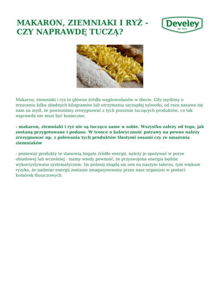 MAKARON, ZIEMNIAKI I RYŻ CZY NAPRAWDĘ TUCZĄ? Makaron, ziemniaki i ryż to główne źródła węglowodanów w diecie. Gdy myślimy o zrzuceniu kilku zbędnych kilogramów lub utrzymaniu szczupłej sylwetki, od razu nasuwa się nam na myśl, że powinniśmy zrezygnować z tych pozornie tuczących produktów, co tak naprawdę nie musi być konieczne: - makaron, ziemniaki i ryż nie są tuczące same w sobie. Wszystko zależy od tego, jak zostaną przygotowane i podane. W trosce o kaloryczność potrawy na pewno należy zrezygnować np. z polewania tych produktów tłustymi sosami czy ze smażenia ziemniaków - ponieważ produkty te stanowią bogate źródło energii, należy je spożywać w porze obiadowej lub wcześniej - mamy wtedy pewność, że przyswojona energia będzie wykorzystywana systematycznie. Im później znajdą się one na naszym talerzu, tym większe ryzyko, że nadmiar energii zostanie zmagazynowany przez nasz organizm w postaci komórek tłuszczowych.