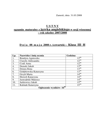 Zamość, dnia 31.03.2008 USTNY egzamin maturalny z języka angielskiego w sesji wiosennej – rok szkolny 2007/2008 D n i a 08 m a j a 2008 r. (czwartek) - Klasa III H Lp. 1. 2. 3. 4. 5. 6. 7. 8. 9. 10. 11. Nazwisko i imię ucznia Godzina Bondyra Agnieszka 1200 Ciuryło Aleksandra 1220 Czuk Anna 1240 Demski Jakub 1300 Dziura Ilona 1320 Gołębiowska Katarzyna 1340 Grzyb Marta 1400 Horoch Katarzyna 1420 Jastrzębski Mateusz 1440 Jurkiewicz Jakub 1500 Kalmuk Katarzyna 1520 Ogłoszenie wyników- 1600 D n i a 08 m a j a 2008r. J. ANGIELSKI KLASA III H Lp. Nazwisko i imię ucznia 1. 2. 3. 4. 5. 6. 7. 8. 9. 10. 11. 12. Kniaź Anna Kowalczyk Anna Kozak Monika Łapińska Magdalena Łupina Renata Mazur Sylwia Mielniczek Aleksandra Mikuła Ewelina Nieczyporowska Justyna Oktaba Daniel Pańczyk Paulina Śmiałko Agnieszka ub.rok Godzina R Ogłoszenie wyników- 1620 1200 1220 1240 1300 1320 1340 1400 1420 1440 1500 1520 1540 D n i a 08 m a j a 2008r. J. ANGIELSKI KLASA III H Lp. Nazwisko i imię ucznia 1. 2. 3. 4. 5. 6. 7. 8. 9. 10. 11. 12. Patron Monika Podskarbi Dominika Poździk Karolina Romaniuk Karolina Sobczak Anita Sowiński Artur Szykuła Agnieszka Tytuła Ewa Wicha Joanna Wojewoda Justyna Zając Iwona Żyłak Monika Ogłoszenie wyników- 1630 Godzina 1200 1220 1240 1300 1320 1340 1400 1420 1440 1500 1520 1540 D n i a 09 m a j a 2008r. J. ANGIELSKI KLASA III i Lp. Nazwisko i imię ucznia 1. 2. 3. 4. 5. 6. 7. 8. 9. 10. 11. 12. 13. Bigos Arkadiusz Buczko Krzysztof Cymborska Agata Gąsior Kamil Grzesiuk Sławomir Hantz Magdalena Hejzner Joanna Jezierski Dawid Klimaszewska Anna Krawczuk Natalia Lal Mateusz Misztal Joanna Pachołek Sebastian Ogłoszenie wyników- 1645 Godzina 1200 1220 1240 1300 1320 1340 1400 1420 1440 1500 1520 1540 1600 D n i a 9 m a j a 2008r. J. ANGIELSKI KLASA III i Lp. Nazwisko i imię ucznia 1. 2. 3. 4. 5. 6. 7. 8. 9. 10. 11. 12. 13. Paszt Kamil Godzina R Pijajko Angelika Proczka Marek Rusinek Anna Rutkowska Sylwia Sarzyńska Joanna Sierota Donata Smoter Kinga Stańczyk Ewelina Sydorowicz Bartłomiej Włosowskla Julita Zams Angelika Dubik Karol Ogłoszenie wyników- 1645 1200 1220 1240 1300 1320 1340 1400 1420 1440 1500 1520 1540 1600 D n i a 14 m a j a 2008r. J. ANGIELSKI KLASA III D Lp. Nazwisko i imię ucznia 1. 2. 3. 4. 5. 6. 7. 8. 9. 10. 11. Bartuzi Dominika Bojanek Jakub Czerwonka Barbara Droździel Paulina Fronc Irmina Gałka Izabela Jackowiak Aneta Kaczoruk Aneta Kalisz Joanna Kliszcz Edyta Smyk Damian - III K Ogłoszenie wyników- 1600 Godzina 1200 1220 1240 1300 1320 1340 1400 1420 1440 1500 1520 D n i a 14 m a j a 2008r. J. ANGIELSKI KLASA III D Lp. Nazwisko i imię ucznia 1. 2. 3. 4. 5. 6. 7. 8. 9. Kołodziejczuk Anna Kowalska Katarzyna Kukułowicz Marta Kwiatkowska Milena Leńczuk Agnieszka Lewandowska Anna Paczewska Anna Rysak Paweł Skiba Paulina 10. Ostasz Katarzyna Godzina R (dod) Ogłoszenie wyników- 1550 1200 1220 1240 1300 1320 1340 1400 1420 1440 1500 D n i a 14 m a j a 2008r. J. ANGIELSKI KLASA III D Lp. Nazwisko i imię ucznia 1. Skóra Martyna 2. 3. 4. 5. 6. 7. 8. 9. 10. 11. Skwara Katarzyna Staniszewski Michał Stasiuk Agata Szwedo Justyna Szypuła Lucyna Teterycz Monika Tracz vel Bednarczyk Konrad Wilczek Diana Wójcik Marlena Wszoła Adrian Godzina R Ogłoszenie wyników- 1600 1200 1220 1240 1300 1320 1340 1400 1420 1440 1500 1520 D n i a 15 m a j a 2008r. (czwartek) J. ANGIELSKI KLASA III F Lp. Nazwisko i imię ucznia 1. 2. 3. 4. 5. 6. 7. 8. 9. 10. 11. Bajwoluk Maja Banaś Olga Bosiak Monika Chałas Katarzyna Czuchaj Magdalena Czykierda Magdalena Daciej Iwona Gajur Anna Gancarz Jolanta Gęborys Mateusz Gis Anna Godzina R R Ogłoszenie wyników- 1600 1200 1220 1240 1300 1320 1340 1400 1420 1440 1500 1520 D n i a 15 m a j a 2008r. (czwartek) J. ANGIELSKI KLASA III F Lp. Nazwisko i imię ucznia 1. 2. 3. 4. 5. 6. 7. 8. 9. 10. 11. Górska Olga Kalita Dominika Kobylarz Monika Kozłowska Agnieszka Kozłowska Magdalena Medakk Edyta Namroży Katarzyna Nowak Katarzyna Pawliszak Krzysztof Pupiec Agnieszka Repeć Barbara Godzina R R Ogłoszenie wyników- 1600 1200 1220 1240 1300 1320 1340 1400 1420 1440 1500 1520 D n i a 15 m a j a 2008r. (czwartek) J. ANGIELSKI KLASA III F Lp. Nazwisko i imię ucznia 1. 2. 3. 4. 5. 6. 7. 8. 9. 10. 11. Romanowska Monika Różyczka Agnieszka Samborska Diana Solska Paulina Stanibuła Paweł Stopa Paweł Szwed Aleksandra Świderek Klaudia Waga Magdalena Wróblewska Magdalena Ziemian Anna Godzina R R R Ogłoszenie wyników- 1600 1200 1220 1240 1300 1320 1340 1400 1420 1440 1500 1520 D n i a 19 m a j a 2008r. (poniedziałek) J. ANGIELSKI KLASA III B Lp. Nazwisko i imię ucznia 1. 2. 3. 4. 5. 6. 7. 8. 9. 10. 11. 12. 13. Bezpalko Jan Biront Rafał Bondyra Tomasz Czuba Łukasz Gałka Justyna Gęborys Ireneusz Goluch Sylwia Grabowska Patrycja Hysa Łukasz Jamroż Kamil Knap Arkadiusz Kniaź Michał Kolmer Marek Ogłoszenie wyników- 1630 Godzina 1200 1220 1240 1300 1320 1340 1400 1420 1440 1500 1520 1540 1600 D n i a 19 m a j a 2008r. (poniedziałek) J. ANGIELSKI KLASA III B Lp. Nazwisko i imię ucznia 1. 2. 3. 4. 5. 6. 7. 8. 9. 10. 11. 12. Kozyra Paweł Kuczmaszewska Elżbieta Lewenda Katarzyna Mazur Arkadiusz Murzyn Dominika Nowosad Dorota Przychodzień Piotr Rogala Paweł Szczepanek Tomasz Szmal Konrad Wigłasz Samuel Winiarska Karolina Ogłoszenie wyników- 1630 Godzina 1200 1220 1240 1300 1320 1340 1400 1420 1440 1500 1520 1540 D n i a 20 m a j a 2008r. ( wtorek) J. ANGIELSKI KLASA III A Lp. Nazwisko i imię ucznia 1. 2. 3. 4. 5. 6. 7. 8. 9. Bodziacki Jan Czerwieniec Patryk Czyżyk Damian Dąbek Marcin Dąbski Kamil Furmańczuk Magdalena Gocki Arkadiusz Hamerski Tomasz Horecka Katarzyna Ogłoszenie wyników- 1520 Godzina 1200 1220 1240 1300 1320 1340 1400 1420 1440 D n i a 20 m a j a 2008r. ( wtorek) J. ANGIELSKI KLASA III A Lp. Nazwisko i imię ucznia 1. 2. 3. 4. 5. 6. 7. 8. 9. Kawałek Damian Korzeniowski Jacek Krzyszczuk Michał Łogożny Jarosław Machałek Damian Morski Bartłomiej Nowogrodzki Michał Palak Łukasz Paszc