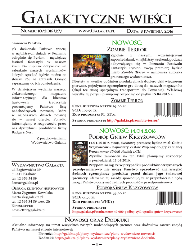 Galaktyczne Numer: 10/2016 (27) www.Galakta.pl W dzisiejszym wydaniu naszego elektronicznego magazynu informacyjnego dla klientów hurtowych tradycyjnie prezentujemy Państwu listę nadchodzących nowości, które w najbliższych dniach pojawią się w naszej ofercie. Ponadto informujemy o rozpoczęciu przez nas dystrybucji produktów firmy Badger’s Nest. Z pozdrowieniami, Wydawnictwo Galakta Wydawnictwo Galakta ul. Łagiewnicka 39 30-417 Kraków tel: 12 656 34 89 [email protected] Obsługa klientów hurtowych Marta Zygmunt-Kowalska [email protected] tel. 12 656 34 89 wew. 26 Newsletter [email protected] Data: 8 kwietnia 2016 Nowość: Zombie Terror Szanowni Państwo, jak doskonale Państwo wiecie, w najbliższych dniach w Poznaniu odbędzie się Pyrkon - największy festiwal fantastyki w naszym kraju. Na imprezie oczywiście nie zabraknie naszych wysłanników, których spotkać będzie można na stoisku 768 na antresoli. Gorąco zapraszamy do ich odwiedzenia. wieści Zgodnie z naszymi wcześniejszymi zapowiedziami, w najbliższy weekend, podczas odbywającego się w Poznaniu Festiwalu Fantastyki Pyrkon, swoją premierę będzie miało Zombie Terror – najnowsza autorska gra naszego wydawnictwa. Niestety w wyniku opóźnień produkcyjnych dopiero dziś wieczorem pierwsze, pojedyncze egzemplarze gry dotrą do naszych magazynów (skąd też ruszą specjalnym transportem do Poznania). Właściwą wysyłkę tej pozycji planujemy rozpocząć od piątku 15.04.2016 r. Zombie Terror Cena hurtowa netto: 63,00 zł SCD: 109,90 zł Kod produktu: PL_ZTo1 Strona produktu: http://galakta.pl/zombie-terror/ Nowość: 14.04.2016 Podbój: Gniew Krzyżowców 14.04.2016 r. swoją światową premierę będzie miał Gniew Krzyżowców – najnowszy Zestaw Wojenny do gry karcianej Warhammer 40 000 Podbój LCG. Wysyłkę zamówień na ten tytuł planujemy rozpocząć w poniedziałek 11.04.2016. Przypominamy, że w przypadku produktów otrzymanych przedpremierowo nie mogą Państwo sprzedawać ani wysyłać żadnych egzemplarzy produktu przed dniem jego światowej premiery. Złamanie tej zasady spowoduje, że w przyszłości nie będą mogli Państwo otrzymać żadnych produktów przedpremierowo. Podbój: Gniew Krzyżowców Cena hurtowa netto: 33,00 zł SCD: 54,90 zł Kod produktu: WHK13 Strona produktu: http://galakta.pl/warhammer-40-000-podboj-cykl-upadku-gniew-krzyzowcow/ Nowości oraz Dodruki Aktualne informacje na temat wszystkich naszych nadchodzących premier oraz dodruków zawsze znajdą Państwo na naszej stronie internetowej: Nowości: http://galakta.pl/plany-wydawnicze/plany-wydawnicze-nowosci/ Dodruki: http://galakta.pl/plany-wydawnicze/plany-wydawnicze-dodruki/ 1 Ważna informacja Badger’s Nest - dystrybucja Filmy promocyjne Zombie Terror Na naszym kanale w serwisie YouTube rozpoczęliśmy niedawno publikację filmów promocyjnych do gry Zombie Terror. Już dostępne są pierwsze dwa z nich, natomiast w niedalekiej przyszłości opublikujemy kolejne z materiałów. Gorąco zachęcamy do ich oglądania i udostępniania. Link do wideo: https://youtu.be/3Od1UuYbqQk https://youtu.be/BPWBJxmS01I Chcieliśmy poinformować, że z początkiem kwietnia 2016 nasze wydawnictwo zostało oficjalnie wyłącznym dystrybutorem produktów firmy Badger’s Nest. W związku z tym do naszej oferty hurtowej dołącza gra Rycerze Pustkowi Rycerze Pustkowi to przygodowa gra planszowa osadzona w dystopicznej Australii. Gracze wcielają się w bohaterów postapokaliptycznego świata i ruszają na pustkowia, gdzie przeżywają niezwykłe przygody, zmagają się z wrogami, handlują i realizują misje. Podczas rozgrywki gracze muszą gospodarować dostępnymi surowcami, a w walce wykazać się wyczuciem taktyki. Pozycja ta dostępna będzie w naszym systemie hurtowym od poniedziałku 11.04.2016. Wtedy też rozpoczniemy realizację zamówień na ten tytuł. Rycerze Pustkowi Cena hurtowa netto: 96,00 zł SCD: 159,90 zł Kod produktu: BN02 Oficjalna strona gry: http://rycerzepustkowi.pl Nowość: 21.04.2016 Podbój: Gniew Krzyżowców 21.04.2016 r. swoją światową premierę będzie miał Spokój w Westeros – najnowszy Zestaw Fabularny do gry karcianej Gra o Tron LCG. Wysyłkę zamówień na tę pozycję planujemy rozpocząć 18.04.2016, aby otrzymali je Państwo z odpowiednim wyprzedzeniem. Przypominamy, że w przypadku produktów otrzymanych przedpremierowo nie mogą Państwo sprzedawać ani wysyłać żadnych egzemplarzy produktu przed dniem jego światowej premiery. Złamanie tej zasady spowoduje, że w przyszłości nie będą mogli Państwo otrzymać żadnych produktów przedpremierowo. Gra o Tron LCG: Spokój Cena hurtowa netto: 33,00 zł SCD: 54,90 zł Kod produktu: PL-GT06 w Westeros Strona produktu: http://galakta.pl/gra-o-tron-gra-karciana-cykl-westeros-spokoj-w-westeros/ Nowości oraz Dodruki Najnowsze informacje na temat wszystkich naszych nadchodzących premier oraz dodruków zawsze znajdą Państwo na naszej stronie internetowej: Nowości: http://galakta.pl/plany-wydawnicze/plany-wydawnicze-nowosci/ Dodruki: http://galakta.pl/plany-wydawnicze/plany-wydawnicze-dodruki/ 2