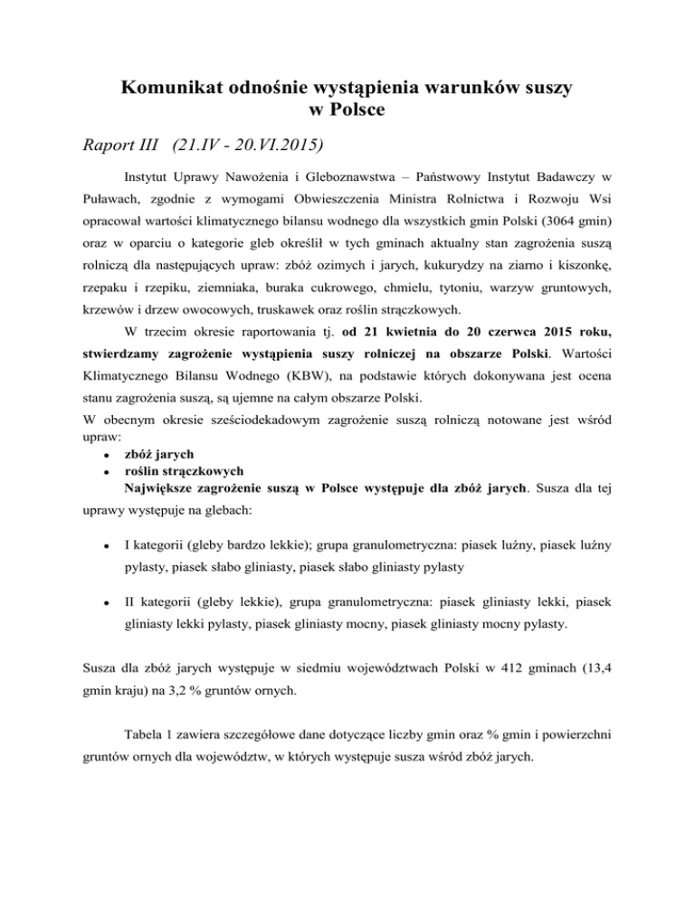 Komunikat odnośnie wystąpienia warunków suszy w Polsce Raport III (21.IV - 20.VI.2015) Instytut Uprawy Nawożenia i Gleboznawstwa – Państwowy Instytut Badawczy w Puławach, zgodnie z wymogami Obwieszczenia Ministra Rolnictwa i Rozwoju Wsi opracował wartości klimatycznego bilansu wodnego dla wszystkich gmin Polski (3064 gmin) oraz w oparciu o kategorie gleb określił w tych gminach aktualny stan zagrożenia suszą rolniczą dla następujących upraw: zbóż ozimych i jarych, kukurydzy na ziarno i kiszonkę, rzepaku i rzepiku, ziemniaka, buraka cukrowego, chmielu, tytoniu, warzyw gruntowych, krzewów i drzew owocowych, truskawek oraz roślin strączkowych. W trzecim okresie raportowania tj. od 21 kwietnia do 20 czerwca 2015 roku, stwierdzamy zagrożenie wystąpienia suszy rolniczej na obszarze Polski. Wartości Klimatycznego Bilansu Wodnego (KBW), na podstawie których dokonywana jest ocena stanu zagrożenia suszą, są ujemne na całym obszarze Polski. W obecnym okresie sześciodekadowym zagrożenie suszą rolniczą notowane jest wśród upraw: zbóż jarych roślin strączkowych Największe zagrożenie suszą w Polsce występuje dla zbóż jarych. Susza dla tej uprawy występuje na glebach: I kategorii (gleby bardzo lekkie); grupa granulometryczna: piasek luźny, piasek luźny pylasty, piasek słabo gliniasty, piasek słabo gliniasty pylasty II kategorii (gleby lekkie), grupa granulometryczna: piasek gliniasty lekki, piasek gliniasty lekki pylasty, piasek gliniasty mocny, piasek gliniasty mocny pylasty. Susza dla zbóż jarych występuje w siedmiu województwach Polski w 412 gminach (13,4 gmin kraju) na 3,2 % gruntów ornych. Tabela 1 zawiera szczegółowe dane dotyczące liczby gmin oraz % gmin i powierzchni gruntów ornych dla województw, w których występuje susza wśród zbóż jarych. Tabela 1. Lp. województwo 1 2 3 4 5 6 7 kujawsko-pomorskie wielkopolskie łódzkie lubuskie mazowieckie pomorskie warmińsko-mazurskie Liczba gmin zagrożonych 158 137 56 16 38 5 2 Udział gmin % powierzchni gruntów zagrożonych [%] ornych województwa 88,3 13,0 43,4 11,9 27,7 7,7 13,8 2,1 10,4 3,1 3,6 0,2 1,3 0,0 Zagrożenie suszą rolniczą dla upraw roślin strączkowych występuje w rozpatrywanym okresie sześciodekadowym na glebach I kategorii. Występuje ona w 11 gminach Polski (w 0,4% gmin kraju) na 0,1 % gruntów ornych. Dane dotyczące tych upraw przedstawia tabela 2. Tabela 2. Lp. 1 2 Województwo wielkopolskie łódzkie Liczba gmin zagrożonych 9 2 Udział gmin zagrożonych [%] 2,8 1,0 Udział powierzchni zagrożonej [%] 0,5 0,1 Najniższe wartości KBW występowały dokładnie w tych samych rejonach jak w poprzednim okresie sześciodekadowym. Najniższe wartości KBW notowano zatem: w środkowej i wschodniej części Pojezierza Wielkopolskiego, północno-zachodniej części województwa łódzkiego, na Równinie Kutnowskiej i Pojezierzu Kujawskim, wynosiły one od -160 do -179 mm. Niskie wartości KBW w dalszym ciągu występowały również na obszarze województwa: pomorskiego, lubuskiego, dolnośląskiego, opolskiego, wschodniej części województwa warmińsko-mazurskiego i mazowieckiego od -130 do -149 mm. Natomiast najwyższe wartości KBW (poniżej -50 mm) odnotowano w Polsce (tak jak w poprzednim okresie sześciodekadowym) w zachodniej części Wyżyny Lubelskiej oraz w południowej części województw: śląskiego, małopolskiego i podkarpackiego. W rozpatrywanym okresie sześciodekadowym wartości KBW na terenie Polski względem poprzedniego okresu raportowania uległy nieznacznemu zmniejszeniu. Średnio dla kraju wartości KBW względem poprzedniego okresu były niższe o 5 mm. Kwiecień w tym roku był w normie na obszarze od Zatoki Gdańskiej przez centralne terytoria kraju, na Lubelszczyźnie oraz na wschodzie Polski; natomiast na pozostałych terenach kraju notowano temperaturę wyższą od średniej od 0,5 do 1,5°C. Najwyższe odchylenie od średniej temperatury, tzn. cieplej niż w wieloleciu było w okolicach Gdańska, na Wybrzeżu, na terenie Ziemi Lubuskiej oraz na terenie Niziny Śląskiej. Najwyższa temperatura powietrza wystąpiła w Polsce zachodniej, osiągając ponad 9°C na terenie Ziemi Lubuskiej, na Nizinie i Wyżynie Śląskiej. Na dużym obszarze kraju temperatura powietrza wynosiła od 8 do 9°C. Na północy kraju, we wschodniej części, temperatura była niższa i wynosiła od 6 do 7°C. Tegoroczny maj pod względem termicznym należy sklasyfikować jako stosunkowo chłodny. Najwyższa temperatura powietrza wystąpiła w południowo-zachodniej części Polski, osiągając 13-13,5°C. Na przeważającym obszarze kraju notowano temperaturę od 12 do 13°C. Najchłodniej było na północy kraju w tych rejonach temperatura powietrza wynosiła od 10 do 12°C. Układ temperatury w pierwszej i drugiej dekadzie czerwca miał charakter równoleżnikowy. Najniższa temperatura wystąpiła na północy kraju a najwyższa na południu Polski. W pierwszej dekadzie czerwca na pobrzeżu Bałtyku oraz na Żuławach notowano poniżej 15°C. Natomiast w drugiej dekadzie czerwca było już zimniej, nawet poniżej 14°C. W południowej części Pojezierza Pomorskiego i na Pojezierzu Mazurskim, Nizinie Podlaskiej oraz w województwie Lubuskim temperatura powietrza wynosiła od 15°C do 17°C (w pierwszej dekadzie) oraz od 15°C do 16°C (w drugiej dekadzie). Temperaturę od 17°C do 19°C zanotowano na Wyżynach Polskich (w pierwszej dekadzie tego miesiąca), druga dekada była już zimniejsza 16°C do 17°C . Natomiast najwyższą temperaturę (powyżej 19°C) notowano w Kotlinie Sandomierskiej, Beskidzie Niskim oraz w okolicach Krakowa i Opola. Takie warunki termiczne notowano w pierwszej dekadzie czerwca, w drugiej dekadzie było już zimniej z temperaturą ok. 17,5°C. W kwietniu stwierdzono na obszarze Polski bardzo duże zróżnicowanie pod względem występowania opadów atmosferycznych. Bardzo niskie opady, poniżej 20 mm wystąpiły na Pojezierzach: 