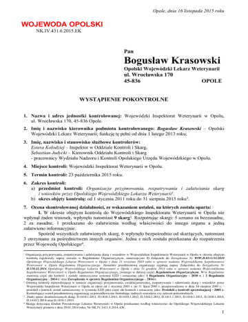 Opole, dnia 16 listopada 2015 roku WOJEWODA OPOLSKI NK.IV.431.6.2015.EK NK.IV.431.6.2015.EK Pan Bogusław Krasowski Opolski Wojewódzki Lekarz Weterynarii ul. Wrocławska 170 45-836 OPOLE WYSTĄPIENIE POKONTROLNE 1. Nazwa i adres jednostki kontrolowanej: Wojewódzki Inspektorat Weterynarii w Opolu, ul. Wrocławska 170, 45-836 Opole. 2. Imię i nazwisko kierownika podmiotu kontrolowanego: Bogusław Krasowski – Opolski Wojewódzki Lekarz Weterynarii; funkcję tę pełni od dnia 1 lutego 2013 roku; 3. Imię, nazwisko i stanowisko służbowe kontrolerów: Estera Kołodziej – Inspektor w Oddziale Kontroli i Skarg, Sebastian Judycki – Kierownik Oddziału Kontroli i Skarg - pracownicy Wydziału Nadzoru i Kontroli Opolskiego Urzędu Wojewódzkiego w Opolu. 4. Miejsce kontroli: Wojewódzki Inspektorat Weterynarii w Opolu. 5. Termin kontroli: 23 października 2015 roku. 6. Zakres kontroli: a) przedmiot kontroli: Organizacja przyjmowania, rozpatrywania i załatwiania skarg i wniosków przez Opolskiego Wojewódzkiego Lekarza Weterynarii1. b) okres objęty kontrolą: od 1 stycznia 2011 roku do 31 sierpnia 2015 roku2. 7. Ocena skontrolowanej działalności, ze wskazaniem ustaleń, na których została oparta: I. W okresie objętym kontrolą do Wojewódzkiego Inspektoratu Weterynarii w Opolu nie wpłynął żaden wniosek, wpłynęło natomiast 9 skarg3. Rozpatrując skargi: 5 uznano za bezzasadne, 2 za zasadne, 1 przekazano do załatwienia według właściwości do innego organu a jedną załatwiono informacyjnie. Spośród wszystkich załatwionych skarg, 6 wpłynęło bezpośrednio od skarżących, natomiast 3 otrzymano za pośrednictwem innych organów. Jedna z nich została przekazana do rozpatrzenia przez Wojewodę Opolskiego4. 1 2 3 4 Organizację przyjmowania, rozpatrywania i załatwiania skarg i wniosków w Wojewódzkim Inspektoracie Weterynarii w Opolu w okresie objętym kontrolą regulowały zapisy zawarte w Regulaminie Organizacyjnym, stanowiącym: 1) Załącznik do Zarządzenia Nr WIW.D.0111/31/2010 Opolskiego Wojewódzkiego Lekarza Weterynarii w Opolu z dnia 21 września 2010 roku w sprawie nadania Wojewódzkiemu Inspektoratowi Weterynarii w Opolu Regulaminu Organizacyjnego. Aktualnie przedmiotową organizację regulują zapisy Załącznika do Zarządzenia Nr D.110.42.2014 Opolskiego Wojewódzkiego Lekarza Weterynarii w Opolu z dnia 31 grudnia 2014 roku w sprawie nadania Wojewódzkiemu Inspektoratowi Weterynarii w Opolu Regulaminu Organizacyjnego, zwanego w dalszej części Regulaminem Organizacyjnym. W/w Regulaminy stanowią część akt kontroli i zostały zamieszczone systemie EZD i oznaczone jako: 1 Regulamin Organizacyjny - 2010 r. i 2 Regulamin Organizacyjny - 2014 r. oraz Zarządzenie w sprawie Regulaminu Organizacyjnego – 2014 r. Ostatnią kontrolę (sprawdzającą) w temacie organizacji przyjmowania, ewidencjonowania, rozpatrywania i załatwiania skarg i wniosków przez Wojewódzki Inspektorat Weterynarii w Opolu za okres od 1 stycznia 2003 r. do 31 lipca 2005 r. przeprowadzono w dniu 30 sierpnia 2005 r. – protokół z kontroli został zamieszczony w systemie EZD jako część akt kontroli i oznaczony jako: Protokół z kontroli sprawdzającej - 2005 r. Kontrolujący ocenił przedmiotową organizację za prawidłową nie formułując żadnych wniosków czy zaleceń pokontrolnych. Znaki spraw skontrolowanych skarg: D.1410.1.2011, D.1410.2.2011, D.1410.1.2012, D.1410.2.2012, D.1411.1.2013, D.1410.1.2013, D.1410.1.2014, D.1410.2.2014 oraz D.1410.1.2015. Skargę dotyczącą działań Powiatowego Lekarza Weterynarii w Opolu przekazano według właściwości do Opolskiego Wojewódzkiego Lekarza Weterynarii pismem z dnia 30.01.2014 roku, Nr NK.IV.1411.8.2014.AW. 1 II. W ramach uzyskanej odpowiedzi na analizę przedkontrolną5 ustalono, że w Wojewódzkim Inspektoracie Weterynarii w Opolu nie przeprowadzano kontroli wewnętrznych, dotyczących organizacji przyjmowania, rozpatrywania i załatwiania skarg i wniosków. Pracownicy zajmujący się załatwianiem skarg nie uczestniczyli w żadnym typowym szkoleniu z powyższego zakresu. Corocznie sporządzano – zgodnie z poleceniem Wojewody Opolskiego – analizę skarg i wniosków za rok ubiegły. III. Na podstawie informacji wywieszonej w siedzibie Inspektoratu ustalono, że Opolski Wojewódzki Lekarz Weterynarii przyjmuje interesantów w sprawach skarg i wniosków w każdy poniedziałek będący dniem pracy, w godz. od 15.00 do 16.00. W razie niemożliwości przyjęcia interesantów przez Opolskiego Wojewódzkiego Lekarza Weterynarii powinność tę wykonuje osoba wskazana każdorazowo przez niego spośród pracowników zajmujących stanowisko kierownika zespołu. IV. Ustalono, że na stronach Biuletynu Informacji Publicznej Wojewódzkiego Inspektoratu Weterynarii w Opolu nie publikowano informacji w sprawie rozpatrywania skarg, zawierających dane osobowe osób skarżących6. V. W Wojewódzkim Inspektoracie Weterynarii w Opolu zasady organizacji przyjmowania, rozpatrywania i załatwiania skarg i wniosków regulują zapisy Regulaminu Organizacyjnego. Zgodnie z § 19 ust. 11 powyższego Regulaminu – Kancelaria w Wojewódzkim Inspektoracie Weterynarii w Opolu zajmuje się prowadzeniem sekretariatu, a w szczególności prowadzeniem rejestru skarg i wniosków. Zadanie to należy do obowiązków Pani Marii Rybak7 – Sekretarki w Kancelarii Wojewódzkiego Inspektoratu Weterynarii. Stosownie do treści § 9 ust. 3 pkt 1 powyższego Regulaminu – Kancelaria podlega bezpośrednio Opolskiemu Wojewódzkiemu Lekarzowi Weterynarii. Przygotowywanie oraz prowadzenie dokumentacji związanej z postępowaniami skargowymi należy – zgodnie z zakresami obowiązków - do zadań: Pani Anny Kwapisz – Dolińskiej8, Pani Kamili Mizery9, Pana Dominika Tomczaka10, Pana Piotra Samol11 oraz Pani Eweliny Piechowiak12. Zgodnie z § 11 ust. 1 pkt 3 powyższego Regulaminu - za merytoryczną i formalno – prawną poprawność załatwianych spraw odpowiadaj