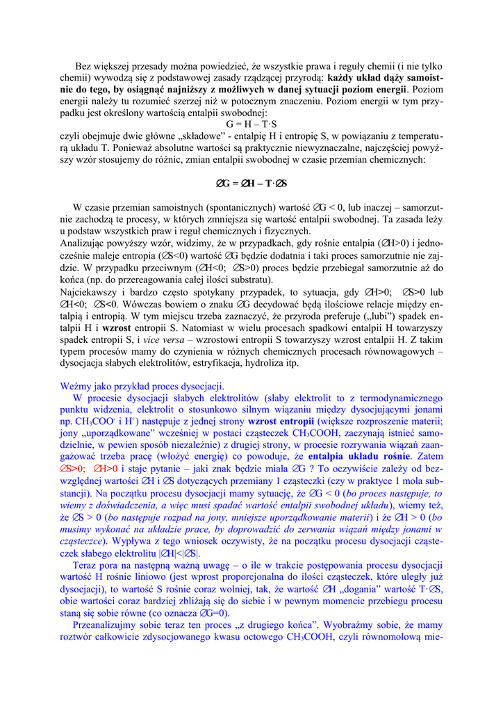 Bez większej przesady można powiedzieć, że wszystkie prawa i reguły chemii (i nie tylko chemii) wywodzą się z podstawowej zasady rządzącej przyrodą: każdy układ dąży samoistnie do tego, by osiągnąć najniższy z możliwych w danej sytuacji poziom energii. Poziom energii należy tu rozumieć szerzej niż w potocznym znaczeniu. Poziom energii w tym przypadku jest określony wartością entalpii swobodnej: G = H – T·S czyli obejmuje dwie główne „składowe” - entalpię H i entropię S, w powiązaniu z temperaturą układu T. Ponieważ absolutne wartości są praktycznie niewyznaczalne, najczęściej powyższy wzór stosujemy do różnic, zmian entalpii swobodnej w czasie przemian chemicznych: ∆G = ∆H – T·∆S W czasie przemian samoistnych (spontanicznych) wartość ∆G < 0, lub inaczej – samorzutnie zachodzą te procesy, w których zmniejsza się wartość entalpii swobodnej. Ta zasada leży u podstaw wszystkich praw i reguł chemicznych i fizycznych. Analizując powyższy wzór, widzimy, że w przypadkach, gdy rośnie entalpia (∆H>0) i jednocześnie maleje entropia (∆S<0) wartość ∆G będzie dodatnia i taki proces samorzutnie nie zajdzie. W przypadku przeciwnym (∆H<0; ∆S>0) proces będzie przebiegał samorzutnie aż do końca (np. do przereagowania całej ilości substratu). Najciekawszy i bardzo często spotykany przypadek, to sytuacja, gdy ∆H>0; ∆S>0 lub ∆H<0; ∆S<0. Wówczas bowiem o znaku ∆G decydować będą ilościowe relacje między entalpią i entropią. W tym miejscu trzeba zaznaczyć, że przyroda preferuje („lubi”) spadek entalpii H i wzrost entropii S. Natomiast w wielu procesach spadkowi entalpii H towarzyszy spadek entropii S, i vice versa – wzrostowi entropii S towarzyszy wzrost entalpii H. Z takim typem procesów mamy do czynienia w różnych chemicznych procesach równowagowych – dysocjacja słabych elektrolitów, estryfikacja, hydroliza itp. Weźmy jako przykład proces dysocjacji. W procesie dysocjacji słabych elektrolitów (słaby elektrolit to z termodynamicznego punktu widzenia, elektrolit o stosunkowo silnym wiązaniu między dysocjującymi jonami np. CH3COO- i H+) następuje z jednej strony wzrost entropii (większe rozproszenie materii; jony „uporządkowane” wcześniej w postaci cząsteczek CH3COOH, zaczynają istnieć samodzielnie, w pewien sposób niezależnie) z drugiej strony, w procesie rozrywania wiązań zaangażować trzeba pracę (włożyć energię) co powoduje, że entalpia układu rośnie. Zatem ∆S>0; ∆H>0 i staje pytanie – jaki znak będzie miała ∆G ? To oczywiście zależy od bezwzględnej wartości ∆H i ∆S dotyczących przemiany 1 cząsteczki (czy w praktyce 1 mola substancji). Na początku procesu dysocjacji mamy sytuację, że ∆G < 0 (bo proces następuje, to wiemy z doświadczenia, a więc musi spadać wartość entalpii swobodnej układu), wiemy też, że ∆S > 0 (bo następuje rozpad na jony, mniejsze uporządkowanie materii) i że ∆H > 0 (bo musimy wykonać na układzie prace, by doprowadzić do zerwania wiązań między jonami w cząsteczce). Wypływa z tego wniosek oczywisty, że na początku procesu dysocjacji cząsteczek słabego elektrolitu |∆H|<|∆S|. Teraz pora na następną ważną uwagę – o ile w trakcie postępowania procesu dysocjacji wartość H rośnie liniowo (jest wprost proporcjonalna do ilości cząsteczek, które uległy już dysocjacji), to wartość S rośnie coraz wolniej, tak, że wartość ∆H „dogania” wartość T·∆S, obie wartości coraz bardziej zbliżają się do siebie i w pewnym momencie przebiegu procesu staną się sobie równe (co oznacza ∆G=0). Przeanalizujmy sobie teraz ten proces „z drugiego końca”. Wyobraźmy sobie, że mamy roztwór całkowicie zdysocjowanego kwasu octowego CH3COOH, czyli równomolową mie- szaninę jonów CH3COO- i H+. Jony, łącząc się w cząsteczki kwasu uwalniają energię (skoro do rozerwania wiązania potrzeba pracy (wkład energii) to proces odwrotny wyzwala taką samą ilość energii), czyli ∆H < 0, ale jednocześnie następuje „porządkowanie” układu („niezależne” jony łączą się w większe, zorganizowane struktury cząsteczek kwasu octowego), czyli ∆S < 0. Podobnie jak poprzednio „zysk” energetyczny zmienia się liniowo (uwalnia się energia; ∆H<0) a „strata” z powodu zmniejszenia entropii (∆S<0) rośnie coraz szybciej, aż do momentu, gdy wartości ∆H i T·∆S się zrównają i znów mamy stan, gdy ∆G=0. Tak więc widać, że niezależnie od stanu wyjściowego, układ zawsze „zatrzyma” proces w momencie, gdy ∆G=0, czyli w stanie równowagi termodynamicznej. Stan ten zależy od właściwości samej substancji (ilość energii potrzebnej do rozerwania wiązania, ilość i wielkość powstałych elementów np. jonów) oraz od temperatury (czynnik zawarty w członie T·∆S). Elektrolity silne, to takie, w których energia wiązania jest na tyle niewielka, że „zysk” spowodowany dysocjacją, a związany ze wzrostem entropii (∆S>0) aż do końca procesu przewyższa „straty” związane ze wzrostem entalpii, towarzyszącym rozrywaniu wiązań (∆H>0) i w związku z tym w żadnym momencie ∆G nie osiąga wartości równej lub większej od zera. Proces przebiega więc samorzutnie aż do końca (do całkowitego zdysocjowania cząsteczek). Stan równowagi, to stan, w którym tak samo szybko przebiega proces w jednym kierunku (np. dysocjacja, hydroliza estru) co i kierunku przeciwnym (reakcja odwrotna, łączenie się jonów, estryfikacja). Tak więc w ujęciu makroskopowym „nic się nie dzieje” - stężenia, skład mieszaniny równowagowej jest stabilny. W ujęciu stanów cząsteczkowych cały czas biegną reakcje w obu kierunkach z taka sama szybkością – równowaga dynamiczna. Z tej głównej zasady, o której mówimy oraz pochodnych zasad (zasady termodynamiki) wyprowadzono dość ogólny parametr, ale stosowany do szczegó