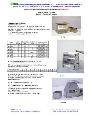 EMEL Przedsiębiorstwo Produkcyjno-Handlowe S.C. tel./fax 022 408 33 28 04-320 Warszawa ul.Pokrzywnicka 12 GSM 0-602 28 68 59 e-mail : [email protected] www.emel.rubikon.pl Dystrybutor sprzętu laboratoryjnego włoskiej firmy TECNOTEST KARTA KATALOGOWA Splitter – Rozdzielacz próbek ROZDZIELACZ PRÓBEK Zgodność z normami : EN 932/1, BS 1377, ASTM C 702, ASTM C 136, D 271-D 421 Używany do szybkiego wyodrębnienia reprezentatywnej próbki materiałów sypkich. Rozdzielacze ( splitery ) wykonane są ze stali. Każdy posiada 3 kuwety odbiorcze. A 173 Model A 172 A 172/2 A 173 A 173/1 A 173/3 A 173/4 A 173/5 A 173/6 A 173/2 Liczba slotów Szerokość otworów mm cale 12 12 10 10 10 8 8 8 8 7 15 19 25 30 38 45 50 64 Wymiary mm 150x140x200 (h) 250x240x250 (h) 270x220x250 (h) 320x240x280 (h) 360x250x310 (h) 361x250x310 (h) 460x250x360 (h) 500x250x360 (h) 650x310x420 (h) ¾ 1 1½ 2 2½ A 174 ROZDZIELACZ DUŻY Max otwór 108 mm Główną cechą tego rozdzielacza jest możliwość wymiany elementów dzielących próbkę. Wymiar otworu mm Liczba slotów 12 36 24 18 36 12 48 8 60 6 72 6 Wykonane ze stali pokrytej ochronną warstwą cynku. Dwie kuwety odbiorcze w wyposażeniu standardowym. Wymiary : 550 x 400 x 800 (h) mm. Waga : 45 kg Części zapasowe : 84 4 96 4 108 4 A 174 A 174/V Kuweta odbiorcza do A 174 A 173/M ROZDZIELACZ PRÓBEK PIASKU Wykonany ze stali nierdzewnej. Posiada 12 slotów o wymiarze 5 mm. Dostarczany z 3-ma kuwetami. Wymiary : 135 x 135 x 160 (h) mm. Waga : 1 kg A 173/M EMEL PPH S.C. Biuro Handlowe : 04-359 Warszawa ul.Kobielska 6/133 tel./fax 022 408 33 28 GSM 0-602 28 68 59 e-mail : [email protected] www.emel.rubikon.pl