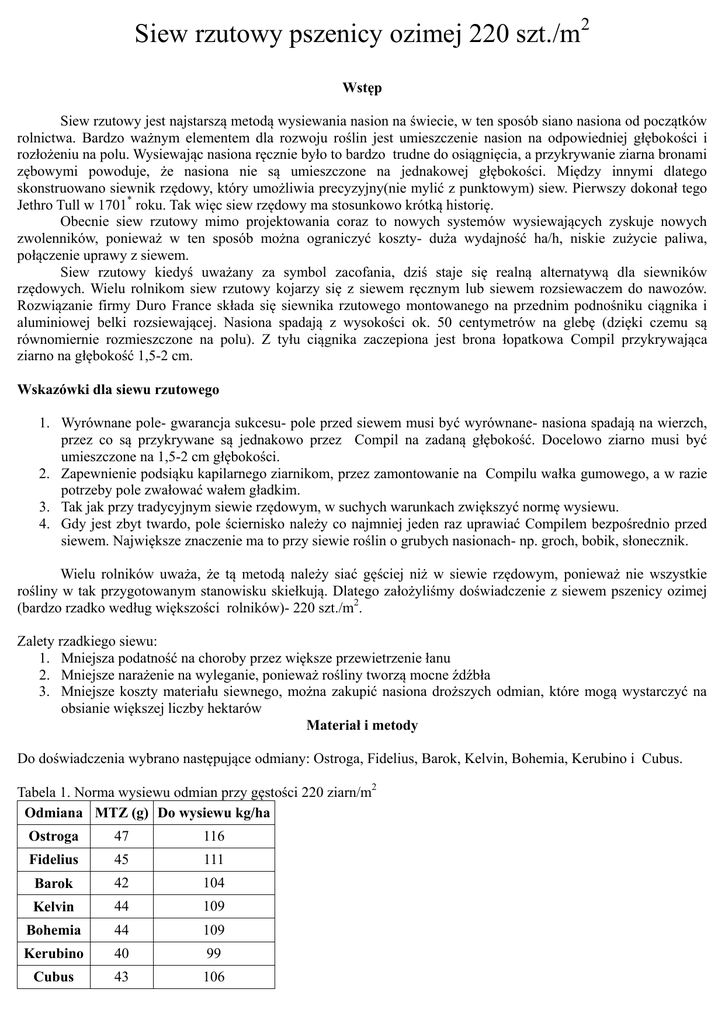 Siew rzutowy pszenicy ozimej 220 szt./m2 Wstęp Siew rzutowy jest najstarszą metodą wysiewania nasion na świecie, w ten sposób siano nasiona od początków rolnictwa. Bardzo ważnym elementem dla rozwoju roślin jest umieszczenie nasion na odpowiedniej głębokości i rozłożeniu na polu. Wysiewając nasiona ręcznie było to bardzo trudne do osiągnięcia, a przykrywanie ziarna bronami zębowymi powoduje, że nasiona nie są umieszczone na jednakowej głębokości. Między innymi dlatego skonstruowano siewnik rzędowy, który umożliwia precyzyjny(nie mylić z punktowym) siew. Pierwszy dokonał tego Jethro Tull w 1701* roku. Tak więc siew rzędowy ma stosunkowo krótką historię. Obecnie siew rzutowy mimo projektowania coraz to nowych systemów wysiewających zyskuje nowych zwolenników, ponieważ w ten sposób można ograniczyć koszty- duża wydajność ha/h, niskie zużycie paliwa, połączenie uprawy z siewem. Siew rzutowy kiedyś uważany za symbol zacofania, dziś staje się realną alternatywą dla siewników rzędowych. Wielu rolnikom siew rzutowy kojarzy się z siewem ręcznym lub siewem rozsiewaczem do nawozów. Rozwiązanie firmy Duro France składa się siewnika rzutowego montowanego na przednim podnośniku ciągnika i aluminiowej belki rozsiewającej. Nasiona spadają z wysokości ok. 50 centymetrów na glebę (dzięki czemu są równomiernie rozmieszczone na polu). Z tyłu ciągnika zaczepiona jest brona łopatkowa Compil przykrywająca ziarno na głębokość 1,5-2 cm. Wskazówki dla siewu rzutowego 1. Wyrównane pole- gwarancja sukcesu- pole przed siewem musi być wyrównane- nasiona spadają na wierzch, przez co są przykrywane są jednakowo przez Compil na zadaną głębokość. Docelowo ziarno musi być umieszczone na 1,5-2 cm głębokości. 2. Zapewnienie podsiąku kapilarnego ziarnikom, przez zamontowanie na Compilu wałka gumowego, a w razie potrzeby pole zwałować wałem gładkim. 3. Tak jak przy tradycyjnym siewie rzędowym, w suchych warunkach zwiększyć normę wysiewu. 4. Gdy jest zbyt twardo, pole ściernisko należy co najmniej jeden raz uprawiać Compilem bezpośrednio przed siewem. Największe znaczenie ma to przy siewie roślin o grubych nasionach- np. groch, bobik, słonecznik. Wielu rolników uważa, że tą metodą należy siać gęściej niż w siewie rzędowym, ponieważ nie wszystkie rośliny w tak przygotowanym stanowisku skiełkują. Dlatego założyliśmy doświadczenie z siewem pszenicy ozimej (bardzo rzadko według większości rolników)- 220 szt./m2. Zalety rzadkiego siewu: 1. Mniejsza podatność na choroby przez większe przewietrzenie łanu 2. Mniejsze narażenie na wyleganie, ponieważ rośliny tworzą mocne źdźbła 3. Mniejsze koszty materiału siewnego, można zakupić nasiona droższych odmian, które mogą wystarczyć na obsianie większej liczby hektarów Materiał i metody Do doświadczenia wybrano następujące odmiany: Ostroga, Fidelius, Barok, Kelvin, Bohemia, Kerubino i Cubus. Tabela 1. Norma wysiewu odmian przy gęstości 220 ziarn/m2 Odmiana MTZ (g) Do wysiewu kg/ha Ostroga 47 116 Fidelius 45 111 Barok 42 104 Kelvin 44 109 Bohemia 44 109 Kerubino 40 99 Cubus 43 106 W zależności od MTZ poszczególnych odmian było to 99-116 kg/ha. Bardzo istotne w tym doświadczeniu łanowym było zbadanie poszczególnych składowych plonu pszenicy ozimej: liczby roślin po zimie/m2, liczby pędów/m2, liczby kłosów oraz masy tysiąca ziaren (MTZ). Było to wykonywane w 3 powtórzeniach w odmianie, na powierzchni 1 m2, za każdym razem w tym samym miejscu. Powierzchnia jednego pasa z badaną odmianą wynosiła ok. 1,5 ha. Łącznie doświadczenie zajmowało powierzchnię ok. 10 ha. Celowo wybrano tak dużą powierzchnię, aby wyniki nie miały jedynie charakteru doświadczalnego, a żeby były jak najbardziej przydatne i wiarygodne dla rolników. Doświadczenie zostało założone na glebie klasy IVa-b (piasek). Cel doświadczenia: Sprawdzenie czy konkretna odmiana reaguje na dawkę siewu, oraz czy norma wysiewu 220 szt/m2 ma wpływ na parametry składowe plonu pszenicy ozimej siedmiu wybranych odmian. Określenie jaka gęstość najlepiej plonuje do jakiej gęstości można redukować normę wysiewu. Zabiegi agrotechniczne Nawożenie: Ze względu na wysoką zasobność gleby w fosfor, potas zrezygnowano z nawożenia tymi makroskładnikami. 04. 03. 2013 r. 223 l/ha RSM 28%- 80 kg/ha N 08. 04. 2013 r. 237 l/ha RSM 32%- 100 kg/ha N 09. 03. 2013 r. siarczan magnezu (kizeryt) 145 kg/ha 06. 06. 2013 r. 60 kg/ha saletry amonowej- 20 kg/ha N Ochrona roślin 19.10. 2012 r. jodosulfuron metylowy 5g/ha+2,4 D 188,5 g/ha + diflufenikan 50 g/ha + chlorotoluron 500 g/ha +zeta cypermetryna 0,12 g/ha 06. 05. 2013 r. florasulam 1,87g/ha+ 2,4 D 250 g/ha + fenpropimorf 100 g/ha + epoksykonazol 31,7 g/ha + metrafenon 37,5 g/ha 20. 05. 2013 r. chlorotalonil 500 g/ha + azoksystrobina 50g/ha + izopirazam 50 g/ha + epoksykonazol 36 g/ha + etefon 160 g/ha 07.06. 2013 r. azoksystrobina 50g/ha + tiofanat metylowy 93 g/ha + epoksykonazol 62 g/ha + tebukonazol 100 g/ha + zetacypermetryna 10 g/ha + siarczan magnezu 3 kg/ha Porównanie odmian pszenicy ozimej, wyniki z 3 powtórzeń (1m2 na odmianie Odmiana Ostroga Fidelius Kerubino Bohemia Kelvin Barok Cubus Liczba roślin 15 04 141 167 159 187 140 153 180 Liczba pędów 02 05 1032 887 1154 1102 1083 1094 1044 Liczba pędów/rośli nę 7,3 5,3 7,2 5,9 7,7 7,2 5,8 Liczba kłosów 456 428 518 397 472 379 474 Liczba kłosów/rośli nę 3,3 2,6 3,3 2,1 3,4 2,7 2,6 Liczba ziarn/kłos 29 35 29 30 39 43 33 MTZ w (g) 56,33 55,93 51,12 55,96 44,98 47,46 46,99 Plon t/ha (z 1 m2) 7,5 8,4 7,6 6,6 8,3 7,8 7,3 Plon t/ha zbiór kombajnow y Waga hektolitra 6,06 6,78 7,4 6,7 8,03 7,79 8,02 76 73 74 72 73 72 75 Obsada roślin poszczególnych odmian po zimie była bardzo zróżnicowana. Różnica pomiędzy odmianą która miała najwięcej roślin (Bohemia) a odmianą o najmniejszej liczbie roślin (Kelvin) wyniosła 26%. Trzeba 