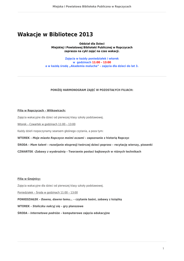 Miejska i Powiatowa Biblioteka Publiczna w Ropczycach Wakacje w Bibliotece 2013 Oddział dla Dzieci Miejskiej i Powiatowej Biblioteki Publicznej w Ropczycach zaprasza na cykl zajęć na czas wakacji. Zajęcia w każdy poniedziałek i wtorek w godzinach 11:00 – 13:00 a w każdą środę „Akademia malucha” – zajęcia dla dzieci do lat 3. PONIŻEJ HARMONOGRAM ZAJĘĆ W POZOSTAŁYCH FILIACH: Filia w Ropczycach – Witkowicach: Zajęcia wakacyjne dla dzieci od pierwszej klasy szkoły podstawowej. Wtorek – Czwartek w godzinach 11:00 – 13:00 Każdy dzień rozpoczynamy seansem głośnego czytania, a poza tym: WTOREK – Moje miasto Ropczyce moimi oczami – zapoznanie z historią Ropczyc ŚRODA – Mam talent – rozwijanie ekspresji twórczej dzieci poprzez – recytację wierszy, piosenki CZWARTEK –Zabawy z wyobraźnią – Tworzenie postaci bajkowych w różnych technikach Filia w Gnojnicy: Zajęcia wakacyjne dla dzieci od pierwszej klasy szkoły podstawowej. Poniedziałek – Środa w godzinach 11:00 – 13:00 PONIEDZIAŁEK – Dawno, dawno temu… – czytanie baśni, zabawy z książką WTOREK – Stoliczku nakryj się – gry planszowe ŚRODA – Internetowe podróże – komputerowe zajęcia edukacyjne 1 Miejska i Powiatowa Biblioteka Publiczna w Ropczycach Filia w Brzezówce: Zajęcia wakacyjne dla dzieci od pierwszej klasy szkoły podstawowej. Poniedziałek – Środa w godzinach 13:00 – 15:00 PONIEDZIAŁEK – Spotkanie w świecie książki – kluczem do mądrości – głośne czytanie, zabawy z książką, konkursy literackie WTOREK – Moc pomysłów na nudę, czyli dla każdego coś ciekawego – zajęcia plastyczne, plakat na ulubioną książkę, pocztówka z wakacji ŚRODA – Biblioteka ciągle w grze – coś dla ciała i umysłu – gry towarzyskie i planszowe, konkursy, układanie puzzli, kalambury, krzyżówki, zagadki Filia w Lubzinie: Zajęcia wakacyjne dla dzieci od pierwszej klasy szkoły podstawowej. Poniedziałek – Środa w godzinach 11:00 – 13:00 PONIEDZIAŁEK – Letnie czytanie na zawołanie – głośne czytanie i zabawy słowne WTOREK – Pobudzam fantazję, umysł trenuję i od myślenia się nie wymiguję – zabawy literackie i umysłowe: quizy, kalambury, łamigłówki, rebusy i zagadki, gry komputerowe ŚRODA – W zdrowym ciele zdrowy duch – zabawy na świeżym powietrzu Filia w Niedźwiadzie: Zajęcia wakacyjne dla dzieci od pierwszej klasy szkoły podstawowej. Poniedziałek – Środa w godzinach 11:00 – 13:00 PONIEDZIAŁEK – Poczytajmy, posłuchajmy – głośne czytanie dzieciom i przez dzieci, ilustracje do przeczytanego tekstu. WTOREK – Południe z rozrywką – gry planszowe, układanie puzzli ŚRODA –Letnie rozmaitości – zajęcia komputerowe 2 Miejska i Powiatowa Biblioteka Publiczna w Ropczycach SERDECZNIE ZAPRASZAMY ! 3