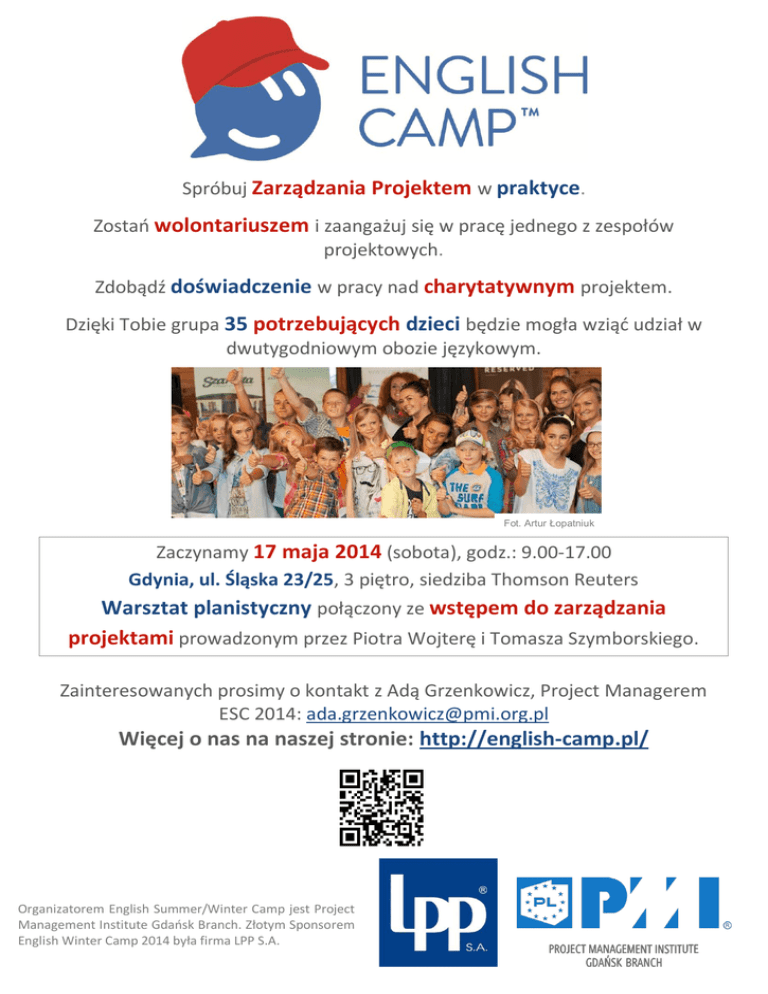 Spróbuj Zarządzania Projektem w praktyce. Zostań wolontariuszem i zaangażuj się w pracę jednego z zespołów projektowych. Zdobądź doświadczenie w pracy nad charytatywnym projektem. Dzięki Tobie grupa 35 potrzebujących dzieci będzie mogła wziąć udział w dwutygodniowym obozie językowym. Fot. Artur Łopatniuk Zaczynamy 17 maja 2014 (sobota), godz.: 9.00-17.00 Gdynia, ul. Śląska 23/25, 3 piętro, siedziba Thomson Reuters Warsztat planistyczny połączony ze wstępem do zarządzania projektami prowadzonym przez Piotra Wojterę i Tomasza Szymborskiego. Zainteresowanych prosimy o kontakt z Adą Grzenkowicz, Project Managerem ESC 2014: [email protected] Więcej o nas na naszej stronie: http://english-camp.pl/ Organizatorem English Summer/Winter Camp jest Project Management Institute Gdańsk Branch. Złotym Sponsorem English Winter Camp 2014 była firma LPP S.A.