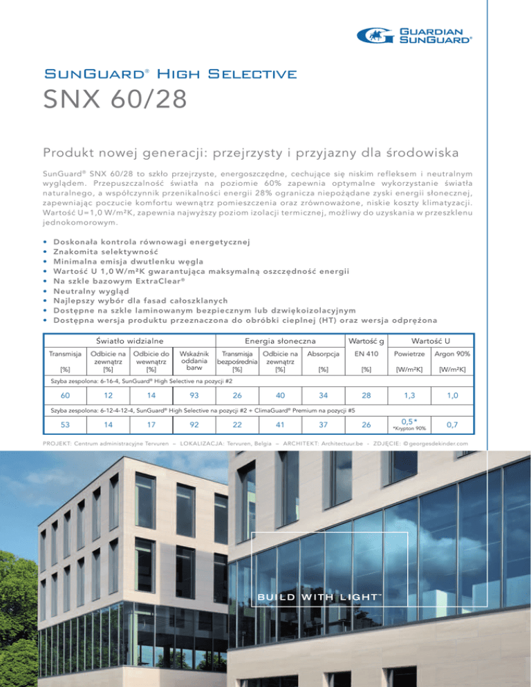 SunGuard High Selective ® SNX 60/28 Produkt nowej generacji: przejrzysty i przyjazny dla środowiska SunGuard ® SNX 60/28 to szkło przejrzyste, energoszczędne, cechujące się niskim refleksem i neutralnym wyglądem. Przepuszczalność światła na poziomie 60% zapewnia optymalne wykorzystanie światła naturalnego, a współczynnik przenikalności energii 28% ogranicza niepożądane zyski energii słonecznej, zapewniając poczucie komfortu wewnątrz pomieszczenia oraz zrównoważone, niskie koszty klimatyzacji. Wartość U=1,0 W/m²K, zapewnia najwyższy poziom izolacji termicznej, możliwy do uzyskania w przeszklenu jednokomorowym. • • • • • • • • • Doskonała kontrola równowagi energetycznej Znakomita selektywność Minimalna emisja dwutlenku węgla Wartość U 1,0 W/m²K gwarantująca maksymalną oszczędność energii Na szkle bazowym ExtraClear ® Neutralny wygląd Najlepszy wybór dla fasad całoszklanych Dostępne na szkle laminowanym bezpiecznym lub dzwiękoizolacyjnym Dostępna wersja produktu przeznaczona do obróbki cieplnej (HT) oraz wersja odprężona Światło widzialne Transmisja [%] Odbicie na zewnątrz [%] Odbicie do wewnątrz [%] Energia słoneczna Wskaźnik oddania barw Transmisja Odbicie na bezpośrednia zewnątrz [%] [%] Wartość g Wartość U Absorpcja EN 410 Powietrze Argon 90% [%] [%] [W/m²K] [W/m²K] 34 28 1,3 1,0 26 *Krypton 90% 0,5 * 0,7 Szyba zespolona: 6-16-4, SunGuard High Selective na pozycji #2 ® 60 12 14 93 26 40 Szyba zespolona: 6-12-4-12-4, SunGuard® High Selective na pozycji #2 + ClimaGuard® Premium na pozycji #5 53 14 17 92 22 41 37 PROJEKT: Centrum administracyjne Tervuren – LOKALIZACJA: Tervuren, Belgia – ARCHITEKT: Architectuur.be - ZDJĘCIE: © georgesdekinder.com Produkty serii SunGuard ® dostępne są w różnych miejscach w Europie za pośrednictwem niezależnej sieci zakładów przetwarzających szkło GUARDIANa. W celu uzyskania dodatkowych informacji, należy skontaktować się z lokalnym przedstawicielem firmy GUARDIAN. GUARDIAN Industries U.K. Ltd. GUARDIAN Luxguard I, S.A. GUARDIAN Glass España, S.L. GUARDIAN Orosháza Kft. United Kingdom Luxembourg Spain Hungary Phone: 0044 (0) 800 032 6322 Phone: 00 352 50301 Phone: 00 34 948 817255 Phone: 0036 (0) 68 887 200 e-Mail: [email protected] e-Mail: sales_bascharage@ e-Mail: [email protected] e-Mail: oroshaza_sales@ guardian.com guardian.com GUARDIAN Thalheim GmbH GUARDIAN Częstochowa Sp. z o.o. GUARDIAN Steklo Ryazan LLC Germany Poland Russia Phone: 0049 (0) 3494 361 800 Phone: 0048 (0) 34 323 9200 Phone: 007 (8) 4912 956600 e-Mail: anwendungstechnik@ e-Mail: tech_poland@ e-Mail: [email protected] guardian.com guardian.com Podane wartości są wartościami nominalnymi podlegającymi tolerancjom produkcyjnym. Podane wartości spektrofotometryczne są zgodne z EN 410; wartości współczynnika przenikania ciepła U są zgodne z EN 673. Sprzedaż produktów przedstawionych w tej publikacji podlega ogólnym warunkom sprzedaży firmy GUARDIAN, jak rownież dodatkowym obowiązującym pisemnym gwarancjom. Nabywca jest odpowiedzialny za potwierdzenie, że produkty są odpowiednie do ich zamierzonego zastosowania. W celu uzyskania wszelkich stosownych instrukcji użytkowania i obsługi, jak rownież aktualnych informacji o produkcie, prosimy o kontakt z Państwa lokalnym przedstawicielem firmy GUARDIAN. www.sunguardglass.pl GUARDIAN Europe Numer referencyjny: 6-16-4 & 6-12-4-12-4 / HS SNX 60/28 / PL / 09-12 ©2012 GUARDIAN Industries Corp. Nazwa SunGuard ® jest zastrzeżonym znakiem towarowym należącym do GUARDIAN Industries Corp.