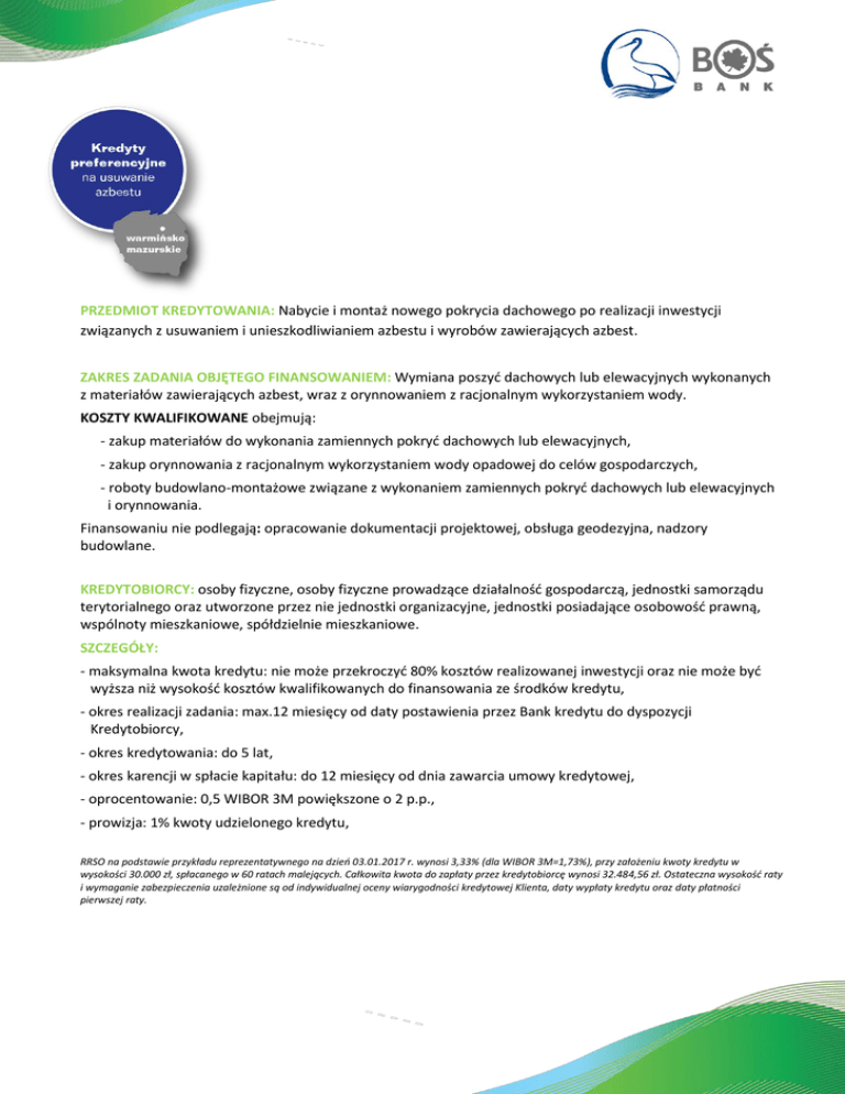 PRZEDMIOT KREDYTOWANIA: Nabycie i montaż nowego pokrycia dachowego po realizacji inwestycji związanych z usuwaniem i unieszkodliwianiem azbestu i wyrobów zawierających azbest. ZAKRES ZADANIA OBJĘTEGO FINANSOWANIEM: Wymiana poszyć dachowych lub elewacyjnych wykonanych z materiałów zawierających azbest, wraz z orynnowaniem z racjonalnym wykorzystaniem wody. KOSZTY KWALIFIKOWANE obejmują: - zakup materiałów do wykonania zamiennych pokryć dachowych lub elewacyjnych, - zakup orynnowania z racjonalnym wykorzystaniem wody opadowej do celów gospodarczych, - roboty budowlano-montażowe związane z wykonaniem zamiennych pokryć dachowych lub elewacyjnych i orynnowania. Finansowaniu nie podlegają: opracowanie dokumentacji projektowej, obsługa geodezyjna, nadzory budowlane. KREDYTOBIORCY: osoby fizyczne, osoby fizyczne prowadzące działalność gospodarczą, jednostki samorządu terytorialnego oraz utworzone przez nie jednostki organizacyjne, jednostki posiadające osobowość prawną, wspólnoty mieszkaniowe, spółdzielnie mieszkaniowe. SZCZEGÓŁY: - maksymalna kwota kredytu: nie może przekroczyć 80% kosztów realizowanej inwestycji oraz nie może być wyższa niż wysokość kosztów kwalifikowanych do finansowania ze środków kredytu, - okres realizacji zadania: max.12 miesięcy od daty postawienia przez Bank kredytu do dyspozycji Kredytobiorcy, - okres kredytowania: do 5 lat, - okres karencji w spłacie kapitału: do 12 miesięcy od dnia zawarcia umowy kredytowej, - oprocentowanie: 0,5 WIBOR 3M powiększone o 2 p.p., - prowizja: 1% kwoty udzielonego kredytu, RRSO na podstawie przykładu reprezentatywnego na dzień 03.01.2017 r. wynosi 3,33% (dla WIBOR 3M=1,73%), przy założeniu kwoty kredytu w wysokości 30.000 zł, spłacanego w 60 ratach malejących. Całkowita kwota do zapłaty przez kredytobiorcę wynosi 32.484,56 zł. Ostateczna wysokość raty i wymaganie zabezpieczenia uzależnione są od indywidualnej oceny wiarygodności kredytowej Klienta, daty wypłaty kredytu oraz daty płatności pierwszej raty.