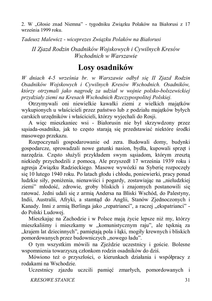 2. W „Głosie znad Niemna” - tygodniku Związku Polaków na Białorusi z 17 września 1999 roku. Tadeusz Malewicz - wiceprezes Związku Polaków na Białorusi II Zjazd Rodzin Osadników Wojskowych i Cywilnych Kresów Wschodnich w Warszawie Losy osadników W dniach 4-5 września br. w Warszawie odbył się II Zjazd Rodzin Osadników Wojskowych i Cywilnych Kresów Wschodnich. Osadników, którzy otrzymali jako nagrodę za udział w wojnie polsko-bolszewickiej przydziały ziemi na Kresach Wschodnich Rzeczypospolitej Polskiej. Otrzymywali oni niewielkie kawałki ziemi z wielkich majątków wykupionych u właścicieli przez państwo lub z podziału majątków byłych carskich urzędników i właścicieli, którzy wyjechali do Rosji. A więc mieszkaniec wsi - Białorusin nie był skrzywdzony przez sąsiada-osadnika, jak to często starają się przedstawiać niektóre środki masowego przekazu. Rozpoczynali gospodarowanie od zera. Budowali domy, budynki gospodarcze, sprowadzali nowe gatunki nasion, bydła, kupowali sprzęt i narzędzia. Często służyli przykładem swym sąsiadom, którym zresztą niekiedy przychodzili z pomocą. Ale przyszedł 17 września 1939 roku i agresja Związku Radzieckiego. Masowe wywózki na Syberię rozpoczęły się 10 lutego 1940 roku. Po latach głodu i chłodu, poniewierki, pracy ponad ludzkie siły, poniżenia, nienawiści i pogardy, zostawiając na „nieludzkiej ziemi” młodość, zdrowie, groby bliskich i znajomych postanowili się ratować. Jedni udali się z armią Andersa na Bliski Wschód, do Palestyny, Indii, Australii, Afryki, a stamtąd do Anglii, Stanów Zjednoczonych i Kanady. Inni z armią Berlinga jako „repatrianci”, a raczej „ekspatrianci” do Polski Ludowej. Mieszkając na Zachodzie i w Polsce mają życie lepsze niż my, którzy mieszkaliśmy i mieszkamy w „komunistycznym raju”, ale tęsknią za „krajem lat dziecinnych”, pamiętają pola i łąki, mogiły krewnych i bliskich pomordowanych przez budowniczych „nowego ładu”. O tym wszystkim mówili na Zjeździe uczestnicy i goście. Bolesne wspomnienia towarzyszą członkom rodzin osadników do dziś. Mówiono też o przyszłości, o kierunkach działania i współpracy z rodakami na Wschodzie. Uczestnicy zjazdu uczcili pamięć zmarłych, pomordowanych i KRESOWE STANICE 31 zaginionych osadników chwilą ciszy. Pierwszy dzień zjazdu uświetnił akowiec kapitan S. Siemiątkowski, który odczytał swój poemat o walce oddziału AK z Niemcami pod Bieniakoniami. Podczas kolacji śpiewano piosenki przedwojenne, ludowe, piosenki z dzieciństwa. W Katedrze Polowej Wojska Polskiego została odprawiona Msza św. w intencji ojców żołnierzy, matek, które ratowały na wygnaniu życie dzieci, niemowląt i dzieci, które ginęły, zmarłych i żyjących osadników. Na zakończenie mszy zabrzmiała przepiękna pieśń. Z piersi uczestników zjazdu płynęły słowa: „Przed twe Ołtarze Zanosim wołanie: Ojczyznę wolną Pobłogosław Panie!” Następnie odbyło się złożenie wieńców i kwiatów przy Grobie Nieznanego Żołnierza, pomniku Marszałka Piłsudskiego, pomniku Sybirakom. Na podkładach pomnika Sybirakom wyryte są nazwy miejscowości skąd wywożono na Syberię, a także nazwy miejsc masowych mordów i kaźni: Berezwecz, Ihumeń, Kuropaty, Mińsk, Łuniniec, Pińsk, Grodno, Stołbce, Baranowicze, Dzisna, Wilejka, Kodziowce, a także liczne nazwy miejscowości syberyjskich i kazachstańskich dokąd byli wywożeni Polacy, w tym i osadnicy. Złożeniu kwiatów przy Grobie Nieznanego Żołnierza towarzyszyły zmiana warty honorowej i defilada kompanii reprezentacyjnej Wojsk Lądowych z orkiestrą. W imieniu Zarządu Głównego ZPB złożyłem uczestnikom zjazdu najserdeczniejsze życzenia zdrowia, pogody ducha, wytrwałości, aktywności społecznej w swoich środowiskach. 32 KRESOWE STANICE