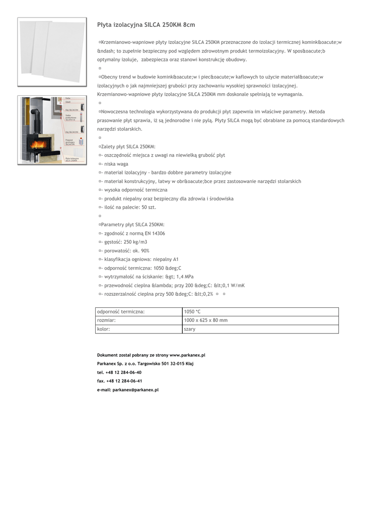 Płyta izolacyjna SILCA 250KM 8cm Krzemianowo-wapniowe płyty izolacyjne SILCA 250KM przeznaczone do izolacji termicznej kominków – to zupełnie bezpieczny pod względem zdrowotnym produkt termoizolacyjny. W sposób optymalny izoluje, zabezpiecza oraz stanowi konstrukcję obudowy. Obecny trend w budowie kominków i pieców kaflowych to użycie materiałów izolacyjnych o jak najmniejszej grubości przy zachowaniu wysokiej sprawności izolacyjnej. Krzemianowo-wapniowe płyty izolacyjne SILCA 250KM mm doskonale spełniają te wymagania. Nowoczesna technologia wykorzystywana do produkcji płyt zapewnia im właściwe parametry. Metoda prasowanie płyt sprawia, iż są jednorodne i nie pylą. Płyty SILCA mogą być obrabiane za pomocą standardowych narzędzi stolarskich. Zalety płyt SILCA 250KM: - oszczędność miejsca z uwagi na niewielką grubość płyt - niska waga - materiał izolacyjny - bardzo dobbre parametry izolacyjne - materiał konstrukcyjny, łatwy w obróbce przez zastosowanie narzędzi stolarskich - wysoka odporność termiczna - produkt niepalny oraz bezpieczny dla zdrowia i środowiska - ilość na palecie: 50 szt. Parametry płyt SILCA 250KM: - zgodność z normą EN 14306 - gęstość: 250 kg/m3 - porowatość: ok. 90% - klasyfikacja ogniowa: niepalny A1 - odporność termiczna: 1050 °C - wytrzymałość na ściskanie: > 1,4 MPa - przewodność cieplna λ przy 200 °C: <0,1 W/mK - rozszerzalność cieplna przy 500 °C: <0,2% odporność termiczna: 1050 *C rozmiar: 1000 x 625 x 80 mm kolor: szary Dokument został pobrany ze strony www.parkanex.pl Parkanex Sp. z o.o. Targowisko 501 32-015 Kłaj tel. +48 12 284-06-40 fax. +48 12 284-06-41 e-mail: [email protected]