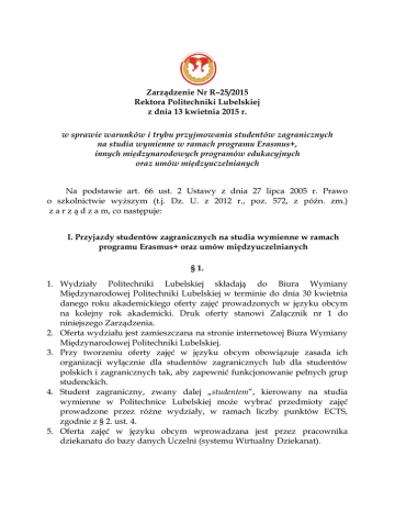 Zarządzenie Nr R–25/2015 Rektora Politechniki Lubelskiej z dnia 13 kwietnia 2015 r. w sprawie warunków i trybu przyjmowania studentów zagranicznych na studia wymienne w ramach programu Erasmus+, innych międzynarodowych programów edukacyjnych oraz umów międzyuczelnianych Na podstawie art. 66 ust. 2 Ustawy z dnia 27 lipca 2005 r. Prawo o szkolnictwie wyższym (t.j. Dz. U. z 2012 r., poz. 572, z późn. zm.) z a r z ą d z a m, co następuje: I. Przyjazdy studentów zagranicznych na studia wymienne w ramach programu Erasmus+ oraz umów międzyuczelnianych § 1. 1. Wydziały Politechniki Lubelskiej składają do Biura Wymiany Międzynarodowej Politechniki Lubelskiej w terminie do dnia 30 kwietnia danego roku akademickiego oferty zajęć prowadzonych w języku obcym na kolejny rok akademicki. Druk oferty stanowi Załącznik nr 1 do niniejszego Zarządzenia. 2. Oferta wydziału jest zamieszczana na stronie internetowej Biura Wymiany Międzynarodowej Politechniki Lubelskiej. 3. Przy tworzeniu oferty zajęć w języku obcym obowiązuje zasada ich organizacji wyłącznie dla studentów zagranicznych lub dla studentów polskich i zagranicznych tak, aby zapewnić funkcjonowanie pełnych grup studenckich. 4. Student zagraniczny, zwany dalej „studentem”, kierowany na studia wymienne w Politechnice Lubelskiej może wybrać przedmioty zajęć prowadzone przez różne wydziały, w ramach liczby punktów ECTS, zgodnie z § 2. ust. 4. 5. Oferta zajęć w języku obcym wprowadzana jest przez pracownika dziekanatu do bazy danych Uczelni (systemu Wirtualny Dziekanat). § 2. 1. Studenci ubiegający się o przyjęcie do Politechniki Lubelskiej na studia wymienne wypełniają dokumenty dostępne na stronie internetowej Biura Wymiany Międzynarodowej Politechniki Lubelskiej, które obowiązują w procedurze kwalifikacyjnej na studia wymienne, tj.: formularz aplikacyjny oraz porozumienie o programie zajęć, zwane dalej „Learning Agreement”. Ponadto studenci dostarczają potwierdzenie znajomości języka obcego, w którym będą prowadzone zajęcia w Politechnice Lubelskiej, na poziomie B1 według CEFR, kopię paszportu lub dowodu osobistego w przypadku obywateli Unii Europejskiej oraz kopię dokumentu potwierdzającego ubezpieczenie zdrowotne i inne wymagane odrębnie. 2. Termin składania dokumentów upływa dnia 15 czerwca danego roku akademickiego na semestr zimowy i cały następny rok akademicki oraz dnia 30 listopada danego roku akademickiego – na semestr letni. 3. „Learning Agreement” powinien zapewnić studentowi zaliczenie jednego bądź dwóch semestrów zgodnych z kierunkiem studiów. 4. Student powinien zrealizować 30 punktów ECTS w semestrze. 5. Przed rozpoczęciem danego semestru Prodziekan ds. studenckich informuje Biuro Wymiany Międzynarodowej o maksymalnej liczbie punktów ECTS podlegającej zmianom w ramach przedmiotów wybranych z wydziałów innych niż wydział macierzysty. 6. Wszelkie zmiany w „Learning Agreement” mogą być wprowadzane najpóźniej do miesiąca po rozpoczęciu semestru, w którym student będzie uczęszczał na zajęcia. 7. Student ma prawo przedłużyć pobyt w Politechnice Lubelskiej o jeden semestr w obrębie tego samego roku akademickiego. 8. Zgodę na przedłużenie pobytu w Politechnice Lubelskiej wydaje koordynator wydziałowy oraz prodziekan ds. studenckich danego wydziału. 9. W przypadku braku zgody na przedłużenie pobytu studentowi przysługuje prawo odwołania się do prorektora ds. nauki w terminie 7 dni od dnia otrzymania odmownej decyzji o przedłużeniu okresu studiów wymiennych. 10. Termin składania do Biura Wymiany Międzynarodowej Politechniki Lubelskiej kompletnego „Learning Agreement” na drugi semestr upływa dnia 30 listopada danego roku akademickiego. § 3. 1. Decyzje koordynatorów wydziałowych i prodziekanów ds. studenckich wydziałów o akceptacji przyjazdu studenta muszą zostać podjęte najpóźniej na 3 tygodnie przed rozpoczęciem semestru zimowego lub letniego danego roku akademickiego. 2. Listy studentów przyjeżdżających do Politechniki Lubelskiej w ramach programu Erasmus+ oraz umów międzyuczelnianych są ustalane przez koordynatorów wydziałowych Politechniki Lubelskiej i koordynatorów uczelni partnerskich w oparciu o zgłoszenia złożone w Biurze Wymiany Międzynarodowej Politechniki Lubelskiej. Aplikację studenta zagranicznego akceptują: koordynator wydziałowy oraz prodziekan ds. studenckich danego wydziału, składając podpisy na „Learning Agreement”. 3. Rzeczywista liczba studentów uczestnicząca w studiach wymiennych jest potwierdzana przez pracownika Biura Wymiany Międzynarodowej Politechniki Lubelskiej na podstawie zebranych potwierdzeń przyjazdu wypełnionych przez studentów po przybyciu do Uczelni. § 4. 1. Kryterium przypisania studenta do wydziału stanowi liczba punktów ECTS zaplanowana do uzyskania przez studenta w „Learning Agreement”. Student zostaje przypisany do wydziału, z oferty którego wybrał największą liczbę punktów ECTS. 2. W przypadku gdy liczba punktów ECTS z różnych wydziałów jest równa, decyzję o przypisaniu studenta do wydziału podejmuje prorektor ds. nauki. 3. Przypisanie studenta do wydziału nie ulega zmianie w przypadku: 1) dokonania zmian w „Learning Agreement” prowadzących do zmiany struktury liczby punktów ECTS uzyskiwanych na zajęciach realizowanych w różnych wydziałach; 2) przedłużenia pobytu studenta na drugi semestr danego roku akademickiego i wyboru większości przedmiotów z innego wydziału niż ten, do którego został przypisany student. 4. Student zagraniczny otrzymuje legitymację studencką na okres studiów w Politechnice Lubelskiej, która jest wydawana przez właściwy dziekanat. § 5. 1. Studentom zagranicznym przysługuje możliwość ubiegania się o zakwaterowanie w Domu Studenckim Politechniki Lubelskiej. Liczba miejsc w Domach Studenckich dla studentów zagranicznych na kolejny rok akademick