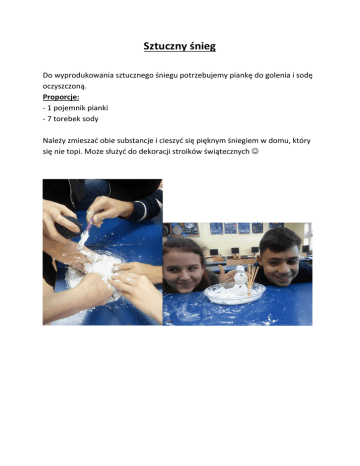 Sztuczny śnieg Do wyprodukowania sztucznego śniegu potrzebujemy piankę do golenia i sodę oczyszczoną. Proporcje: - 1 pojemnik pianki - 7 torebek sody Należy zmieszad obie substancje i cieszyd się pięknym śniegiem w domu, który się nie topi. Może służyd do dekoracji stroików świątecznych