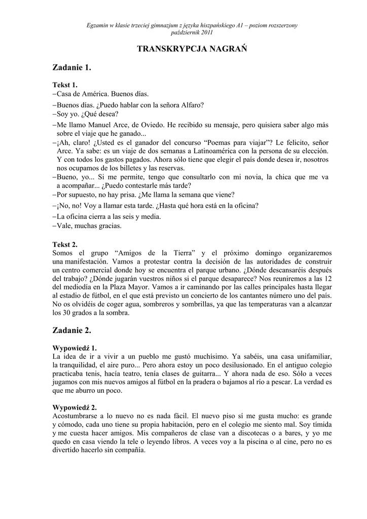 Egzamin w klasie trzeciej gimnazjum z języka hiszpańskiego A1 – poziom rozszerzony październik 2011 TRANSKRYPCJA NAGRAŃ Zadanie 1. Tekst 1. Casa de América. Buenos días. Buenos días. ¿Puedo hablar con la señora Alfaro? Soy yo. ¿Qué desea? Me llamo Manuel Arce, de Oviedo. He recibido su mensaje, pero quisiera saber algo más sobre el viaje que he ganado... ¡Ah, claro! ¿Usted es el ganador del concurso “Poemas para viajar”? Le felicito, señor Arce. Ya sabe: es un viaje de dos semanas a Latinoamérica con la persona de su elección. Y con todos los gastos pagados. Ahora sólo tiene que elegir el país donde desea ir, nosotros nos ocupamos de los billetes y las reservas. Bueno, yo... Si me permite, tengo que consultarlo con mi novia, la chica que me va a acompañar... ¿Puedo contestarle más tarde? Por supuesto, no hay prisa. ¿Me llama la semana que viene? ¡No, no! Voy a llamar esta tarde. ¿Hasta qué hora está en la oficina? La oficina cierra a las seis y media. Vale, muchas gracias. Tekst 2. Somos el grupo “Amigos de la Tierra” y el próximo domingo organizaremos una manifestación. Vamos a protestar contra la decisión de las autoridades de construir un centro comercial donde hoy se encuentra el parque urbano. ¿Dónde descansaréis después del trabajo? ¿Dónde jugarán vuestros niños si el parque desaparece? Nos reuniremos a las 12 del mediodía en la Plaza Mayor. Vamos a ir caminando por las calles principales hasta llegar al estadio de fútbol, en el que está previsto un concierto de los cantantes número uno del país. No os olvidéis de coger agua, sombreros y sombrillas, ya que las temperaturas van a alcanzar los 30 grados a la sombra. Zadanie 2. Wypowiedź 1. La idea de ir a vivir a un pueblo me gustó muchísimo. Ya sabéis, una casa unifamiliar, la tranquilidad, el aire puro... Pero ahora estoy un poco desilusionado. En el antiguo colegio practicaba tenis, hacía teatro, tenía clases de guitarra... Y ahora nada de eso. Sólo a veces jugamos con mis nuevos amigos al fútbol en la pradera o bajamos al río a pescar. La verdad es que me aburro un poco. Wypowiedź 2. Acostumbrarse a lo nuevo no es nada fácil. El nuevo piso sí me gusta mucho: es grande y cómodo, cada uno tiene su propia habitación, pero en el colegio me siento mal. Soy tímida y me cuesta hacer amigos. Mis compañeros de clase van a discotecas o a bares, y yo me quedo en casa viendo la tele o leyendo libros. A veces voy a la piscina o al cine, pero no es divertido hacerlo sin compañía. Egzamin w klasie trzeciej gimnazjum z języka hiszpańskiego A1 – poziom rozszerzony październik 2011 Wypowiedź 3. Al principio no quería trasladarme a otra ciudad, pero ahora estoy muy contento. Mi nueva habitación se parece mucho a la antigua. He llevado todas mis cosas más queridas: el escritorio, la cama, los armarios, los pósters, y las he puesto como antes. En el colegio todo va muy bien, incluso mejor que antes: han terminado mis problemas con las Matemáticas y saco buenas notas. Los profesores y los compañeros de clase son estupendos. Ya he hecho muchos amigos. Wypowiedź 4. Hace dos meses que vivimos en este barrio. El nuevo sitio es muy bonito: hay muchos parques y tiendas, pero lo que a mí más me gusta es mi habitación. Es preciosa. Todo es nuevo en ella: la alfombra, el escritorio, las estanterías, el ordenador, todo. Ya he mandado algunas fotos a Paula y David, mis mejores amigos del colegio donde estudiábamos juntos. Dicen que me van a visitar la semana que viene. ¡Qué alegría! adapted from news.bbc.co.uk