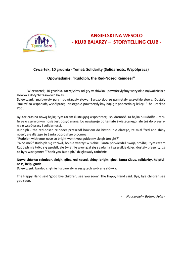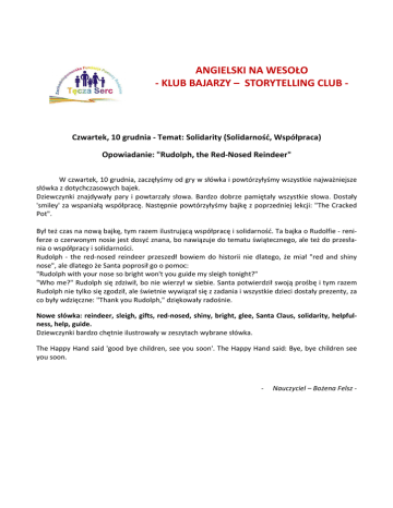 ANGIELSKI NA WESOŁO - KLUB BAJARZY – STORYTELLING CLUB - Czwartek, 10 grudnia - Temat: Solidarity (Solidarność, Współpraca) Opowiadanie: "Rudolph, the Red-Nosed Reindeer" W czwartek, 10 grudnia, zaczęłyśmy od gry w słówka i powtórzyłyśmy wszystkie najważniejsze słówka z dotychczasowych bajek. Dziewczynki znajdywały pary i powtarzały słowa. Bardzo dobrze pamiętały wszystkie słowa. Dostały 'smiley' za wspaniałą współpracę. Następnie powtórzyłyśmy bajkę z poprzedniej lekcji: "The Cracked Pot". Był też czas na nową bajkę, tym razem ilustrującą współpracę i solidarność. Ta bajka o Rudolfie - reniferze o czerwonym nosie jest dosyć znana, bo nawiązuje do tematu świątecznego, ale też do przesłania o współpracy i solidarności. Rudolph - the red-nosed reindeer przeszedł bowiem do historii nie dlatego, że miał "red and shiny nose", ale dlatego że Santa poprosił go o pomoc: "Rudolph with your nose so bright won't you guide my sleigh tonight?" "Who me?" Rudolph się zdziwił, bo nie wierzył w siebie. Santa potwierdził swoją prośbę i tym razem Rudolph nie tylko się zgodził, ale świetnie wywiązał się z zadania i wszystkie dzieci dostały prezenty, za co były wdzięczne: "Thank you Rudolph," dziękowały radośnie. Nowe słówka: reindeer, sleigh, gifts, red-nosed, shiny, bright, glee, Santa Claus, solidarity, helpfulness, help, guide. Dziewczynki bardzo chętnie ilustrowały w zeszytach wybrane słówka. The Happy Hand said 'good bye children, see you soon'. The Happy Hand said: Bye, bye children see you soon. - Nauczyciel – Bożena Felsz -