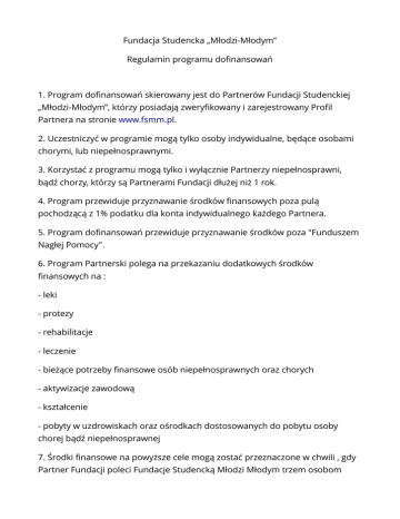 Fundacja Studencka „Młodzi-Młodym” Regulamin programu dofinansowań 1. Program dofinansowań skierowany jest do Partnerów Fundacji Studenckiej „Młodzi-Młodym”, którzy posiadają zweryfikowany i zarejestrowany Profil Partnera na stronie www.fsmm.pl. 2. Uczestniczyć w programie mogą tylko osoby indywidualne, będące osobami chorymi, lub niepełnosprawnymi. 3. Korzystać z programu mogą tylko i wyłącznie Partnerzy niepełnosprawni, bądź chorzy, którzy są Partnerami Fundacji dłużej niż 1 rok. 4. Program przewiduje przyznawanie środków finansowych poza pulą pochodzącą z 1% podatku dla konta indywidualnego każdego Partnera. 5. Program dofinansowań przewiduje przyznawanie środków poza "Funduszem Nagłej Pomocy". 6. Program Partnerski polega na przekazaniu dodatkowych środków finansowych na : - leki - protezy - rehabilitacje - leczenie - bieżące potrzeby finansowe osób niepełnosprawnych oraz chorych - aktywizacje zawodową - kształcenie - pobyty w uzdrowiskach oraz ośrodkach dostosowanych do pobytu osoby chorej bądź niepełnosprawnej 7. Środki finansowe na powyższe cele mogą zostać przeznaczone w chwili , gdy Partner Fundacji poleci Fundacje Studencką Młodzi Młodym trzem osobom chorym, bądź niepełnosprawnym. 8. Osoby polecone przez Partnera muszą zarejestrować Profil Partnera oraz być zarejestrowanymi członkami Fundacji. 9. Osoby polecone muszą wskazać Partnera jako osobę polecającą. 10. W chwili zweryfikowania trzech nowych Partnerów Fundacji poleconych przez wnioskodawcę Fundacja w okresie nie dłuższym niż 10 dni roboczych dokonuje wpłaty środków na konto podane w Profilu Partnera. 11. Partner może przeznaczyć przekazane środki zgodnie z celami statutowymi Fundacji Studenckiej „Młodzi-Młodym” 12. Warunkiem przyznania środków jest również przekazanie Fundacji informacji o zakupionych rzeczach pochodzących z programu dofinansowań w postaci fotorelacji oraz krótkiej notki na adres mailowy Fundacji : [email protected]. W tytule maila musi być zawarty nr referencyjny Partnera. 13. Wnioski o dofinansowanie można składać na adres mailowy [email protected], lub wysyłając pocztą na adres Fundacja Studencka „MłodziMłodym” ul. Bór 116 42-200 Częstochowa. 14. Ostateczną decyzję o przyznaniu dofinansowania dla Partnera podejmuje Rada Fundacji Studenckiej „Młodzi-Młodym”. 15. W szczególnych sytuacjach Fundacja może przekazać dofinansowanie bez dodatkowych wymagań od Partnera.