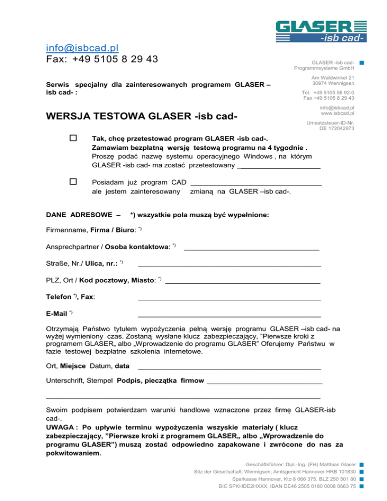 [email protected] Fax: +49 5105 8 29 43 GLASER -isb cadProgrammsysteme GmbH Serwis specjalny dla zainteresowanych programem GLASER – isb cad- : Am Waldwinkel 21 30974 Wennigsen Tel. +49 5105 58 92-0 Fax +49 5105 8 29 43 [email protected] www.isbcad.pl WERSJA TESTOWA GLASER -isb cad- Umsatzsteuer-ID-Nr. DE 172042973 Tak, chcę przetestować program GLASER -isb cad-. Zamawiam bezpłatną wersję testową programu na 4 tygodnie . Proszę podać nazwę systemu operacyjnego Windows , na którym GLASER -isb cad- ma zostać przetestowany ____________________ Posiadam już program CAD _________________________________ ale jestem zainteresowany zmianą na GLASER –isb cad-. DANE ADRESOWE – *) wszystkie pola muszą być wypełnione: Firmenname, Firma / Biuro: *) Ansprechpartner / Osoba kontaktowa: *) Straße, Nr./ Ulica, nr.: *) __________________________________ ______________________________________________ PLZ, Ort / Kod pocztowy, Miasto: *) _______________________________________ Telefon *), Fax: ______________________________________________ E-Mail *) ______________________________________________ Otrzymają Państwo tytułem wypożyczenia pełną wersję programu GLASER –isb cad- na wyżej wymieniony czas. Zostaną wysłane klucz zabezpieczający, ”Pierwsze kroki z programem GLASER„ albo „Wprowadzenie do programu GLASER” Oferujemy Państwu w fazie testowej bezpłatne szkolenia internetowe. Ort, Miejsce Datum, data ______________________________________________ Unterschrift, Stempel Podpis, pieczątka firmow _____________________________ _____________________________________________________________________ Swoim podpisem potwierdzam warunki handlowe wznaczone przez firmę GLASER-isb cad-. UWAGA : Po upływie terminu wypożyczenia wszyskie materiały ( klucz zabezpieczający, ”Pierwsze kroki z programem GLASER„ albo „Wprowadzenie do programu GLASER”) muszą zostać odpowiedno zapakowane i zwrócone do nas za pokwitowaniem. Geschäftsführer: Dipl.-Ing. (FH) Matthias Glaser Sitz der Gesellschaft: Wennigsen; Amtsgericht Hannover HRB 101830 Sparkasse Hannover, Kto 8 066 375, BLZ 250 501 80 BIC SPKHDE2HXXX, IBAN DE46 2505 0180 0008 0663 75