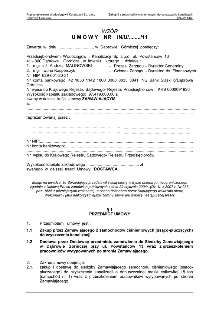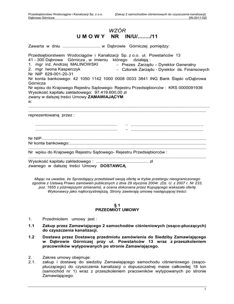 Przedsiębiorstwo Wodociągów i Kanalizacji Sp. z o.o. Dąbrowa Górnicza [Zakup 2 samochodów ciśnieniowych do czyszczenia kanalizacji] [IN-2011-02] WZÓR U M O W Y NR IN/U/......../11 Zawarta w dniu ............................... w Dąbrowie Górniczej pomiędzy: Przedsiębiorstwem Wodociągów i Kanalizacji Sp. z o.o. ul. Powstańców 13 41 - 300 Dąbrowa Górnicza , w imieniu którego działają : 1. mgr inŜ. Andrzej MALINOWSKI − Prezes Zarządu – Dyrektor Generalny 2. mgr Iwona Kasperczyk − Członek Zarządu - Dyrektor ds. Finansowych Nr NIP 629-001-20-31 Nr konta bankowego: 42 1050 1142 1000 0008 0033 3841 ING Bank Śląski o/Dąbrowa Górnicza Nr wpisu do Krajowego Rejestru Sądowego- Rejestru Przedsiębiorców : KRS 0000091936 Wysokość kapitału zakładowego: 97.419.600,00 zł zwany w dalszej treści Umowy ZAMAWIAJĄCYM a: .................................................................................................................................................... .................................................................................................................................................... reprezentowaną przez : ................................................................... ................................................................... − ........................................................... − ........................................................... Nr NIP:........................................................................................................................................ Nr konta bankowego:.................................................................................................................. .................................................................................................................................................... Nr wpisu do Krajowego Rejestru Sądowego- Rejestru Przedsiębiorców : .................................................................................................................................................... Wysokość kapitału zakładowego : ........................................... zł zwanego w dalszej treści Umowy DOSTAWCĄ. Mając na uwadze, Ŝe Sprzedający przedstawił swoją ofertę w trybie przetargu nieograniczonego zgodnie z Ustawą Prawo zamówień publicznych z dnia 29 stycznia 2004r. (Dz. U. z 2007 r. Nr 233, poz. 1655 z późniejszymi zmianami), a ocena dokonana przez Kupującego wskazała ofertę Wykonawcy jako najkorzystniejszą, Strony zawierają umowę następującej treści: §1 PRZEDMIOT UMOWY 1. Przedmiotem umowy jest : 1.1 Zakup przez Zamawiającego 2 samochodów ciśnieniowych (ssąco-płuczących) do czyszczenia kanalizacji. 1.2 Dostawa przez Dostawcę przedmiotu zamówienia do Siedziby Zamawiającego w Dąbrowie Górniczej przy ul. Powstańców 13 wraz z przeszkoleniem pracowników wytypowanych po stronie Zamawiającego. 2. 2.1. Zakres umowy obejmuje: zakup i dostawę do siedziby Zamawiającego samochodu ciśnieniowego (ssącopłuczącego) do czyszczenia kanalizacji o dopuszczalnej masie całkowitej 18 ton (samochód nr 1) wraz z przeszkoleniem pracowników wytypowanych po stronie Zamawiającego. 1 Przedsiębiorstwo Wodociągów i Kanalizacji Sp. z o.o. Dąbrowa Górnicza [Zakup 2 samochodów ciśnieniowych do czyszczenia kanalizacji] [IN-2011-02] 2.2. zakup i dostawę do siedziby Zamawiającego samochodu ciśnieniowego (ssącopłuczącego) do czyszczenia kanalizacji o dopuszczalnej masie całkowitej 26 ton (samochód nr 2) wraz z przeszkoleniem pracowników wytypowanych po stronie Zamawiającego. 3. Wymagania techniczne dotyczące przedmiotu Zamówienia opisane są szczegółowo w załączniku nr 1 do umowy. 4. Podstawą wykonania przedmiotu umowy określonego w §1 pkt. 1 są: 4.1. ZłoŜona Oferta i Specyfikacja Istotnych Warunków Zamówienia, 4.2. Warunki techniczne wykonania prac – załącznik nr 1 do umowy, 4.3. obowiązujące Normy, przy zapewnieniu potrzebnych materiałów, odpowiedniego sprzętu oraz wykwalifikowanej kadry pracowników, w sposób opisany w przedłoŜonych przez Wykonawcę w dokumentach ofertowych. §2 TERMIN REALIZACJI 1. 1.1 Termin realizacji Umowy wynosi: Realizacja dostawy samochodu ciśnieniowego (ssąco-płuczącego) do czyszczenia kanalizacji o dopuszczalnej masie całkowitej 18 ton (samochód nr 1) nastąpi w terminie: do.................dni od dnia zawarcia Umowy, tj. do dnia …………….. 1.2 Przeszkolenie pracowników Zamawiającego w zakresie pełnej obsługi i eksploatacji samochodu nr 1 nastąpi w terminie do 60 dni od dnia dostarczenia samochodu nr 1 do siedziby Zamawiającego wraz z kompletem dokumentacji. 1.3 Realizacja dostawy samochodu ciśnieniowego (ssąco-płuczącego) do czyszczenia kanalizacji o dopuszczalnej masie całkowitej 26 ton (samochód nr 2) nastąpi w terminie: do.................dni od dnia zawarcia Umowy Przeszkolenie pracowników Zamawiającego w zakresie pełnej obsługi i eksploatacji samochodu nr 2 nastąpi w terminie do 60 dni od dnia dostarczenia samochodu nr 2 do siedziby Zamawiającego wraz z kompletem dokumentacji. 1.4 §3 OBOWIĄZKI I PRAWA STRON 1. 2. 3. Zamawiający, jako częściowe rozliczenie zakupu towaru, przekaŜe Dostawcy aktualnie posiadany samochód zabudowany urządzeniem ssąco-płuczącym KAISER AQUASTAR, marki i typu Mercedes-Benz 2648 o nr VIN WDB9501431K587969, roku produkcji – 2001 i nr rejestracyjnym SD10301. W czasie cyklu produkcyjnego Zamawiający dokona jednego wstępnego odbioru technicznego kaŜdego samochodu w terminie pisemnie uzgodnionym przez Strony umowy. Wstępne odbiory techniczne mają na celu zapoznanie Zamawiającego z budową towaru oraz wykazaniem przez Dostawcę zgodności jego konfiguracji z zapisami w umowie. W czasie wstępnego odbioru technicznego, Zamawiający, po konsultacji z Dostawcą, zastrzega sobie moŜliwość wprowadzenia drobnych zmian i korekt do warunków technicznych wykonania prac 