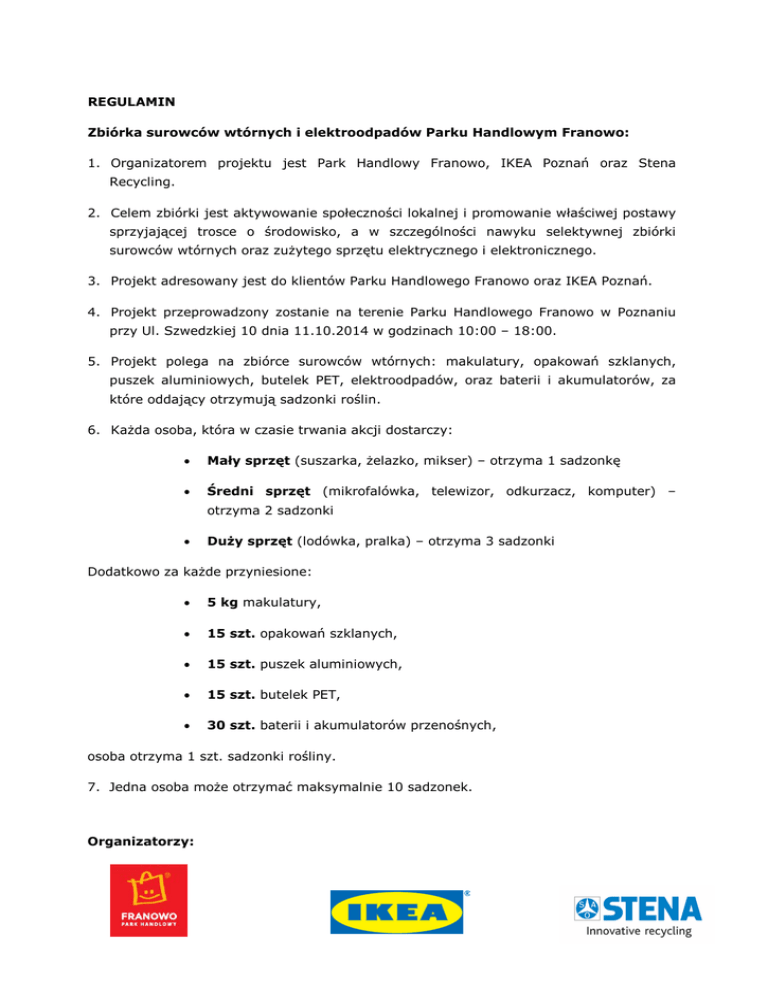 REGULAMIN Zbiórka surowców wtórnych i elektroodpadów Parku Handlowym Franowo: 1. Organizatorem projektu jest Park Handlowy Franowo, IKEA Poznań oraz Stena Recycling. 2. Celem zbiórki jest aktywowanie społeczności lokalnej i promowanie właściwej postawy sprzyjającej trosce o środowisko, a w szczególności nawyku selektywnej zbiórki surowców wtórnych oraz zużytego sprzętu elektrycznego i elektronicznego. 3. Projekt adresowany jest do klientów Parku Handlowego Franowo oraz IKEA Poznań. 4. Projekt przeprowadzony zostanie na terenie Parku Handlowego Franowo w Poznaniu przy Ul. Szwedzkiej 10 dnia 11.10.2014 w godzinach 10:00 – 18:00. 5. Projekt polega na zbiórce surowców wtórnych: makulatury, opakowań szklanych, puszek aluminiowych, butelek PET, elektroodpadów, oraz baterii i akumulatorów, za które oddający otrzymują sadzonki roślin. 6. Każda osoba, która w czasie trwania akcji dostarczy: • Mały sprzęt (suszarka, żelazko, mikser) – otrzyma 1 sadzonkę • Średni sprzęt (mikrofalówka, telewizor, odkurzacz, komputer) – otrzyma 2 sadzonki • Duży sprzęt (lodówka, pralka) – otrzyma 3 sadzonki Dodatkowo za każde przyniesione: • 5 kg makulatury, • 15 szt. opakowań szklanych, • 15 szt. puszek aluminiowych, • 15 szt. butelek PET, • 30 szt. baterii i akumulatorów przenośnych, osoba otrzyma 1 szt. sadzonki rośliny. 7. Jedna osoba może otrzymać maksymalnie 10 sadzonek. Organizatorzy: