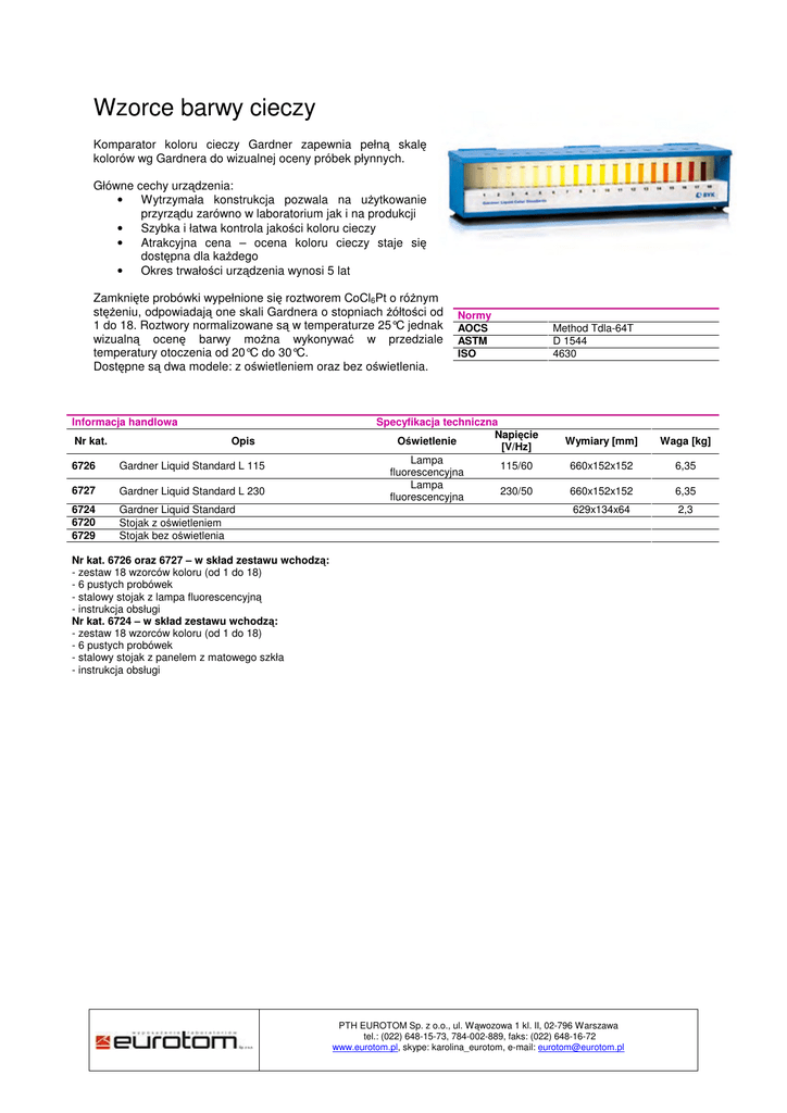 Wzorce barwy cieczy Komparator koloru cieczy Gardner zapewnia pełną skalę kolorów wg Gardnera do wizualnej oceny próbek płynnych. Główne cechy urządzenia: • Wytrzymała konstrukcja pozwala na użytkowanie przyrządu zarówno w laboratorium jak i na produkcji • Szybka i łatwa kontrola jakości koloru cieczy • Atrakcyjna cena – ocena koloru cieczy staje się dostępna dla każdego • Okres trwałości urządzenia wynosi 5 lat Zamknięte probówki wypełnione się roztworem CoCl6Pt o różnym stężeniu, odpowiadają one skali Gardnera o stopniach żółtości od 1 do 18. Roztwory normalizowane są w temperaturze 25°C jednak wizualną ocenę barwy można wykonywać w przedziale temperatury otoczenia od 20°C do 30°C. Dostępne są dwa modele: z oświetleniem oraz bez oświetlenia. Informacja handlowa Nr kat. Opis 6726 Gardner Liquid Standard L 115 6727 Gardner Liquid Standard L 230 6724 6720 6729 Gardner Liquid Standard Stojak z oświetleniem Stojak bez oświetlenia Normy AOCS ASTM ISO Specyfikacja techniczna Napięcie Oświetlenie [V/Hz] Lampa 115/60 fluorescencyjna Lampa 230/50 fluorescencyjna Method Tdla-64T D 1544 4630 Wymiary [mm] Waga [kg] 660x152x152 6,35 660x152x152 6,35 629x134x64 2,3 Nr kat. 6726 oraz 6727 – w skład zestawu wchodzą: - zestaw 18 wzorców koloru (od 1 do 18) - 6 pustych probówek - stalowy stojak z lampa fluorescencyjną - instrukcja obsługi Nr kat. 6724 – w skład zestawu wchodzą: - zestaw 18 wzorców koloru (od 1 do 18) - 6 pustych probówek - stalowy stojak z panelem z matowego szkła - instrukcja obsługi PTH EUROTOM Sp. z o.o., ul. Wąwozowa 1 kl. II, 02-796 Warszawa tel.: (022) 648-15-73, 784-002-889, faks: (022) 648-16-72 www.eurotom.pl, skype: karolina_eurotom, e-mail: [email protected] Akcesoria Wzorce cieczy Akcesoria Nr kat. 6601 6602 6603 6604 6605 6606 6607 6608 6609 6610 6611 6612 6613 6614 6615 6616 6617 6618 Opis Liquid Color Standard Nr 1 Liquid Color Standard Nr 2 Liquid Color Standard Nr 3 Liquid Color Standard Nr 4 Liquid Color Standard Nr 5 Liquid Color Standard Nr 6 Liquid Color Standard Nr 7 Liquid Color Standard Nr 8 Liquid Color Standard Nr 9 Liquid Color Standard Nr 10 Liquid Color Standard Nr 11 Liquid Color Standard Nr 12 Liquid Color Standard Nr 13 Liquid Color Standard Nr 14 Liquid Color Standard Nr 15 Liquid Color Standard Nr 16 Liquid Color Standard Nr 17 Liquid Color Standard Nr 18 Puste probówki Zestaw 144 pustych, nieoznakowanych probówek z korkami dla testowanego płynu Informacje handlowe Nr kat. Opis 6756* Zestaw 144 pustych probówek * - Nie do spektrofotometrów LCS/LCM IV LCM IV - obiektywny sposób na określenie barwy cieczy. Więcej informacji można znaleźć w rozdziale poświęconym urządzeniu LCM IV. LCS IV - pomiar spektralny wszystkich kolorów oraz odcieni wraz z szczegółową analizą kolorystyczną. Więcej informacji można znaleźć w rozdziale poświęconym urządzeniu LCS IV. PTH EUROTOM Sp. z o.o., ul. Wąwozowa 1 kl. II, 02-796 Warszawa tel.: (022) 648-15-73, 784-002-889, faks: (022) 648-16-72 www.eurotom.pl, skype: karolina_eurotom, e-mail: [email protected]