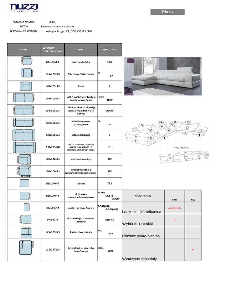 Plaza FUNKCJA SPANIA: NÓŻKI SKRZYNIA NA POŚCIEL: BRYŁA delfin Drewno +wstawka chrom w bryłach typu KE, 1DF, DOST L/Ś/P WYMIARY (cm) szer- gł -wys OPIS OZNACZENIE 80x105x73 fotel bez boków 1BB 114x105x78 fotel lewy/fotel prawy 148x105x78 Fotel 1L 1P 1 195x105x73 sofa 3-osobowa z funkcją 3QFL spania prawa/lewa 3QFP 160x105x73 sofa 3 osobowa z funckją spania typu delfin bez boków 195x105x73 sofa 3-osobowa prawa/lewa 230x105x73 sofa 3-osobowa 3 230x105x78 sofa 3 osobowa z funkcją spania typu sedalift - 2 siedziska szer. 80 cm każde 3F 100x100x73 element narożny SSE 100x100x73 elment narożny z regulowanymi zagłówkami SSE 81x100x40 taboret TBS 81x100x44 dostawka lewa/środkowa/prawa DOSTL DOSTŚ DOSTP dostawka lewa/prawa DOST(40)L DOST(40)P 43x100x44 97x97x44 125x105x73 115x187x73 3QFBB 3L dostawka jako element narożny kuszel lewy/prawy fotel długi ze skrzynką lewy/prawy 3P MODYFIKACJE TAK NIE wg schematu Łączenie skóra/tkanina DOST E X Wybór koloru nitki KEL 1DFL KEP Różnice skóra/tkanina X 1DFP Wzorzyste materiały