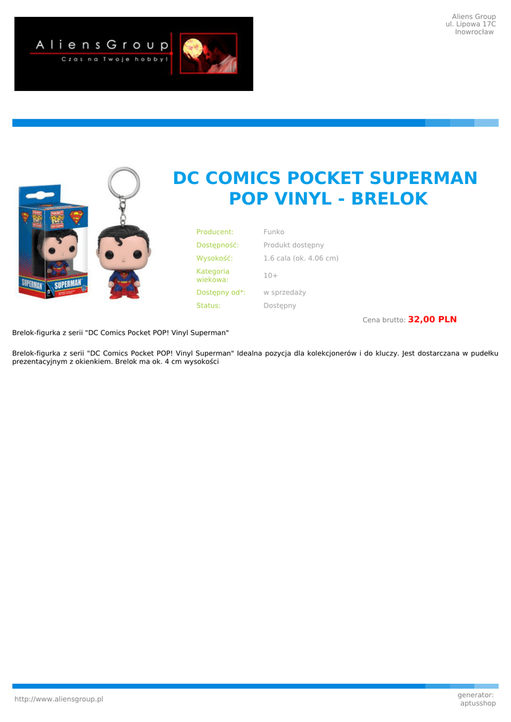 Aliens Group ul. Lipowa 17C Inowrocław DC COMICS POCKET SUPERMAN POP VINYL - BRELOK Producent: Funko Dostępność: Produkt dostępny Wysokość: 1.6 cala (ok. 4.06 cm) Kategoria wiekowa: 10+ Dostępny od*: w sprzedaży Status: Dostępny Cena brutto: 32,00 PLN Brelok-figurka z serii "DC Comics Pocket POP! Vinyl Superman" Brelok-figurka z serii "DC Comics Pocket POP! Vinyl Superman" Idealna pozycja dla kolekcjonerów i do kluczy. Jest dostarczana w pudełku prezentacyjnym z okienkiem. Brelok ma ok. 4 cm wysokości http://www.aliensgroup.pl generator: aptusshop