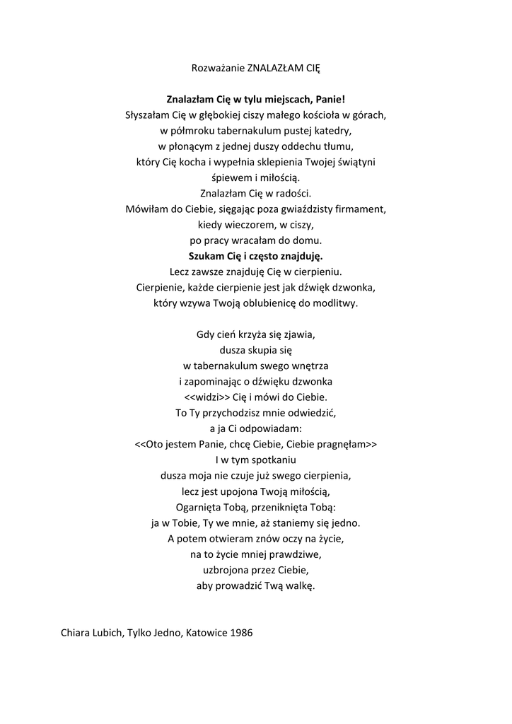 Rozważanie ZNALAZŁAM CIĘ Znalazłam Cię w tylu miejscach, Panie! Słyszałam Cię w głębokiej ciszy małego kościoła w górach, w półmroku tabernakulum pustej katedry, w płonącym z jednej duszy oddechu tłumu, który Cię kocha i wypełnia sklepienia Twojej świątyni śpiewem i miłością. Znalazłam Cię w radości. Mówiłam do Ciebie, sięgając poza gwiaździsty firmament, kiedy wieczorem, w ciszy, po pracy wracałam do domu. Szukam Cię i często znajduję. Lecz zawsze znajduję Cię w cierpieniu. Cierpienie, każde cierpienie jest jak dźwięk dzwonka, który wzywa Twoją oblubienicę do modlitwy. Gdy cień krzyża się zjawia, dusza skupia się w tabernakulum swego wnętrza i zapominając o dźwięku dzwonka <<widzi>> Cię i mówi do Ciebie. To Ty przychodzisz mnie odwiedzić, a ja Ci odpowiadam: <<Oto jestem Panie, chcę Ciebie, Ciebie pragnęłam>> I w tym spotkaniu dusza moja nie czuje już swego cierpienia, lecz jest upojona Twoją miłością, Ogarnięta Tobą, przeniknięta Tobą: ja w Tobie, Ty we mnie, aż staniemy się jedno. A potem otwieram znów oczy na życie, na to życie mniej prawdziwe, uzbrojona przez Ciebie, aby prowadzić Twą walkę. Chiara Lubich, Tylko Jedno, Katowice 1986
