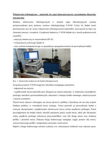 Właściwości tribologiczne – materiały do zajęć laboratoryjnych z przedmiotu Materiały inżynierskie Badania właściwości tribologicznych w ramach zajęć laboratoryjnych zostaną przeprowadzone przy pomocy zestawu tribologicznego T-01M. Użyty do badań tester przeznaczony jest do oceny właściwości tribologicznych materiałów używanych na trące się elementy maszyn i urządzeń. Urządzenie badawcze T-01M składa się z trzech podstawowych zespołów: - maszyny badawczej ze sterownikiem BT-01, - wzmacniacza cyfrowego Spider 8, - oraz systemu komputerowego ze specjalnym oprogramowaniem do prowadzenia badań. Rys. 1. Stanowisko badawcze do badań tribologicznych Za pomocą testera T-01M mogą być określane następujące parametry: - odporność na zużycie, - współczynnik tarcia materiału przy ślizganiu po innym materiale, w zależności od prędkości poślizgu, nacisków powierzchniowych, obecności i rodzaju środka smarnego, zanieczyszczeń i innych czynników. Węzeł tarcia stanowi obracająca się tarcza (przeciw próbka) i dociskany do nie niej trzpień (badana próbka), w warunkach tarcia suchego. Tester pozwala na prowadzenie badań z różnymi obciążeniami i prędkościami obrotowymi tarczy (różne prędkości poślizgu). Przed przystąpieniem do badań należy określić parametry pracy węzła tarcia, takie jak obciążenie styku, prędkość poślizgu (obrotowa przeciwpróbka), czas lub drogę tarcia oraz średnicę próbki i promień tarcia. Podczas biegu badawczego następuje ciągły pomiar siły tarcia, zużycia liniowego próbki i temperatury otoczenia węzła tarcia. Raport z biegu badawczego zawiera wykresy ww. mierzonych wielkości oraz wpisane przez operatora dodatkowe informacje dotyczące badań. Maszyna T-01M umożliwia prowadzenie badań tribologicznych dowolnych materiałów o różnej twardości i chropowatości. Nominalna średnica trzpieni testowych powinna wynosić 3 mm. W przypadku stosowania kulek testowych, średnica ich powinna wynosić 10 mm. Tester T-01M umożliwia prowadzenie badań zgodnie z metodami określonymi w normach ASTM G99 oraz DIN 50324. Do określenia właściwości tribologicznych wykorzystano metodę Pin-On-Disc zgodnie z normą ASTM G99-95a – Standard Test Method for wear Testing with a Pin-on-Disk Apparatus. Metoda ta pozwala określić odporność na zużycie ścierne materiału na podstawie wskaźnika ubytku objętościowego, który odpowiada ilorazowi ubytku masy do gęstości badanego materiału, zgodnie z poniższą zależnością (1): 𝒎𝒂𝒔𝒔 𝒍𝒐𝒔𝒔 𝒈 𝒗𝒐𝒍𝒖𝒎𝒆 𝒍𝒐𝒔𝒔, [ 𝒎𝒎𝟑] = 𝒅𝒆𝒏𝒔𝒊𝒕𝒚 [𝒈/𝒄𝒎𝟑] 𝒙𝟏𝟎𝟎𝟎 (1) gdzie: volume loss – ubytek objętościowy, mass loss – ubytek masowy, density – gęstość Wyznaczano również współczynnik tarcia dla badanego węzła tarcia trzpień (próbka) – tarcza (przeciw próbka) z zależności (2), na podstawie normy ISO 20808:2004(E): 𝑭𝒇 𝑼 = 𝑭𝒑 gdzie: U - współczynnik tarcia Ft - średnia wartość siły tarcia, w [N] Fp – przyłożone obciążenie, w [N] (2)