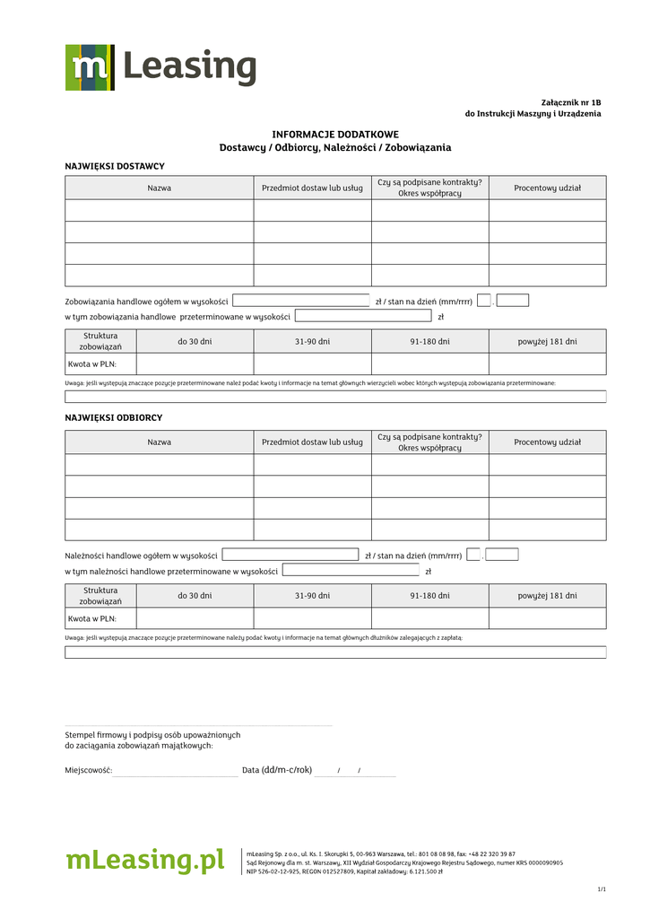 Załącznik nr 1B do Instrukcji Maszyny i Urządzenia INFORMACJE DODATKOWE Dostawcy / Odbiorcy, Należności / Zobowiązania NAJWIĘKSI DOSTAWCY Nazwa Przedmiot dostaw lub usług Zobowiązania handlowe ogółem w wysokości Czy są podpisane kontrakty? Okres współpracy zł / stan na dzień (mm/rrrr) w tym zobowiązania handlowe przeterminowane w wysokości Struktura zobowiązań do 30 dni Procentowy udział . zł 31-90 dni 91-180 dni powyżej 181 dni Kwota w PLN: Uwaga: jeśli występują znaczące pozycje przeterminowane należ podać kwoty i informacje na temat głównych wierzycieli wobec których występują zobowiązania przeterminowane: NAJWIĘKSI ODBIORCY Nazwa Przedmiot dostaw lub usług Należności handlowe ogółem w wysokości Czy są podpisane kontrakty? Okres współpracy zł / stan na dzień (mm/rrrr) w tym należności handlowe przeterminowane w wysokości Struktura zobowiązań do 30 dni Procentowy udział . zł 31-90 dni 91-180 dni powyżej 181 dni Kwota w PLN: Uwaga: jeśli występują znaczące pozycje przeterminowane należy podać kwoty i informacje na temat głównych dłużników zalegających z zapłatą: Stempel firmowy i podpisy osób upoważnionych do zaciągania zobowiązań majątkowych: Miejscowość: Data (dd/m-c/rok) / / 1/1