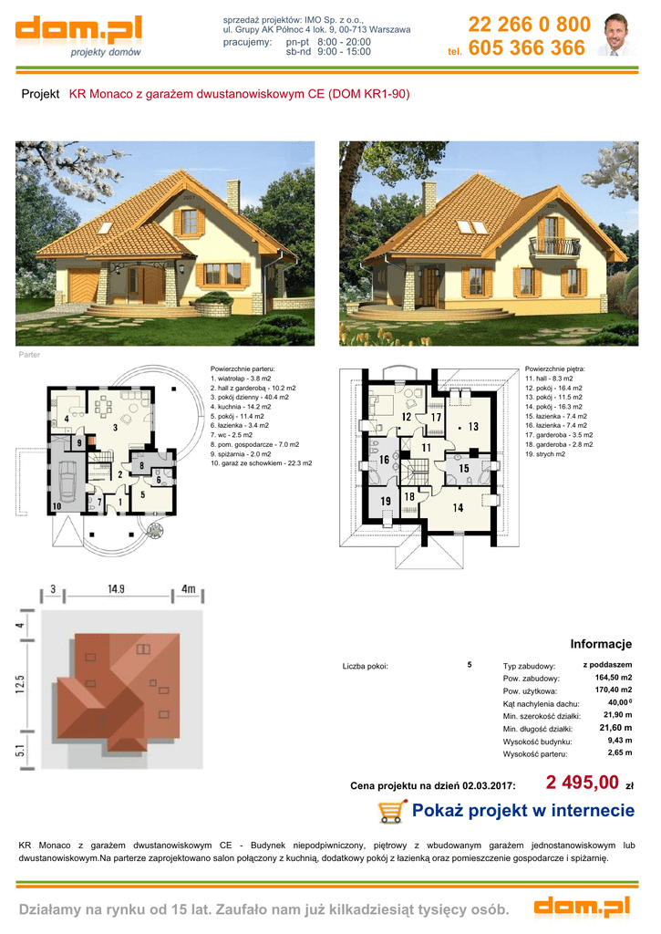 sprzedaż projektów: IMO Sp. z o.o., ul. Grupy AK Północ 4 lok. 9, 00-713 Warszawa pracujemy: pn-pt 8:00 - 20:00 sb-nd 9:00 - 15:00 22 266 0 800 tel. 605 366 366 Projekt KR Monaco z garażem dwustanowiskowym CE (DOM KR1-90) Parter Powierzchnie parteru: 1. wiatrołap - 3.8 m2 2. hall z garderobą - 10.2 m2 3. pokój dzienny - 40.4 m2 4. kuchnia - 14.2 m2 5. pokój - 11.4 m2 6. łazienka - 3.4 m2 7. wc - 2.5 m2 8. pom. gospodarcze - 7.0 m2 9. spiżarnia - 2.0 m2 10. garaż ze schowkiem - 22.3 m2 Powierzchnie piętra: 11. hall - 8.3 m2 12. pokój - 16.4 m2 13. pokój - 11.5 m2 14. pokój - 16.3 m2 15. łazienka - 7.4 m2 16. łazienka - 7.4 m2 17. garderoba - 3.5 m2 18. garderoba - 2.8 m2 19. strych m2 Informacje Liczba pokoi: 5 Typ zabudowy: z poddaszem Pow. zabudowy: 164,50 m2 Pow. użytkowa: 170,40 m2 Kąt nachylenia dachu: 40,00 0 Min. szerokość działki: 21,90 m Min. długość działki: 21,60 m Wysokość budynku: 9,43 m Wysokość parteru: 2,65 m Cena projektu na dzień 02.03.2017: 2 495,00 zł Pokaż projekt w internecie KR Monaco z garażem dwustanowiskowym CE - Budynek niepodpiwniczony, piętrowy z wbudowanym garażem jednostanowiskowym lub dwustanowiskowym.Na parterze zaprojektowano salon połączony z kuchnią, dodatkowy pokój z łazienką oraz pomieszczenie gospodarcze i spiżarnię. Działamy na rynku od 15 lat. Zaufało nam już kilkadziesiąt tysięcy osób.