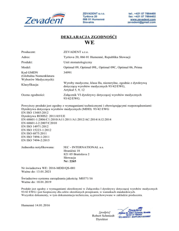 DEKLARACJA ZGODNOŚĆI WE Producent: ZEVADENT s.r.o. Adres: Tyršova 20, 066 01 Humenné, Republika Słowacji Produkt: Unit stomatologiczny Model: Optimal 09, Optimal 09L, Optimal 09C, Optimal 06, Prima Kod GMDN (Globalna Nomenklatura Wyborów Medycznych): 34991 Klasyfikacja: Ocena zgodności: Wyroby medyczne, klasa IIa, niesterylne, zgodnie z dyrektywą dotyczącą wyrobów medycznych 93/42/EWG, Artykuł 5, 9, 12 Załącznik VI dyrektywy dotyczącej wyrobów medycznych 93/42/EWG. Powyższy produkt jest zgodny z wymaganiami technicznymi i obowiązującymi rozporządzeniami: Dyrektywa dotycząca wyrobów medycznych (MDD) 93/42 EWG EN ISO 13485:2012 Dyrektywa ROHS2: 2011/65/UE EN 60601-1:2006/C1:2010/A11:2011/A1:2012/AC:2014/A12:2014 EN 60601-l-2:2007/C2010 EN ISO 14971:2012 EN ISO 15223-1:2012 EN ISO 6875:2011 EN ISO 7494-1:2011 EN ISO 7494-2:2015 Jednostka notyfikowana: 3EC - INTERNATIONAL a.s. Hraničná 18 821 05 Bratislava 2 Słowacja Nr: 2265 Nr świadectwa WE: 2016-MDD/QS-001 Ważne do: 13.01.2021 Świadectwo systemu zarządzania jakością: M0371/16 Ważne do: 10.01.2019 Produkt jest zgodny z wymaganiami określonymi w Załączniku I dyrektywy dotyczącej wyrobów medycznych 93/42 EWG i jest bezpieczny dla celów określonych przepisami, w warunkach standardowych. Wszystkie dokumenty, w tym dokumentacja techniczna, są przechowywane w zakładzie producenta. Humenné 14.01.2016 [podpis] Robert Schmiedt Dyrektor