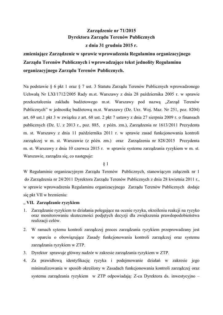 Zarządzenie nr 71/2015 Dyrektora Zarządu Terenów Publicznych z dnia 31 grudnia 2015 r. zmieniające Zarządzenie w sprawie wprowadzenia Regulaminu organizacyjnego Zarządu Terenów Publicznych i wprowadzające tekst jednolity Regulaminu organizacyjnego Zarządu Terenów Publicznych. Na podstawie § 6 pkt 1 oraz § 7 ust. 3 Statutu Zarządu Terenów Publicznych wprowadzonego Uchwałą Nr LXI/1712/2005 Rady m.st. Warszawy z dnia 28 października 2005 r. w sprawie przekształcenia zakładu budżetowego m.st. Warszawy pod nazwą „Zarząd Terenów Publicznych” w jednostkę budżetową m.st. Warszawy (Dz. Urz. Woj. Maz. Nr 251, poz. 8204) art. 69 ust.1 pkt 3 w związku z art. 68 ust. 2 pkt 7 ustawy z dnia 27 sierpnia 2009 r. o finansach publicznych (Dz. U. z 2013 r., poz. 885, z późn. zm.), Zarządzenia nr 1613/2011 Prezydenta m. st. Warszawy z dnia 11 października 2011 r. w sprawie zasad funkcjonowania kontroli zarządczej w m. st. Warszawie (z późn. zm.) oraz Zarządzenia nr 828/2015 Prezydenta m. st. Warszawy z dnia 10 czerwca 2015 r. w sprawie systemu zarządzania ryzykiem w m. st. Warszawie, zarządza się, co następuje: §1 W Regulaminie organizacyjnym Zarządu Terenów Publicznych, stanowiącym załącznik nr 1 do Zarządzenia nr 24/2011 Dyrektora Zarządu Terenów Publicznych z dnia 28 kwietnia 2011 r., w sprawie wprowadzenia Regulaminu organizacyjnego Zarządu Terenów Publicznych dodaje się pkt VII w brzmieniu: „ VII. Zarządzanie ryzykiem 1. Zarządzanie ryzykiem to działania polegające na ocenie ryzyka, określeniu reakcji na ryzyko oraz monitorowaniu skuteczności podjętych decyzji dla zwiększenia prawdopodobieństwa realizacji celów. 2. W ramach sytemu kontroli zarządczej proces zarządzania ryzykiem przeprowadzany jest w oparciu o obowiązujące Zasady funkcjonowania kontroli zarządczej oraz systemu zarządzania ryzykiem w ZTP. 3. Dyrektor sprawuje główny nadzór w zakresie zarządzania ryzykiem w ZTP. 4. Za prawidłową identyfikację ryzyka i podejmowanie działań w zakresie jego minimalizowania w sposób określony w Zasadach funkcjonowania kontroli zarządczej oraz systemu zarządzania ryzykiem w ZTP odpowiadają: Z-ca Dyrektora ds. inwestycyjno – technicznych, Z-ca Dyrektora ds. zarządzania mieniem komunalnym, Główny Księgowy, Kierownicy Zespołów. 5. W procesie zarządzania ryzykiem pracę Dyrektora wspomaga powołany przez niego koordynator ds. kontroli zarządczej i ryzyka, który realizuje zadania określone w Zasadach funkcjonowania kontroli zarządczej oraz systemu zarządzania ryzykiem w ZTP. 6. Zgodnie z Zasadami funkcjonowania kontroli zarządczej oraz systemu zarządzania ryzykiem w ZTP w procesie zarządzania ryzykiem uczestniczą wszyscy pracownicy Zarządu Terenów Publicznych, którzy na bieżąco identyfikują i monitorują ryzyka związane z realizacją zadań i osiąganiem celów, ustalają i podejmują reakcję na ryzyka. 7. Zarządzanie ryzykiem odbywa się w toku bieżącej realizacji zadań jednostki i jest podstawowym kryterium w procesie kontroli, nadzoru i monitorowania stanu realizacji zadań. 8. Procedury dotyczące przepływu informacji do koordynatora ds. kontroli zarządczej i ryzyka, obowiązek rejestrowania ryzyka, jego oceny, dokumentowania, raportowania i monitorowania realizowane są zgodnie z Zasadami funkcjonowania kontroli zarządczej oraz systemu zarządzania ryzykiem w ZTP (Rozdział III Cele i Zarządzanie ryzykiem).”. §2 Zobowiązuje się Kierowników zespołów do zapoznania podległych pracowników z treścią niniejszego Zarządzenia. §3 Pozostałe postanowienia Regulaminu organizacyjnego Zarządu Terenów Publicznych nie ulegają zmianie. §4 Wprowadza się: 1) tekst jednolity Regulaminu organizacyjnego Zarządu Terenów Publicznych o treści określonej w Załączniku nr 1 do niniejszego Zarządzenia; 2) schemat organizacyjny Zarządu Terenów Publicznych o treści określonej w Załączniku nr 2 do niniejszego Zarządzenia. §5 Zarządzenie wchodzi w życie z dniem podpisania. Załącznik Nr 1 do Zarządzenia Nr 71/2015 Dyrektora ZTP z dnia 31.12.2015 r. REGULAMIN ORGANIZACYJNY ZARZĄDU TERENÓW PUBLICZNYCH Struktura organizacyjna Zarządu Terenów Publicznych (ZTP) I. 1. 1) 2) 3) 4) Kadrę kierowniczą ZTP stanowią: dyrektor, zastępca dyrektora ds. inwestycyjno-technicznych, zastępca dyrektora ds. zarządzania mieniem komunalnym, główny księgowy. W skład ZTP wchodzą następujące zespoły i działy: zespół ds. handlu i usług, zespół ds. gospodarowania mieniem komunalnym, zespół ds. dróg, zespół ds. inżynieryjno-budowlanych, zespół ds. zieleni i porządku, zespół ds. finansowych, zespół prawny i zamówień publicznych, w tym działy: a) prawny, b) zamówień publicznych 8) zespół ds. organizacji i kadr, w tym działy ds: a) organizacyjnych (biuro obsługi mieszkańców, sekretariat, kancelaria), b) kadrowo-pracowniczych, c) administracyjno-gospodarczych, d) informatyki. 2. 1) 2) 3) 4) 5) 6) 7) II. Zadania kadry kierowniczej, kierowników zespołów oraz pracowników ZTP 1. Do zadań dyrektora należy: 1) kierowanie bieżącymi sprawami ZTP i reprezentowanie go na zewnątrz, 2) kierowanie pracami ZTP, 3) wyznaczenie swojego zastępcy, który zastępuje dyrektora w czasie jego nieobecności, 4) wykonywanie uprawnień pracodawcy w stosunku do pracowników ZTP, w tym nawiązywanie i rozwiązywanie stosunku pracy, 5) wykonywanie uprawnień zwierzchnika służbowego w stosunku do pracowników ZTP, 6) wykonywanie zarządzeń Prezydenta m.st. Warszawy, uchwał Rady m.st. Warszawy, Rady Dzielnicy Śródmieście oraz uchwał Zarządu Dzielnicy Śródmieście m.st. Warszawy. 2. Do zadań zastępców dyrektora należy w szczególności: 1) sprawowanie bezpośredniego nadzoru nad pracą podległych zespołów, 2) prowadzenie koordynacji i kontroli prac podległych zespołów, 1 3) nadzór nad legalnością, prawidłowością, celowością, gospodarnością i rzetelnością w za