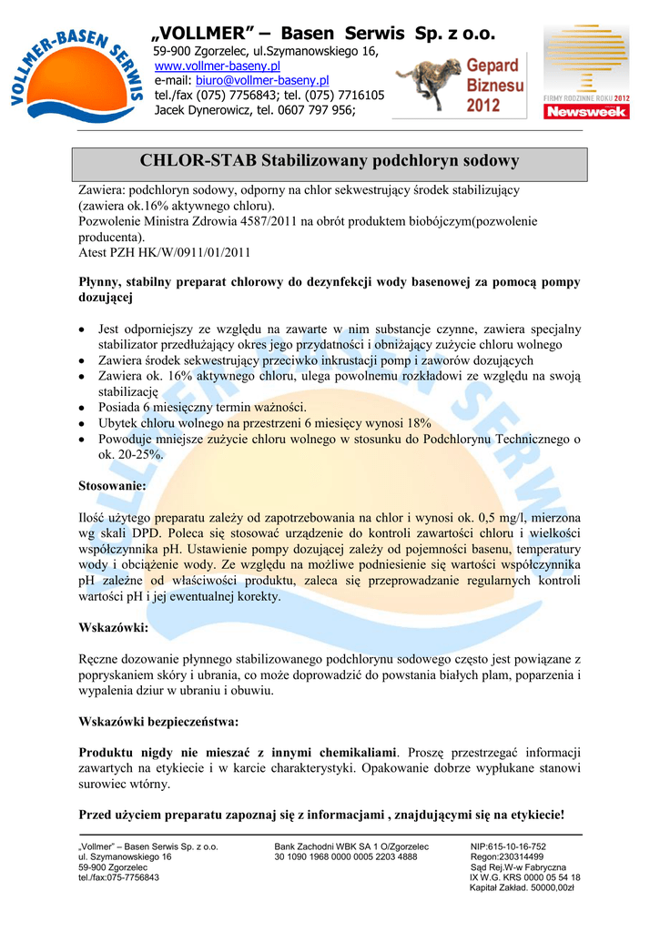 „VOLLMER” – Basen Serwis Sp. z o.o. 59-900 Zgorzelec, ul.Szymanowskiego 16, www.vollmer-baseny.pl e-mail: [email protected] tel./fax (075) 7756843; tel. (075) 7716105 Jacek Dynerowicz, tel. 0607 797 956; CHLOR-STAB Stabilizowany podchloryn sodowy Zawiera: podchloryn sodowy, odporny na chlor sekwestrujący środek stabilizujący (zawiera ok.16% aktywnego chloru). Pozwolenie Ministra Zdrowia 4587/2011 na obrót produktem biobójczym(pozwolenie producenta). Atest PZH HK/W/0911/01/2011 Płynny, stabilny preparat chlorowy do dezynfekcji wody basenowej za pomocą pompy dozującej Jest odporniejszy ze względu na zawarte w nim substancje czynne, zawiera specjalny stabilizator przedłużający okres jego przydatności i obniżający zużycie chloru wolnego Zawiera środek sekwestrujący przeciwko inkrustacji pomp i zaworów dozujących Zawiera ok. 16% aktywnego chloru, ulega powolnemu rozkładowi ze względu na swoją stabilizację Posiada 6 miesięczny termin ważności. Ubytek chloru wolnego na przestrzeni 6 miesięcy wynosi 18% Powoduje mniejsze zużycie chloru wolnego w stosunku do Podchlorynu Technicznego o ok. 20-25%. Stosowanie: Ilość użytego preparatu zależy od zapotrzebowania na chlor i wynosi ok. 0,5 mg/l, mierzona wg skali DPD. Poleca się stosować urządzenie do kontroli zawartości chloru i wielkości współczynnika pH. Ustawienie pompy dozującej zależy od pojemności basenu, temperatury wody i obciążenie wody. Ze względu na możliwe podniesienie się wartości współczynnika pH zależne od właściwości produktu, zaleca się przeprowadzanie regularnych kontroli wartości pH i jej ewentualnej korekty. Wskazówki: Ręczne dozowanie płynnego stabilizowanego podchlorynu sodowego często jest powiązane z popryskaniem skóry i ubrania, co może doprowadzić do powstania białych plam, poparzenia i wypalenia dziur w ubraniu i obuwiu. Wskazówki bezpieczeństwa: Produktu nigdy nie mieszać z innymi chemikaliami. Proszę przestrzegać informacji zawartych na etykiecie i w karcie charakterystyki. Opakowanie dobrze wypłukane stanowi surowiec wtórny. Przed użyciem preparatu zapoznaj się z informacjami , znajdującymi się na etykiecie! „Vollmer” – Basen Serwis Sp. z o.o. ul. Szymanowskiego 16 59-900 Zgorzelec tel./fax:075-7756843 Bank Zachodni WBK SA 1 O/Zgorzelec 30 1090 1968 0000 0005 2203 4888 NIP:615-10-16-752 Regon:230314499 Sąd Rej.W-w Fabryczna IX W.G. KRS 0000 05 54 18 Kapitał Zakład. 50000,00zł