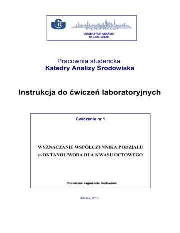 UNIWERSYTET GDAŃSKI WYDZIAŁ CHEMII Pracownia studencka Katedry Analizy Środowiska Instrukcja do ćwiczeń laboratoryjnych Ćwiczenie nr 1 WYZNACZANIE WSPÓŁCZYNNIKA PODZIAŁU n-OKTANOL/WODA DLA KWASU OCTOWEGO Chemiczne zagrożenia środowiska Gdańsk, 2010 1. Chemiczne zagrożenia środowiska – wyznaczanie współczynnika podziału oktanol/woda 2 1. CZĘŚĆ TEORETYCZNA Potencjał rozprzestrzeniania się związku chemicznego w środowisku oraz jego aktywność biologiczna wiąże się w sposób bezpośredni z jego cechami fizykochemicznymi (tj. właściwości elektronowe, steryczne, potencjał tworzenia wiązań wodorowych i inne). Jednak najbardziej użytecznym parametrem w przewidywaniu rozprzestrzeniania się potencjalnego zanieczyszczenia w środowisku, a także prognozowania jego aktywności toksycznej jest lipofilowość - parametr będący wypadkową kilku takich cech. Lipofilowość charakteryzuje powinowactwo związku chemicznego do fazy lipidowej i wodnej, a jej miarą jest stosunek równowagowych stężeń rozpuszczonej substancji w układzie dwufazowym, składającym się z dwóch niemieszających się rozpuszczalników. Zgodnie z prawem Nernsta, w warunkach równowagi termodynamicznej, w stałej temperaturze i przy stałym ciśnieniu, stosunek stężeń (a dokładniej aktywności) rozpuszczonej substancji w obu takich rozpuszczalnikach jest wielkością stałą, zwaną współczynnikiem podziału. Należy zaznaczyć, iż wartość współczynnika podziału nie zależy od aktywności substancji rozpuszczonej, jest natomiast cechą charakterystyczną dla danego układu dwóch rozpuszczalników i jednej substancji rozpuszczonej, zależną od temperatury i ciśnienia. Praktyczne znaczenie lipofilowości polega na możliwości przewidywania, w jakim stopniu dany związek będzie miał tendencję do gromadzenia się w tkankach organizmów żywych. Im bardziej substancja jest lipofilowa, tym większa jest tendencja do jej gromadzenia w organizmie (bioakumulacji) i przenoszenia się wzdłuż łańcuchów pokarmowych (biomagnifikacji). Przyjęto, że rozpuszczalnikami najlepiej odwzorowującymi układ faz polarnych i niepolarnych w ustroju biologicznym oraz środowisku naturalnym są n-oktanol i woda. Rozpuszczalniki te po zmieszaniu tworzą dwie rozseparowane fazy, przy czym ze względu na wzajemną częściową rozpuszczalność jest to układ zawierający oktanol nasycony wodą (2,3 mol/L) oraz wodę nasyconą oktanolem (4,5 x10-3 mol/L). Współczynnik podziału P jest wyrażany ilorazem dwóch stężeń substancji rozpuszczonej: P= C okt Cw (1) gdzie: Cokt (mol/L) stężenie molowe substancji w oktanolu a Cw (mol/L) stężenie molowe substancji w wodzie. Współczynnik taki mierzy się w 25oC, przy stężeniu substancji badanej nie wyższym niż 0,01 mol/L. W takim układzie, jeżeli większa ilość cząsteczek badanego związku chemicznego znajdzie się w fazie oktanolowej, to mamy do czynienia ze związkiem lipofilowym 1. Chemiczne zagrożenia środowiska – wyznaczanie współczynnika podziału oktanol/woda 3 (hydrofobowym). Jeżeli zaś większość pozostanie w fazie wodnej, będzie to związek lipofobowy (hydrofilowy). W fazie oktanolowej, dominującymi staną się oddziaływania dyspersyjne pomiędzy hydrofobowymi fragmentami cząsteczki rozpuszczonego związku a łańcuchem alkilowym noktanolu, podczas gdy nieco mniejsze znaczenie odgrywać tu będą oddziaływania dipol-dipol czy wiązania wodorowe z grupą hydroksylową alkoholu. Wynika stąd jednak, iż n-oktanol posiada zarówno właściwości lipo- jak i hydrofilowe, a cechę taką nazywa się amfifilowością. Zjawisko to przedstawiono schematycznie na rysunku 1, gdzie uwidoczniono cząsteczkę rozpuszczonego benzenu w n-oktanolu (oddziaływania dyspersyjne), w którym równocześnie rozpuszczona jest woda (oddziaływania dipol-dipol i wiązania wodorowe). W fazie wodnej z kolei, występować będą niemal wyłącznie wiązania wodorowe oraz oddziaływania dipol-dipol pomiędzy polarnymi fragmentami cząsteczki związku rozpuszczonego a wodą. Rysunek 1. Oddziaływania międzycząsteczkowe substancji rozpuszczonych w n-oktanolu. Wartość współczynnika podziału zależy zarówno od budowy chemicznej cząsteczki rozpuszczonego związku (liczba i rodzaj różnych grup funkcyjnych, udział miejsc nienasyconych, fragmentów alkilowych, wartość momentu dipolowego i in.) jak i, w dużej mierze, od jej wielkości. W trakcie mieszania obu rozpuszczalników (proces spontaniczny) całkowita entropia takiego układu gwałtownie wzrasta, jednak jej uprzywilejowany wzrost będzie ograniczany spadkiem entropii w fazie wodnej, związanym ze stopniowym uporządkowywaniem cząsteczek wody w otoczce hydratacyjnej solwatowanego związku. Ponieważ większe rozmiary cząsteczki wymagać będą coraz większej wnęki w rozpuszczalniku (większej otoczki hydratacyjnej) powodować to 1. Chemiczne zagrożenia środowiska – wyznaczanie współczynnika podziału oktanol/woda 4 będzie nieuprzywilejowany spadek entropii całego układu. W takiej sytuacji korzystniejsze termodynamicznie staje się obniżenie rozpuszczalności cząsteczek o dużych rozmiarach w fazie wodnej, co wpływa na zwiększenie współczynnika podziału. Stąd też nawet stosunkowo duże cząsteczki, ale zawierające w swojej strukturze układy nienasycone, rozgałęzione i in., ułatwiające zmniejszenie rozmiaru molekularnego, charakteryzują się dużo niższymi współczynnikami podziału od swoich analogów pozbawionych tych cech. Współczynnik podziału oktanol – woda zmierzony dla typowych zanieczyszczeń środowiska mieści się w bardzo szerokim zakresie od 0,01 dla związków o wysokiej polarności do 1010 dla substancji wysoce hydrofobowych. Na rysunku 2 przedstawiono zakres wartości współczynnika podziału dla wybranych toksykantów środowiskowych. Rysunek 2. Wartości współczynnika podziału P wybranych toksykantów środowiska. Tak r