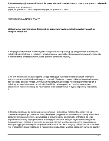 List na temat przyjmowania Komunii św przez wiernych rozwiedzionych żyjących w nowych związkach Wpisany przez Administrator piątek, 09 grudnia 2011 13:48 - Poprawiony piątek, 09 grudnia 2011 13:55 KONGREGACJA NAUKI WIARY List na temat przyjmowania Komunii św przez wiernych rozwiedzionych żyjących w nowych związkach 1. Międzynarodowy Rok Rodziny jest szczególnie ważną okazją, by przypomnieć świadectwa miłości i troski Kościoła o rodzinę1, a jednocześnie uwypuklić nieocenione bogactwa kryjące się w małżeństwie chrześcijańskim, które stanowi podstawę rodziny. 2. W tym kontekście na szczególną uwagę zasługują trudności i cierpienia tych wiernych, których sytuacja małżeńska odbiega od normy2. Pasterze powinni dokładać wszelkich starań, aby te osoby poczuły miłość Chrystusa i macierzyńską bliskość Kościoła; przyjmować ich z miłością, wzywać do ufności w miłosierdzie Boże i wskazywać im z roztropnością oraz szacunkiem konkretne drogi do nawrócenia oraz uczestnictwa w życiu wspólnoty kościelnej 3 . 3. Świadomi jednak, że autentyczne zrozumienie i prawdziwe miłosierdzie nigdy nie są oderwane od prawdy4, pasterze mają obowiązek przypominać tym wiernym naukę Kościoła o sprawowaniu sakramentów, a zwłaszcza o przyjmowaniu Eucharystii. Odnośnie do tego zagadnienia zostały zaproponowane w ubiegłych latach w różnych regionach rozwiązania duszpasterskie, zgodnie z którymi z pewnością nie jest możliwe powszechne dopuszczenie wiernych żyjących w nowych związkach do Komunii św., lecz mogliby oni być dopuszczeni do niej w określonych przypadkach, a mianowicie wtedy, kiedy według osądu ich sumienia czuliby 1/8 List na temat przyjmowania Komunii św przez wiernych rozwiedzionych żyjących w nowych związkach Wpisany przez Administrator piątek, 09 grudnia 2011 13:48 - Poprawiony piątek, 09 grudnia 2011 13:55 się do tego upoważnieni. Tak, na przykład, gdyby zostali opuszczeni bez powodu, mimo że starali się i szczerze pragnęli uratować poprzednie małżeństwo lub gdyby byli przekonani w sumieniu o nieważności poprzedniego małżeństwa, nie mogąc jednak tego udowodnić na forum zewnętrznym, bądź też gdyby mieli już za sobą długą drogę refleksji i pokuty lub z istotnych względów moralnych nie mogliby spełnić obowiązku separacji. Zostało również zaproponowane przez niektórych, aby dla dokonania obiektywnej oceny rzeczywistej sytuacji żyjący w nowych związkach odbyli rozmowę z roztropnym i kompetentnym kapłanem. Kapłan ten musiałby uszanować ich ewentualną decyzję o przystąpieniu do sakramentu Eucharystii, co jednak nie byłoby równoznaczne z udzieleniem oficjalnego zezwolenia. Te rozwiązania duszpasterskie byłyby wyrazem tolerancji i życzliwości oraz chęci sprawiedliwego potraktowania rozwiedzionych żyjących w nowych związkach. 4. Chociaż wiadomo, że analogiczne rozwiązania duszpasterskie były proponowane przez niektórych Ojców Kościoła i w pewnej mierze były stosowane w praktyce, to nie zostały one nigdy zaaprobowane przez Ojców i w żaden sposób nie stanowiły powszechnej nauki Kościoła, ani nie znalazły się w jego dyscyplinie. Obowiązkiem powszechnego Magisterium Kościoła, w imię wierności Pismu Świętemu i Tradycji, jest nauczanie oraz autentyczne interpretowanie depozytu wiary. Wobec wyżej wspomnianych nowych propozycji duszpasterskich Kongregacja Nauki Wiary czuje się więc zobowiązana do przypomnienia nauki i dyscypliny Kościoła w tej materii. Kościół wierny słowu Jezusa Chrystusa5, stwierdza, że nie może uznać ważności nowego związku, jeśli poprzednie małżeństwo było ważne. Jeśli rozwiedzeni zawarli związek cywilny, znajdują się w sytuacji, która obiektywnie jest niezgodna z prawem Bożym i dlatego nie mogą oni przystępować do Komunii św., dopóki trwa ta sytuacja 6. Norma ta nie ma bynajmniej charakteru kary, albo jakiejkolwiek dyskryminacji rozwiedzionych żyjących w nowych związkach, ale wyraża raczej sytuację obiektywną, która sama przez się uniemożliwia przystępowanie do Komunii św.: «Nie mogą oni być dopuszczeni do Komunii św. od chwili, gdy ich stan i sposób życia obiektywnie zaprzeczają tej więzi miłości między Chrystusem i Kościołem, którą wyraża i urzeczywistnia Eucharystia. Jest poza tym inny szczególny motyw duszpasterski: dopuszczenie tych osób do Eucharystii wprowadziłoby w błąd wiernych lub powodowałoby zamęt co do nauki Kościoła o nierozerwalności małżeństwa»7. 2/8 List na temat przyjmowania Komunii św przez wiernych rozwiedzionych żyjących w nowych związkach Wpisany przez Administrator piątek, 09 grudnia 2011 13:48 - Poprawiony piątek, 09 grudnia 2011 13:55 Dla wiernych, którzy pozostają w takiej sytuacji małżeńskiej, jedyną drogą do Komunii św. jest rozgrzeszenie sakramentalne, które może być udzielone tylko tym, «którzy żałując, że naruszyli znak Przymierza i wierności Chrystusowi, są szczerze gotowi na taką formę życia, która nie stoi w sprzeczności z nierozerwalnością małżeństwa. Oznacza to konkretnie, że gdy mężczyzna i kobieta, którzy z ważnych powodów - jak na przykład wychowanie dzieci - nie mogą uczynić zadość zobowiązaniu separacji, 'postanawiają żyć w pełnej wstrzemięźliwości, czyli powstrzymywać się od aktów, które przysługują jedynie małżonkom'»8. Wtedy mogą oni przystępować do Komunii św., przestrzegając jednak obowiązku uniknięcia zgorszenia. 5. Nauczanie i dyscyplina Kościoła w tej materii zostały przedstawione obszernie w okresie posoborowym we wspomnianej już Adhortacji Apostolskiej Familiaris consortio. Adhortacja między innymi przypomina pasterzom o obowiązku poprawnego rozeznania, w duchu umiłowania prawdy, różnych sytuacji i wzywa ich, aby zachęcali rozwiedzionych żyjących w nowych związkach do uczestnictwa w różnych dziedzinach życia Kościo