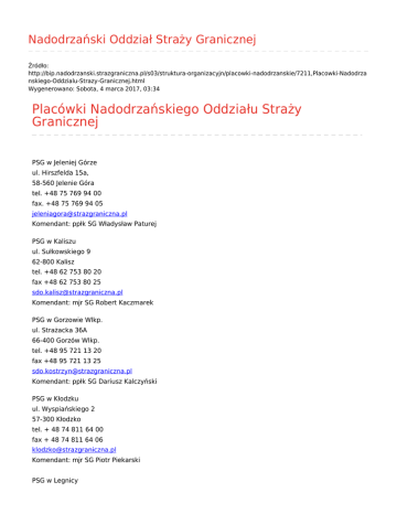 Nadodrzański Oddział Straży Granicznej Źródło: http://bip.nadodrzanski.strazgraniczna.pl/s03/struktura-organizacyjn/placowki-nadodrzanskie/7211,Placowki-Nadodrza nskiego-Oddzialu-Strazy-Granicznej.html Wygenerowano: Sobota, 4 marca 2017, 03:34 Placówki Nadodrzańskiego Oddziału Straży Granicznej PSG w Jeleniej Górze ul. Hirszfelda 15a, 58-560 Jelenie Góra tel. +48 75 769 94 00 fax. +48 75 769 94 05 [email protected] Komendant: ppłk SG Władysław Paturej PSG w Kaliszu ul. Sułkowskiego 9 62-800 Kalisz tel. +48 62 753 80 20 fax +48 62 753 80 25 [email protected] Komendant: mjr SG Robert Kaczmarek PSG w Gorzowie Wlkp. ul. Strażacka 36A 66-400 Gorzów Wlkp. tel. +48 95 721 13 20 fax +48 95 721 13 25 [email protected] Komendant: ppłk SG Dariusz Kalczyński PSG w Kłodzku ul. Wyspiańskiego 2 57-300 Kłodzko tel. + 48 74 811 64 00 fax + 48 74 811 64 06 [email protected] Komendant: mjr SG Piotr Piekarski PSG w Legnicy ul. Partyzantów 22-23 59-220 Legnica tel. +48 76 877 62 00 fax +48 76 877 62 05 [email protected] Komendant: ppłk SG Adam Pawlus PSG w Poznaniu-Ławicy ul. Bukowska 285 60-189 Poznań tel. +48 61 861 13 00 fax +48 61 861 13 05 [email protected] Komendant: ppłk SG Paweł Maziec PSG w Świecku skr. pocztowa 63 69-100 Słubice tel. +48 95 759 02 00 fax. +48 95 759 02 05 [email protected] Komendant: pplk SG Krzysztof Krawiec PSG w Tuplicach ul. Świerczewskiego 1 68-219 Tuplice tel. +48 68 362 52 00 fax +48 68 362 52 05 [email protected] Komendant: ppłk SG Lesław Siwka PSG we Wrocławiu - Strachowicach ul. Graniczna 190 54-530 Wrocław tel. +48 71 358 47 00 fax +48 71 358 47 05 [email protected] Komendant: ppłk SG Artur Maliński Godziny przyjmowania interesantów w sprawach dot. cudzoziemców, w których właściwy jest Komendant PSG we Wrocławiu -Strachowicach: PN-PT 7:30-15:30 PSG w Zielonej Górze-Babimoście ul. Kazimierza Wielkiego 12 65-047 Zielona Góra tel. +48 68 329 58 00 fax +48 68 329 58 05 [email protected] Komendant: ppłk SG Dariusz Michalski PSG w Zgorzelcu ul. Bohaterów II Armii Wojska Polskiego 14 59-900 Zgorzelec tel. +48 75 779 72 00 fax +48 75 779 72 05 [email protected] Komendant: ppłk SG Andrzej Torbicz Metryczka Data publikacji 15.11.2013 Data modyfikacji 09.09.2016 Rejestr zmian Podmiot udostępniający informację: Biuletyn Informacji Publicznej Osoba wytwarzająca/odpowiadająca za informację: Anna Galon Osoba udostępniająca informację: Anna Galon Osoba modyfikująca informację: Irena Skuliniec