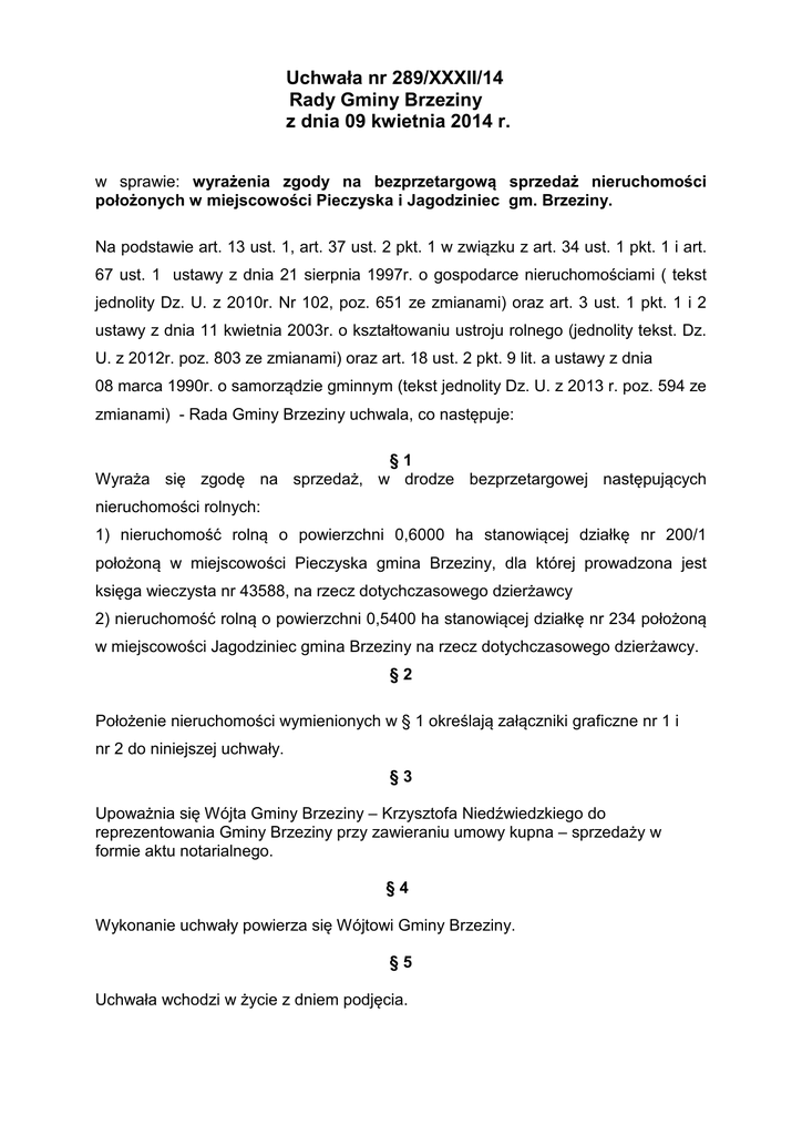 Uchwała nr 289/XXXII/14 Rady Gminy Brzeziny z dnia 09 kwietnia 2014 r. w sprawie: wyrażenia zgody na bezprzetargową sprzedaż nieruchomości położonych w miejscowości Pieczyska i Jagodziniec gm. Brzeziny. Na podstawie art. 13 ust. 1, art. 37 ust. 2 pkt. 1 w związku z art. 34 ust. 1 pkt. 1 i art. 67 ust. 1 ustawy z dnia 21 sierpnia 1997r. o gospodarce nieruchomościami ( tekst jednolity Dz. U. z 2010r. Nr 102, poz. 651 ze zmianami) oraz art. 3 ust. 1 pkt. 1 i 2 ustawy z dnia 11 kwietnia 2003r. o kształtowaniu ustroju rolnego (jednolity tekst. Dz. U. z 2012r. poz. 803 ze zmianami) oraz art. 18 ust. 2 pkt. 9 lit. a ustawy z dnia 08 marca 1990r. o samorządzie gminnym (tekst jednolity Dz. U. z 2013 r. poz. 594 ze zmianami) - Rada Gminy Brzeziny uchwala, co następuje: §1 Wyraża się zgodę na sprzedaż, w drodze bezprzetargowej następujących nieruchomości rolnych: 1) nieruchomość rolną o powierzchni 0,6000 ha stanowiącej działkę nr 200/1 położoną w miejscowości Pieczyska gmina Brzeziny, dla której prowadzona jest księga wieczysta nr 43588, na rzecz dotychczasowego dzierżawcy 2) nieruchomość rolną o powierzchni 0,5400 ha stanowiącej działkę nr 234 położoną w miejscowości Jagodziniec gmina Brzeziny na rzecz dotychczasowego dzierżawcy. §2 Położenie nieruchomości wymienionych w § 1 określają załączniki graficzne nr 1 i nr 2 do niniejszej uchwały. §3 Upoważnia się Wójta Gminy Brzeziny – Krzysztofa Niedźwiedzkiego do reprezentowania Gminy Brzeziny przy zawieraniu umowy kupna – sprzedaży w formie aktu notarialnego. §4 Wykonanie uchwały powierza się Wójtowi Gminy Brzeziny. §5 Uchwała wchodzi w życie z dniem podjęcia. Uzasadnienie do uchwały Gmina Brzeziny jest właścicielem działek nr: 200/1 położonej w miejscowości Pieczyska i nr 234 położonej w miejscowości Jagodziniec, które obecnie są wydzierżawione rolnikom indywidualnym posiadającym gospodarstwa rolne. Dzierżawa w/w nieruchomości trwa powyżej 3-ech lat i dzierżawcom tym przysługuje prawo pierwokupu określone w ustawie z dnia 11 kwietnia 2003 r. o kształtowaniu ustroju rolnego a ich dzierżawcy wyrazili chęć kupna przedmiotowych nieruchomości.