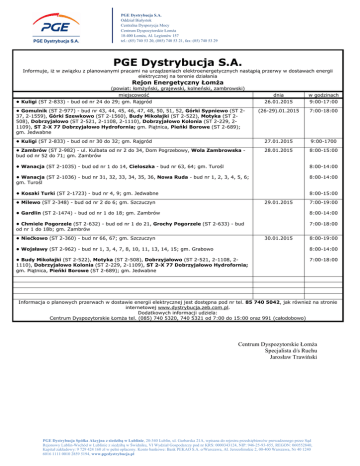 PGE Dystrybucja S.A. Oddział Białystok Centralna Dyspozycja Mocy Centrum Dyspozytorskie Łomża 18-400 Łomża, Al. Legionów 157 tel.: (85) 740 53 20, (085) 740 53 21, fax: (85) 740 53 29 PGE Dystrybucja S.A. Informuje, iż w związku z planowanymi pracami na urządzeniach elektroenergetycznych nastąpią przerwy w dostawach energii elektrycznej na terenie działania Rejon Energetyczny Łomża (powiat: łomżyński, grajewski, kolneński, zambrowski) miejscowość • Kuligi (ST 2-833) - bud od nr 24 do 29; gm. Rajgród dnia 26.01.2015 w godzinach 9:00-17:00 (26-29).01.2015 7:00-18:00 • Kuligi (ST 2-833) - bud od nr 30 do 32; gm. Rajgród 27.01.2015 9:00-1700 • Zambrów (ST 2-982) - ul. Kulbata od nr 2 do 34, Dom Pogrzebowy, Wola Zambrowska bud od nr 52 do 71; gm. Zambrów 28.01.2015 8:00-15:00 • Gomulnik (ST 2-977) - bud nr 43, 44, 45, 46, 47, 48, 50, 51, 52, Górki Sypniewo (ST 237, 2-1559), Górki Szewkowo (ST 2-1560), Budy Mikołajki (ST 2-522), Motyka (ST 2508), Dobrzyjałowo (ST 2-521, 2-1108, 2-1110), Dobrzyjałowo Kolonia (ST 2-229, 21109), ST 2-X 77 Dobrzyjałowo Hydrofornia; gm. Piątnica, Pieńki Borowe (ST 2-689); gm. Jedwabne • Wanacja (ST 2-1035) - bud od nr 1 do 14, Cieloszka - bud nr 63, 64; gm. Turośl 8:00-14:00 • Wanacja (ST 2-1036) - bud nr 31, 32, 33, 34, 35, 36, Nowa Ruda - bud nr 1, 2, 3, 4, 5, 6; gm. Turośl 8:00-14:00 • Kosaki Turki (ST 2-1723) - bud nr 4, 9; gm. Jedwabne 8:00-15:00 • Milewo (ST 2-348) - bud od nr 2 do 6; gm. Szczuczyn 29.01.2015 7:00-19:00 • Gardlin (ST 2-1474) - bud od nr 1 do 18; gm. Zambrów 8:00-14:00 • Chmiele Pogorzele (ST 2-632) - bud od nr 1 do 21, Grochy Pogorzele (ST 2-633) - bud od nr 1 do 18b; gm. Zambrów 7:00-18:00 • Niećkowo (ST 2-360) - bud nr 66, 67; gm. Szczuczyn 30.01.2015 8:00-19:00 • Wojsławy (ST 2-962) - bud nr 1, 3, 4, 7, 8, 10, 11, 13, 14, 15; gm. Grabowo 8:00-14:00 • Budy Mikołajki (ST 2-522), Motyka (ST 2-508), Dobrzyjałowo (ST 2-521, 2-1108, 21110), Dobrzyjałowo Kolonia (ST 2-229, 2-1109), ST 2-X 77 Dobrzyjałowo Hydrofornia; gm. Piątnica, Pieńki Borowe (ST 2-689); gm. Jedwabne 7:00-18:00 Informacja o planowych przerwach w dostawie energii elektrycznej jest dostępna pod nr tel. 85 740 5042, jak również na stronie internetowej www.dystrybucja.zeb.com.pl. Dodatkowych informacji udziela: Centrum Dyspozytorskie Łomża tel. (085) 740 5320, 740 5321 od 7:00 do 15:00 oraz 991 (całodobowo) Centrum Dyspozytorskie Łomża Specjalista d/s Ruchu Jarosław Trawiński PGE Dystrybucja Spółka Akcyjna z siedzibą w Lublinie, 20-340 Lublin, ul. Garbarska 21A, wpisana do rejestru przedsiębiorców prowadzonego przez Sąd Rejonowy Lublin-Wschód w Lublinie z siedzibą w Świdniku, VI Wydział Gospodarczy pod nr KRS: 0000343124, NIP: 946-25-93-855, REGON: 060552840, Kapitał zakładowy: 9 729 424 160 zł w pełni opłacony. Konto bankowe: Bank PEKAO S.A. o/Warszawa, Al. Jerozolimskie 2, 00-400 Warszawa, Nr 40 1240 6016 1111 0010 2859 5194, www.pgedystrybucja.pl