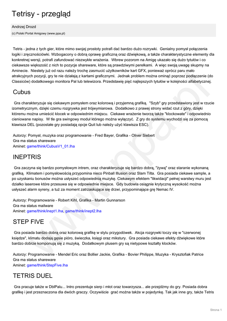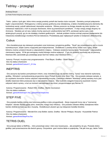 Tetrisy - przegląd Andrzej Drozd (c) Polski Portal Amigowy (www.ppa.pl) Tetris - jedna z tych gier, które mimo swojej prostoty potrafi dać bardzo dużo rozrywki. Genialny pomysł połączenia logiki i zręcznościówki. Wzbogacony o dobrą oprawę graficzną oraz dźwiękową, a także charakterystyczne elementy dla konkretnej wersji, potrafi zafundować niezwykłe wrażenia. Wbrew pozorom na Amigę ukazało się dużo tytułów i co ciekawsze większość z nich to pozycje shareware, które są prawdziwymi perełkami. A więc swoją uwagę skupmy na Aminecie. Niestety już od razu należy trochę zasmucić użytkowników kart GFX, ponieważ oprócz paru mało atrakcyjnych pozycji, gry te nie działają z kartami graficznymi. Jednak problem można ominąć poprzez podłączenie (do Classiców) dodatkowego monitora Pal lub telewizora. Przedstawię pięć najlepszych tytułów w kolejności alfabetycznej. .p l Cubus w .p pa Gra charakteryzuje się ciekawym pomysłem oraz kolorową i przyjemną grafiką. "Szyb" gry przedstawiony jest w rzucie izometrycznym, dzięki czemu rozgrywka jest trójwymiarowa. Dodatkowo z prawej strony widać rzut z góry, dzięki któremu można umieścić klocek w odpowiednim miejscu. Ciekawe wrażenie tworzą także "klockowate" i odpowiednio cieniowane napisy. W tle gra swingowy moduł którego można wyłączyć. Z gry do systemu wychodzi się za pomocą klawisza DEL (pozostałe gry posiadają opcje Quit lub należy użyć klawisza ESC). Autorzy: Pomysł, muzyka oraz programowanie - Fred Bayer, Grafika - Oliver Siebert Gra ma status shareware Aminet: game/think/CubusV1_01.lha INEPTRIS Gra zaczyna się bardzo pomysłowym intrem, oraz charakteryzuje się bardzo dobrą, "żywą" oraz staranie wykonaną grafiką. Klimatem i pomysłowością przypomina nieco Pinball Illusion oraz Slam Tilta. Gra posiada ciekawe sample, a po uzyskaniu bonusów można usłyszeć odpowiednią muzykę. Ciekawym efektem "likwidacji" pełnej warstwy muru jest działko laserowe które przesuwa się w odpowiednie miejsce. Gdy budowla osiągnie krytyczną wysokość można usłyszeć alarm syreny, a tuż za moment zatrzaskujące się drzwi, przypominające grę Nemac IV. w Autorzy: Programowanie - Robert Kihl, Grafika - Martin Gunnarson Gra ma status mailware Aminet: game/think/inept1.lha, game/think/inept2.lha STEP FIVE w Gra posiada bardzo dobrą oraz kolorową grafikę w stylu przygodówek. Akcja rozgrywki toczy się w "czerwonej księdze", klimatu dodają gęsie pióro, świeczka, księgi oraz mikstury. Gra posiada ciekawe efekty dźwiękowe które bardzo dobrze komponują się z muzyką. Dodatkowym plusem gry są nietypowe kształty klocków. Autorzy: Programowanie - Mendel Eric oraz Bollier Jackie, Grafika - Bovier Philippe, Muzyka - Krysztofiak Patrice Gra ma status shareware Aminet: game/think/StepFive.lha TETRIS DUEL Gra pracuje także w DblPalu... Intro prezentuje sierp i młot oraz towarzysza... ale przejdźmy do gry. Posiada dobra grafikę i jest przeznaczona dla dwóch graczy. Oczywiście grać można także w pojedynkę. Tak jak inne gry, także Tetris Strona 1 Tetrisy - przegląd Andrzej Drozd (c) Polski Portal Amigowy (www.ppa.pl) Duel posiada swoje własne rozwiązania. Mianowicie po likwidacji ścianki dostajemy różne elementy "likwidujące" nadmiar nieodpowiednio ułożonych klocków. Autorzy: Nigel Huges, Grafika - Mike Richards Gra ma status shareware Aminet: game/think/Tetris_Duel.lha TRIZ w .p pa Autorzy: Tom Schönlau Gra ma status shareware Aminet: game/think/blitztriz.lha .p l Gra pracuje także w DblPalu. Posiada prostą, ale ładną i klimatyczną grafikę (wyładowania elektryczne na tle gwieździstego nieba). Dobrym pomysłem jest tzw. Random Block, czyli nietypowe zachowanie się klocka, który po ustawieniu dodaje w losowym miejscu dodatkowy, mniejszy klocek, który pomaga lub przeszkadza podczas gry. Dodatkowym plusem gry jest edytor. w w W tym miejscu zakończę prezentację najlepszych, niekomercyjnych tetrisów z Aminetu. Oczywiście istnieje jeszcze dużo innych pozycji wartych uwagi. Są to np. Amotrix, Defektris, The Last Tetris (tltetris), Tetris Pro (tp)... Wszystkie tetrisy można znaleźć pod klikając tutaj Strona 2
