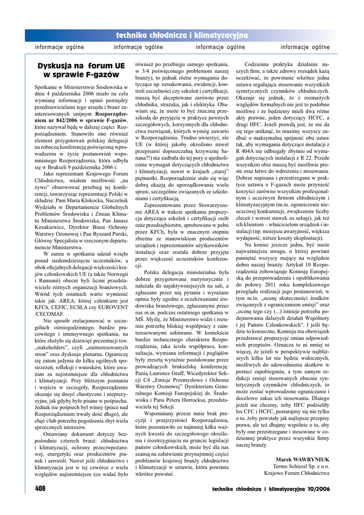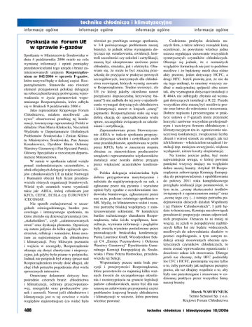 informacje ogólne informacje ogólne Dyskusja na forum UE w sprawie F-gazów Spotkanie w Ministerstwie Środowiska w dniu 4 października 2006 miało na celu wymianę informacji i opinii pomiędzy przedstawicielami tego urzędu i branż zainteresowanych unijnym Rozporządzeniem nr 842/2006 w sprawie F-gazów, które nazywał będę w dalszej części Rozporządzeniem. Stanowiło ono również element przygotowań polskiej delegacji na roboczą konferencję poświęconą wprowadzeniu w życie postanowień wspomnianego Rozporządzenia, która odbyła się w Brukseli 9 października 2006 r. Jako reprezentant Krajowego Forum Chłodnictwa, miałem możliwość „na żywo” obserwować przebieg tej konferencji, towarzysząc reprezentacji Polski w składzie: Pani Maria Kłokocka, Naczelnik Wydziału w Departamencie Globalnych Problemów Środowiska i Zmian Klimatu Ministerstwa Środowiska, Pan Janusz Kozakiewicz, Dyrektor Biura Ochrony Warstwy Ozonowej i Pan Ryszard Purski, Główny Specjalista w rzeczonym departamencie Ministerstwa. W sumie w spotkaniu udział wzięło ponad siedemdziesięciu uczestników, a obok oficjalnych delegacji większości krajów członkowskich UE (a także Norwegii i Rumunii) obecni byli liczni przedstawiciele różnych organizacji branżowych. Wśród tych ostatnich warto wymienić takie jak: AREA, której członkiem jest KFCh, CEFIC, ECSLA czy EUROVENT /CECOMAF. Nie sposób zrelacjonować w szczegółach ośmiogodzinnego, bardzo pracowitego i intensywnego spotkania, na które złożyło się dziewięć prezentacji tzw. „stakeholders”, czyli „zainteresowanych stron” oraz dyskusja plenarna. Ograniczę się zatem jedynie do kilku ogólnych spostrzeżeń, refleksji i wniosków, które uważam za najistotniejsze dla chłodnictwa i klimatyzacji. Przy bliższym poznaniu i wejściu w szczegóły, Rozporządzenie okazuje się dosyć chaotyczne i nieprecyzyjne, jak gdyby było pisane w pośpiechu. Jednak nie pośpiech był winny (prace nad Rozporządzeniem trwały dość długo), ale chęć i/lub potrzeba pogodzenia zbyt wielu sprzecznych interesów. Omawiany dokument dotyczy bezpośrednio czterech branż: chłodnictwa i klimatyzacji, ochrony przeciwpożarowej, energetyki oraz producentów pianek i aerozoli. Nawet jeśli chłodnictwo i klimatyzacja jest w tej czwórce z wielu względów najistotniejsze (co widać było 408 informacje ogólne również po przebiegu samego spotkania, w 3/4 poświęconego problemom naszej branży), to jednak różne wymagania dotyczące np. oznakowania, ewidencji, kontroli szczelności czy szkoleń i certyfikacji, muszą być akceptowane zarówno przez chłodnika, strażaka, jak i elektryka. Obawiam się, że może to być znaczną przeszkodą do przyjęcia w praktyce pewnych szczegółowych, korzystnych dla chłodnictwa rozwiązań, których wymóg zawarto w Rozporządzeniu. Trudno uwierzyć, ale UE (w której jakoby określono nawet przepisami dopuszczalną krzywiznę banana?!) nie zadbała do tej pory o ujednolicenie wymagań dotyczących chłodnictwa i klimatyzacji, nawet w krajach „starej” piętnastki. Rozporządzenie stało się więc dobrą okazją do uporządkowania wielu spraw, szczególnie związanych ze szkoleniami i certyfikacją. Zaprezentowana przez Stowarzyszenie AREA w trakcie spotkania propozycja dotycząca szkoleń i certyfikacji osób oraz przedsiębiorstw, aprobowana w pełni przez KFCh, była w znacznym stopniu zbieżna ze stanowiskiem producentów urządzeń i reprezentantów użytkowników instalacji oraz została dobrze przyjęta przez większość uczestników konferencji. Polska delegacja ministerialna była dobrze przygotowana merytorycznie i należała do najaktywniejszych na sali, a zgłaszane przez nią pytania i wyrażane opinie były zgodne z oczekiwaniami środowiska branżowego, zgłaszanymi przez nas m.in. podczas ostatniego spotkania w MŚ. Myślę, że Ministerstwo widzi i rozumie potrzebę bliskiej współpracy z zainteresowanymi sektorami. W kontekście bardzo technicznego charakteru Rozporządzenia, taka ścisła współpraca, konsultacja, wymiana informacji i poglądów były zresztą wyraźnie postulowane przez prowadzących brukselską konferencję: Panią Laurence Graff, Wicedyrektor Sekcji C4 „Emisje Przemysłowe i Ochrona Warstwy Ozonowej” Dyrektoriatu Generalnego Komisji Europejskiej ds. Środowiska i Pana Petera Horrocksa, przedstawiciela tej Sekcji. Wspomniany przeze mnie brak precyzji i przejrzystości Rozporządzenia, które pozostawiło co najmniej kilka ważnych kwestii do szczegółowego określenia i rozstrzygnięcia na gruncie legislacji państw członkowskich, może być dla nas szansą na załatwienie przynajmniej części problemów krajowej branży chłodnictwa i klimatyzacji w ustawie, która powinna wkrótce powstać. informacje ogólne Codzienna praktyka działania naszych firm, a także zdrowy rozsądek każą oczekiwać, że powstanie wkrótce jedna ustawa regulująca stosowanie wszystkich syntetycznych czynników chłodniczych. Okazuje się jednak, że z rozmaitych względów formalnych nie jest to podobno możliwe i że będziemy mieli dwa różne akty prawne, jeden dotyczący HCFC, a drugi HFC. Jeżeli prawdą jest, że nie da się tego uniknąć, to musimy wszyscy zadbać o maksymalną spójność obu ustaw tak, aby wymagania dotyczące instalacji z R 404A nie odbiegały zbytnio od wymagań dotyczących instalacji z R 22. Przede wszystkim obie muszą być możliwie proste oraz łatwe do wdrożenia i stosowania. Dobrze napisana i przestrzegana w praktyce ustawa o F-gazach może przynieść korzyści zarówno wszystkim profesjonalnym i uczciwym firmom chłodniczym i klimatyzacyjnym (m.in. ograniczenie nieuczciwej konkurencji, zwiększenie liczby zleceń i wzrost stawek za usługi), jak też ich klientom – właścicielom urządzeń i instalacji (np. mniejsza awaryjność, większa wydajność, niższe koszty eksploatacji). Na koniec jeszcze jedna, być może 
