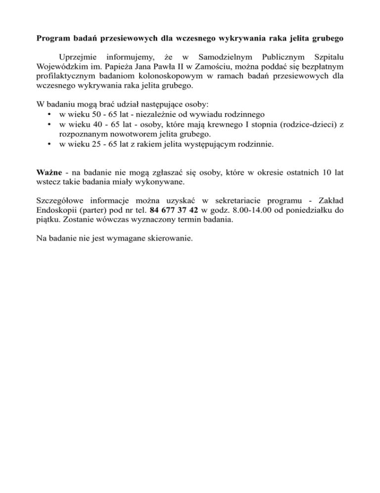 Program badań przesiewowych dla wczesnego wykrywania raka jelita grubego Uprzejmie informujemy, że w Samodzielnym Publicznym Szpitalu Wojewódzkim im. Papieża Jana Pawła II w Zamościu, można poddać się bezpłatnym profilaktycznym badaniom kolonoskopowym w ramach badań przesiewowych dla wczesnego wykrywania raka jelita grubego. W badaniu mogą brać udział następujące osoby: • w wieku 50 - 65 lat - niezależnie od wywiadu rodzinnego • w wieku 40 - 65 lat - osoby, które mają krewnego I stopnia (rodzice-dzieci) z rozpoznanym nowotworem jelita grubego. • w wieku 25 - 65 lat z rakiem jelita występującym rodzinnie. Ważne - na badanie nie mogą zgłaszać się osoby, które w okresie ostatnich 10 lat wstecz takie badania miały wykonywane. Szczegółowe informacje można uzyskać w sekretariacie programu - Zakład Endoskopii (parter) pod nr tel. 84 677 37 42 w godz. 8.00-14.00 od poniedziałku do piątku. Zostanie wówczas wyznaczony termin badania. Na badanie nie jest wymagane skierowanie.