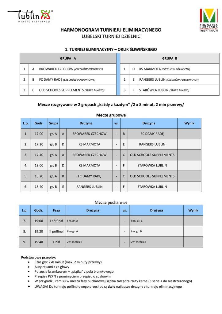 HARMONOGRAM TURNIEJU ELIMINACYJNEGO LUBELSKI TURNIEJ DZIELNIC 1. TURNIEJ ELIMINACYJNY – ORLIK ŚLIWIŃSKIEGO GRUPA A GRUPA B 1 A BROWAREK CZECHÓW (CZECHÓW PÓŁNOCNY) 1 D KS MARMOTA (CZECHÓW PÓŁNOCNY) 2 B FC DAMY RADĘ (CZECHÓW POŁUDNIOWY) 2 E RANGERS LUBLIN (CZECHÓW POŁUDNIOWY) 3 C OLD SCHOOLS SUPPLEMENTS (STARE MIASTO) 3 F STARÓWKA LUBLIN (STARE MIASTO) Mecze rozgrywane w 2 grupach „każdy z każdym” /2 x 8 minut, 2 min przerwy/ Mecze grupowe L.p. Godz. Grupa Drużyna vs. Drużyna 1. 17:00 gr. A A BROWAREK CZECHÓW - B FC DAMY RADĘ 2. 17:20 gr. B D KS MARMOTA - E RANGERS LUBLIN 3. 17:40 gr. A A BROWAREK CZECHÓW - C OLD SCHOOLS SUPPLEMENTS 4. 18:00 gr. B D KS MARMOTA - F STARÓWKA LUBLIN 5. 18:20 gr. A B FC DAMY RADĘ - C OLD SCHOOLS SUPPLEMENTS 6. 18:40 gr. B E RANGERS LUBLIN - F STARÓWKA LUBLIN Wynik Mecze pucharowe L.p. Godz. Faza Drużyna vs. Drużyna 7. 19:00 I półfinał I m. gr. A - II m. gr. B 8. 19:20 II półfinał II m gr. A - I m. gr. B 9. 19:40 Finał Zw. meczu 7 - Zw. meczu 8 Wynik Podstawowe przepisy: Czas gry: 2x8 minut (max. 2 minuty przerwy) Auty rękami z za głowy Po aucie bramkowym – „piątka” z pola bramkowego Przepisy PZPN z pominięciem przepisu o spalonym W przypadku remisu w meczu fazy pucharowej sędzia zarządza rzuty karne (3 serie + do niestrzeżonego) UWAGA! Do turnieju półfinałowego przechodzą dwie najlepsze drużyny z turnieju eliminacyjnego