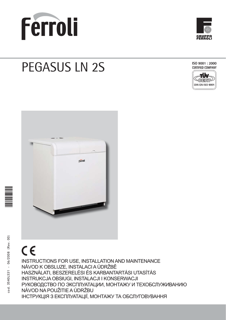 cod. 3540L531 - 06/2008 (Rev. 00) / PEGASUS LN 2S INSTRUCTIONS FOR USE, INSTALLATION AND MAINTENANCE NÁVOD K OBSLUZE, INSTALACI A ÚDRŽBċ HASZNÁLATI, BESZERELÉSI ÉS KARBANTARTÁSI UTASÍTÁS INSTRUKCJA OBSáUGI, INSTALACJI I KONSERWACJI ɊɍɄɈȼɈȾɋɌȼɈ ɉɈ ɗɄɋɉɅɍȺɌȺɐɂɂ, ɆɈɇɌȺɀɍ ɂ ɌȿɏɈȻɋɅɍɀɂȼȺɇɂɘ NÁVOD NA POUŽITIE A ÚDRŽBU ȱɇɋɌɊɍɄɐȱə Ɂ ȿɄɋɉɅɍȺɌȺɐȱȲ, ɆɈɇɌȺɀɍ ɌȺ ɈȻɋɅɍȽɈȼɍȼȺɇɇə Pegasus LN 2S 1. INSTRUKCJA UŻYCIA 1.1 Prezentacja Szanowny Kliencie, Dziękujemy za wybór kotła z podstawą Pegasus LN 2S marki FERROLI o zaawansowanym projekcie, awangardowej technologii, wysokiej niezawodności i jakości wykonania. Prosimy o uważne przeczytanie niniejszej instrukcji i o zachowanie jej w dobrym stanie na przyszłość. Pegasus LN 2S to generator ciepła o niskiej emisji NOx, służący do ogrzewania wysokiej wydajności, opalany gazem ziemnym lub LPG, zarządzany przez zaawansowany system sterowania elektronicznego. Korpus kotła składa się z elementów żeliwnych, których specjalna budowa zapewnia wysoką sprawność termiczną wymiany we wszystkich warunkach eksploatacji oraz palnika atmosferycznego z zapłonem elektronicznym i jonizacyjnym sterowaniem płomieniem. Częściowy (1-sze stadium) lub całkowity (1-sze + 2-gie stadium) zapłon palnika umożliwia uzyskanie 2 różnych poziomów mocy kotła, w zależności od potrzeby. Wyposażenie kotła obejmuje ponadto automatyczny zawór odpowietrzający, 2-stopniowy termostat regulujący oraz termostat bezpieczeństwa. Dzięki elektronicznemu systemowi zapłonu i sterowania płomieniem działanie urządzenia jest zautomatyzowane do maksimum. Użytkownik musi tylko ustawić żądaną temperaturę instalacji za pomocą termostatu regulującego. 1.2 Panel sterowniczy Aby uzyskać dostęp do panelu sterowania, należy podnieść drzwiczki przednie. Oznaczenia 1 2 3 4 5 6 7 8 Miejsce na zainstalowanie centralki termostatycznej Termomanometr kotła Pokrywa termostatu bezpieczeństwa odblokowywanego ręcznie Pokrywa termostatu spalin odblokowywanego ręcznie Przycisk odblokowujący centralkę kontrolującą płomień z kontrolką 1-sze stadium Przycisk odblokowujący centralkę kontrolującą płomień z kontrolką 2-gie stadium 2-stopniowy termostat regulujący kocioł Wyłącznik 0-1-TEST 1 2 3 4 5 6 7 8 rys. 1 1.3 Zapłon i wyłączanie Zapłon • • • • Otworzyć zawór gazu przed kotłem. Zamknąć ewentualny wyłącznik lub włożyć wtyczkę przed kotłem Ustawić pokrętło wyłącznika “8” na pozycję 1 (rys.1). Ustawić pokrętło “7” na wybranej temperaturze, ewentualnie pokrętło termostatu pokojowego na żądanej wartości temperatury. W tym momencie palnik zapala się i kocioł rozpoczyna pracę automatyczną, sterowaną przez urządzenia regulacyjne i zabezpieczenia. • Jeżeli kocioł wyposażony jest w elektroniczną centralkę termostatyczną zamontowaną w pozycji 1 (rys. 1), użytkownik musi również przestrzegać instrukcji podanych przez jej producenta. Jeśli po prawidłowym przeprowadzeniu zapłonu, palniki się nie zapalają i zapalają się przyciski-kontrolki “5 i 6”, odczekać około 15 sekund i wcisnąć ponownie te przyciski. Odblokowane centralki kontrolujące płomień powtórzą wówczas cykl zapłonu. Jeśli po kilku próbach palniki nadal się nie zapalają, przeczytać paragraf "Usterki". W przypadku wyłączenia zasilania elektrycznego kotła podczas jego działania palniki zgasną i zapalą się automatycznie po przywróceniu napięcia w sieci. PL Kod 3540L531 - 06/2008 (Wer. 00) 59 Pegasus LN 2S Wyłączanie Zamknąć zawór gazu przed kotłem, ustawić pokrętło “8” na pozycję 0 i odłączyć zasilanie elektryczne urządzenia. Przy dłuższych wyłączeniach w okresie zimowym, aby uniknąć uszkodzeń spowodowanych zamarznięciem, zaleca się spuszczenie całej wody z kotła, zarówno z obiegu c.w.u. jak i c.o.; lub zastosować w instalacji grzewczej specjalny zestaw chroniący przed zamarzaniem. Wyłącznik kotła 8 posiada 3 pozycje: “0-1-TEST”; dwie pierwsze służą do włączania i wyłączania, natomiast trzecia, którą można zainstalować, używana jest wyłącznie podczas serwisowania i konserwacji. 1.4 Regulacje Regulacja temperatury instalacji Obrócić pokrętło regulacji temperatury ogrzewania 7 (rys. 1) zgodnie z kierunkiem ruchu wskazówek zegara, aby zwiększyć temperaturę ogrzewania lub w kierunku przeciwnym do ruchu wskazówek zegara, aby ją zmniejszyć. Wartość temperatury można zmieniać w przedziale od min. 30° do maks. 90°. Zaleca się jednak unikanie pracy kotła przy temperaturze poniżej 45 °C. Regulacja temperatury otoczenia (z opcjonalnym termostatem pokojowym) Ustawić za pomocą termostatu pokojowego żądaną temperaturę w pomieszczeniach. Na polecenie z termostatu pokojowego kocioł włącza się i doprowadza wodę w instalacji do temperatury ustawionej na termostacie regulacyjnym kotła 7 (rys. 1). Po osiągnięciu żądanej temperatury w pomieszczeniach generator wyłącza się. Jeśli nie ma termostatu pokojowego, kocioł utrzymuje w instalacji temperaturę ustawioną na termostacie regulującym kotła. Regulacja ciśnienia hydraulicznego instalacji Ciśnienie napełniania przy zimnej instalacji, odczytywane na wodowskazie kotła cz. 2, rys.1, powinno wynosić około 1,0 bar. Jeśli podczas działania ciśnienie instalacji spadnie (z powodu parowania gazów rozpuszczonych w wodzie) poniżej wartości minimalnej podanej powyżej, Użytkownik musi przywrócić jego wartość początkową za pomocą zaworu napełniania. Po wykonaniu tej czynności należy zawsze zamknąć zawór napełniania. 1.5 Usterki Poniżej podano anomalie, które mogą być spowodowane przez banalne przyczyny i które może usunąć sam użytkownik. Symbol Usterka Rozwiązanie Sprawdzić, czy zawory gazu przed kotłem i na gazomierzu są otwarte. Kocioł zablokowany